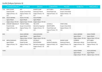 Grafik [Sołtysa Dytmara 3] PONIEDZIAŁEK 7:30 8:00 8:30 WTOREK ŚRODA CZWARTEK PIĄTEK BODY SHAPE ABT ENERGY JUMP KETTLEBELL BRZUCHOMANIA Paweł Kordek Kacper Zmarzliński Katarzyna Nazim Paula Mularczyk Kacper Zmarzliński Zajęcia Fitness / 55 Zajęcia Fitness / 55 Zajęcia Fitness / 55 Zajęcia Fitness / 55 Zajęcia Fitness / 55 min min min min min AQUA AEROBIC AQUA CYCLING AQUA POWER Agata Wójcik Agata Wójcik Agata Wójcik Zajęcia Aqua / 45 min Zajęcia Aqua / 45 min Zajęcia Aqua / 45 min ZDROWY KRĘGOSŁUP TRX/KETTLEBELL TBC+STEP LES MILLS STRETCHING Paweł Kordek Kacper Zmarzliński Marcelina Augustyn BODYPUMP® Kacper Zmarzliński Zajęcia Fitness / 55 Zajęcia Fitness / 55 Zajęcia Fitness / 55 Paula Mularczyk Zajęcia Fitness / 55 min min min Zajęcia Fitness / 55 min SOBOTA NIEDZIELA min 9:00 9:30 AQUA AEROBIC AQUA JOGGING AQUA AEROBIC AQUA POWER Agata Wójcik Agata Wójcik Agata Wójcik Agata Wójcik Zajęcia Aqua / 45 min Zajęcia Aqua / 45 min Zajęcia Aqua / 45 min Zajęcia Aqua / 45 min BRZUCHOMANIA STRETCHING LES MILLS PILATES ENERGY JUMP ZUMBA® KETTLEBELL Agata Wójcik Paweł Kordek BODYPUMP® Natalia Przybylska Katarzyna Nazim Aleksandra Lebryk Paula Mularczyk Zajęcia Fitness / 55 Zajęcia Fitness / 55 Marcelina Augustyn Zajęcia Fitness / 55 Zajęcia Fitness / 55 Zajęcia Fitness / 55 Zajęcia Fitness / 55 min min Zajęcia Fitness / 55 min min min min AQUA POWER AQUA JOGGING Agata Wójcik Agata Wójcik Zajęcia Aqua / 45 min Zajęcia Aqua / 45 min min 10:00 SPINNING® INTERWAŁ BEZTLENOWY Platinium Team Zajęcia Spinning / 55 min 10:30 STRETCHING TBC+STEP STRETCHING BODY SHAPE ABT ABT BODY SHAPE Agata Wójcik Paweł Kordek Agata Wójcik Natalia Przybylska Katarzyna Nazim Paula Mularczyk Paula Mularczyk Zajęcia Fitness / 55 Zajęcia Fitness / 55 Zajęcia Fitness / 55 Zajęcia Fitness / 55 Zajęcia Fitness / 55 Zajęcia Fitness / 55 Zajęcia Fitness / 55 min min min min min min min AQUA CYCLING SPINNING® Agata Wójcik WYTRZYMAŁOŚĆ Zajęcia Aqua / 45 min Platinium Team 11:00 Zajęcia Spinning / 55 min 11:30 LES MILLS STRETCHING BODYPUMP® Agata Wójcik Paula Mularczyk Zajęcia Fitness / 55 Zajęcia Fitness / 55 min min 15:00 AQUA AEROBIC Małgorzata Boryczka Zajęcia Aqua / 45 min 15:30 PILATES ZDROWY KRĘGOSŁUP ABT BRZUCHOMANIA BOSU Natalia Przybylska Przemysław Kacper Zmarzliński Przemysław Przemysław Widyna Zajęcia Fitness / 55 Urbańczyk Zajęcia Fitness / 55 Urbańczyk Zajęcia Fitness / 55 min Zajęcia Fitness / 55 min Zajęcia Fitness / 55 min min min 16:00 AQUA JOGGING AQUA POWER AQUA AEROBIC AQUA JOGGING AQUA CYCLING Małgorzata Boryczka Agata Wójcik Małgorzata Boryczka Marzena Kowalska Paweł Kordek Zajęcia Aqua / 45 min Zajęcia Aqua / 45 min Zajęcia Aqua / 45 min Zajęcia Aqua / 45 min Zajęcia Aqua / 45 min TRX STRETCHING ZDROWY KRĘGOSŁUP BODY ART® ENERGY JUMP Przemysław Widyna Przemysław Kacper Zmarzliński Przemysław Przemysław Widyna Paweł Kordek Zajęcia Fitness / 55 Urbańczyk Zajęcia Fitness / 55 Urbańczyk Zajęcia Fitness / 55 Zajęcia Fitness / 55 min Zajęcia Fitness / 55 min Zajęcia Fitness / 55 min min 16:30 BOSU min 17:00 AQUA POWER min AQUA CYCLING AQUA CYCLING AQUA AEROBIC AQUA POWER Agata Wójcik Agata Wójcik Małgorzata Boryczka Marzena Kowalska Paweł Kordek Zajęcia Aqua / 45 min Zajęcia Aqua / 45 min Zajęcia Aqua / 45 min Zajęcia Aqua / 45 min Zajęcia Aqua / 45 min PILATES KETTLEBELL PLATINIUM INSANITY TRX/KETTLEBELL BRZUCHOMANIA GT SPECJAL Przemysław Widyna Piotr Gortat Karolina Ciurka-Baster Paweł Kordek Marcelina Augustyn Paweł Kordek Marcin Cygnarowicz Zajęcia Fitness / 55 Zajęcia Fitness / 55 Zajęcia Fitness / 55 Zajęcia Fitness / 55 Zajęcia Fitness / 55 Zajęcia Fitness / 55 Zajęcia Fitness / 55 min min min min min min min AQUA JOGGING AQUA POWER AQUA CYCLING AQUA JOGGING Agata Wójcik Agata Wójcik Paweł Kordek Agata Wójcik Paweł Kordek Zajęcia Aqua / 45 min Zajęcia Aqua / 45 min Zajęcia Aqua / 45 min Zajęcia Aqua / 45 min Zajęcia Aqua / 45 min 17:30 STRETCHING/BAX 18:00 AQUA CYCLING SPINNING® SIŁA SPINNING® SPINNING® Krzysztof Stawarz INTERWAŁ TLENOWY WYTRZYMAŁOŚĆ Zajęcia Spinning / 55 Krzysztof Stawarz Grażyna Bartosik min Zajęcia Spinning / 55 Zajęcia Spinning / 55 min min 18:30 ZUMBA® KETTLEBELL TRX ENERGY JUMP LES MILLS Aleksandra Lebryk Piotr Gortat Karolina Ciurka-Baster Paweł Kordek BODYPUMP® Zajęcia Fitness / 55 Zajęcia Fitness / 55 Zajęcia Fitness / 55 Zajęcia Fitness / 55 Marcelina Augustyn min min min min Zajęcia Fitness / 55 min 19:00 AQUA AEROBIC AQUA CYCLING AQUA JOGGING AQUA POWER AQUA AEROBIC Karolina Więckowska Paweł Kordek Paweł Kordek Agata Wójcik Agata Wójcik Zajęcia Aqua / 45 min Zajęcia Aqua / 45 min Zajęcia Aqua / 45 min Zajęcia Aqua / 45 min Zajęcia Aqua / 45 min SPINNING® SPINNING® SPINNING® SPINNING® WYTRZYMAŁOŚĆ INTERWAŁ TLENOWY INTERWAŁ WYTRZYMAŁOŚĆ Krzysztof Stawarz Grażyna Bartosik BEZTLENOWY Urszula Fijałkowska Zajęcia Spinning / 55 Zajęcia Spinning / 55 Krzysztof Stawarz Zajęcia Spinning / 55 min min Zajęcia Spinning / 55 min min 19:30 BODY POWER BODY SHAPE BRZUCHOMANIA PUMP TBC+STEP Natalia Przybylska Marzena Kowalska Marcelina Augustyn Kacper Zmarzliński Katarzyna Szaban Zajęcia Fitness / 55 Zajęcia Fitness / 55 Zajęcia Fitness / 55 Zajęcia Fitness / 55 Zajęcia Fitness / 55 min min min min min AQUA POWER AQUA CYCLING AQUA JOGGING AQUA POWER Karolina Więckowska Paweł Kordek Paweł Kordek Agata Wójcik Agata Wójcik Zajęcia Aqua / 45 min Zajęcia Aqua / 45 min Zajęcia Aqua / 45 min Zajęcia Aqua / 45 min Zajęcia Aqua / 45 min SPINNING® SPINNING® SPINNING® SPINNING® INTERWAŁ INTERWAŁ WYTRZYMAŁOŚĆ INTERWAŁ TLENOWY BEZTLENOWY BEZTLENOWY Krzysztof Stawarz Urszula Fijałkowska Krzysztof Stawarz Grażyna Bartosik Zajęcia Spinning / 55 Zajęcia Spinning / 55 Zajęcia Spinning / 55 Zajęcia Spinning / 55 min min min min BRZUCHOMANIA LES MILLS STRETCHING BRZUCHOMANIA BODYPUMP® Marzena K