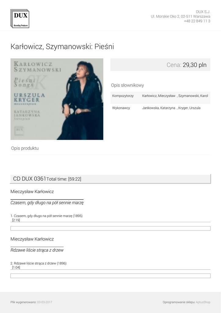 DUX S.J. Ul. Morskie Oko 2, 02-511 Warszawa +48 22 849 11 3 Karłowicz, Szymanowski: Pieśni Cena: 29,30 pln Opis słownikowy Kompozytorzy Karłowicz, Mieczysław ∎, Szymanowski, Karol ∎ Wykonawcy Jankowska, Katarzyna ∎, Kryger, Urszula ∎ Opis produktu CD DUX 0361Total time: [59:22] Mieczysław Karłowicz Czasem, gdy długo na pół sennie marzę 1. Czasem, gdy długo na pół sennie marzę (1895) [2:19] Mieczysław Karłowicz Rdzawe liście strąca z drzew 2. Rdzawe liście strąca z drzew (1896) [1:04] Plik wygenerowano: 03-03-2017 Oprogramowanie sklepu: AptusShop DUX S.J. Ul. Morskie Oko 2, 02-511 Warszawa +48 22 849 11 3 Mieczysław Karłowicz Smutną jest dusza moja op. 1 nr 6 3. Smutną jest dusza moja op. 1 nr 6 [2:16] Mieczysław Karłowicz Z erotyków op. 3 nr 2 4. Z erotyków op. 3 nr 2 [1:10] Mieczysław Karłowicz Nie płacz nade mną op. 3 nr 7 5. Nie płacz nade mną op. 3 nr 7 [2:00] Mieczysław Karłowicz Idzie na pola op. 3 nr 3 6. Idzie na pola op. 3 nr 3 [1:11] Mieczysław Karłowicz Na śniegu op. 1 nr 3 7. Na śniegu op. 1 nr 3 [2:09] Mieczysław Karłowicz Plik wygenerowano: 03-03-2017 Oprogramowanie sklepu: AptusShop DUX S.J. Ul. Morskie Oko 2, 02-511 Warszawa +48 22 849 11 3 Po szerokim morzu op. 3 nr 9 8. Po szerokim morzu op. 3 nr 9 [2:13] Mieczysław Karłowicz Skąd pierwsze gwiazdy op. 1 nr 2 9. Skąd pierwsze gwiazdy op. 1 nr 2 [1:31] Mieczysław Karłowicz Zaczarowana królewna op. 3 nr 10 10. Zaczarowana królewna op. 3 nr 10 [2:56] Karol Szymanowski Święty Boże op. 5 nr 1 11. Święty Boże [7:35] Karol Szymanowski Jestem i płaczę op. 5 nr 2 12. Jestem i płaczę [5:32] Karol Szymanowski Moja pieśń wieczorna Plik wygenerowano: 03-03-2017 Oprogramowanie sklepu: AptusShop DUX S.J. Ul. Morskie Oko 2, 02-511 Warszawa +48 22 849 11 3 13. Moja pieśń wieczorna [5:38] Karol Szymanowski Wschód słońca (z Pieśni do słów Dymitra Dawydowa op. 32) 14. Wschód słońca [2:09] Karol Szymanowski Bezgwiezdne niebo (z Pieśni do słów Dymitra Dawydowa op. 32) 15. Bezgwiezdne niebo [1:55] Karol Szymanowski Jesienne słońce (z Pieśni do słów Dymitra Dawydowa op. 32) 16. Jesienne słońce [2:54] Karol Szymanowski Tak jestem smętny (z pieśni do słów Tadeusza Micińskiego op. 11) 17. Tak jestem smętny [3:33] Karol Szymanowski W zaczarowanym lesie (z pieśni do słów Tadeusza Micińskiego op. 11) 18. W zaczarowanym lesie [2:53] Plik wygenerowano: 03-03-2017 Oprogramowanie sklepu: AptusShop DUX S.J. Ul. Morskie Oko 2, 02-511 Warszawa +48 22 849 11 3 Karol Szymanowski Nade mną leci w szafir morza (z pieśni do słów Tadeusza Micińskiego op. 11) 19. Nade mną leci w szafir morza [1:48] Karol Szymanowski Rycz, burzo! (z pieśni do słów Tadeusza Micińskiego op. 11) 20. Rycz, burzo! [3:09] Karol Szymanowski Łabędź op. 7 (do słów Wacława Berenta) 21. Łabędź do słów Wacława Berenta op. 7 [3:23] Wykonawcy: Katarzyna Jankowska /fortepian/ Urszula Kryger /mezzosopran/ Plik wygenerowano: 03-03-2017 Powered by TCPDF (www.tcpdf.org) Oprogramowanie sklepu: AptusShop