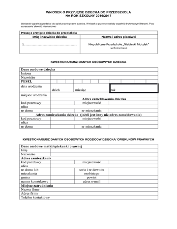 WNIOSEK O PRZYJĘCIE DZIECKA DO PRZEDSZKOLA NA ROK SZKOLNY 2016/2017 (Wniosek wypełniają rodzice lub opiekunowie prawni dziecka. Wniosek o przyjęcie należy wypełnić drukowanymi literami. Przy oznaczeniu' skreślić niewłaściwe) Proszę o przyjęcie dziecka do przedszkola Imię i nazwisko dziecka Nazwa i adres placówki 1. …............................................................ Niepubliczne Przedszkole „Niebieski Motylek” w Rzeszowie KWESTIONARIUSZ DANYCH OSOBOWYCH DZIECKA Dane osobowe dziecka Imiona Nazwisko PESEL data urodzenia dzień miesiąc rok miejsce urodzenia Adres zameldowania dziecka miejscowość kod pocztowy ulica nr domu nr mieszkania Adres zamieszkania dziecka (jeżeli jest inny niż adres zameldowania) kod pocztowy miejscowość ulica nr domu nr mieszkania KWESTIONARIUSZ DANYCH OSOBOWYCH RODZICOW DZIECKA/ OPIEKUNÓW PRAWNYCH Dane osobowe matki/opiekunki prawnej Imię Nazwisko Adres zamieszkania kod pocztowy miejscowość ulica nr domu lub seria i nr dowodu mieszkania osobistego gmina powiat numer komórkowy adres e-mail Miejsce zatrudnienia Nazwa firmy Adres firmy Telefon kontaktowy Dane osobowe ojca /opiekuna prawnego Imię Nazwisko Adres zamieszkania kod pocztowy miejscowość ulica nr domu lub seria i nr dowodu mieszkania osobistego gmina powiat numer komórkowy adres e-mail Miejsce zatrudnienia Nazwa firmy Adres firmy Telefon kontaktowy INNE OSOBY UPOWAŻNIONE DO ODBIORU DZIECKA Dane osobowe Imię Nazwisko PESEL Seria i numer dowodu osobistego Zgoda na przetwarzanie danych osobowych w celu weryfikacji tożsamości w przedszkolu TAK NIE Dane osobowe Imię Nazwisko PESEL Seria i numer dowodu osobistego Zgoda na przetwarzanie danych osobowych w celu weryfikacji tożsamości w przedszkolu TAK NIE INFORMACJE O DZIECKU Informacje o stanie zdrowia dziecka mogące mieć znaczenie podczas pobytu dziecka w przedszkolu (alergie, chordy przewlekłe) …................................................................................................................................................................................. ..................................................................................................................................................................................... ............................................................................................................................. ................................................... INNE PRZEDSZKOLA DO KTÓRYCH DODATKOWO SKŁADANO PODANIE O PRZYJĘCIE DZIECKA NA ROK SZKOLNY 2016/2017 Lp. 1. 2. 3. Nazwa i adres placówki Decyzja w sprawie uczęszczania dziecka do przedszkola: 1. Dziecko rozpocznie uczęszczanie do placówki od …………………………, w grupie …………..……. Wypełniają rodzice dzieci czteroletnich które rozpoczną naukę w szkole jako sześciolatki Zgodnie z nowelizacją Ustawy z dnia 7 września 1991 r. o systemie oświaty. (Dz. U. z 2015 r. poz. 2156 oraz z 2016 r. poz. 35 i 64), na wniosek rodziców naukę w szkole podstawowej może także rozpocząć dziecko, które w danym roku kalendarzowym kończy 6 lat. W związku z powyższym bardzo proszę o wypełnienie poniższej deklaracji, czy dziecko rozpocznie naukę jako sześciolatek. Bardzo proszę w roku szkolnym 20016/2017 zapisać moje dziecko …………….………………………..….. do „zerówki” (roczne przygotowanie szkolne) gdyż naszą decyzją rozpocznie ono naukę w szkole podstawowej jako sześciolatek. data podpis matki/opiekunki prawnej podpis ojca! opiekuna prawnego …………………………………….............................. …………………………………………………………. Zobowiązuję się do bieżącej aktualizacji powyższych informacji. Informacje dotyczące danych osobowych dziecka, jego rodziny oraz osób upoważnionych do odbioru dziecka z przedszkola zgodnie z paragrafem 24 Rozporządzenia Ministra Edukacji Narodowej i Sportu z dnia 19 lutego 2002r. w prawie sposobu prowadzenia przez publiczne przedszkola, szkoły i placówki dokumentacji przebiegu nauczania, działalności wychowawczej i opiekuńczej oraz rodzajów tej dokumentacji (Dz.U.Nr 23, poz. 225 ze zmianami) są zebrane w celu szybkiego kontaktu w nagłych okolicznościach oraz poznania sytuacji rodzinnej dziecka. Są udostępnione tylko nauczycielom przedszkola, którzy są zobowiązani do zachowania tajemnicy służbowej, oraz przekazywane do Wydziału Oświaty. Na zebranie powyższych danych o dziecku i jego rodzinie wyrażam zgodę. data podpis matki/opiekunki prawnej …………………………………….............................. podpis ojca! opiekuna prawnego ………………………………………………………….