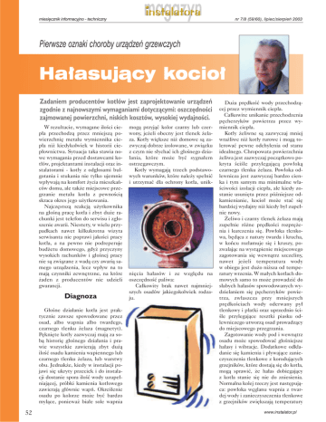 miesi´cznik informacyjno - techniczny nr 7/8 (59/60), lipiec/sierpieƒ 2003 Pierwsze oznaki choroby urzàdzeƒ grzewczych Ha∏asujàcy kocio∏ Zadaniem producentów kot∏ów jest zaprojektowanie urzàdzeƒ zgodnie z najnowszymi wymaganiami dotyczàcymi: oszcz´dnoÊci zajmowanej powierzchni, niskich kosztów, wysokiej wydajnoÊci. W rezultacie, wymagane iloÊci ciep∏a przechodzà przez mniejszà powierzchni´ metalu wymiennika ciep∏a ni˝ kiedykolwiek w historii ciep∏ownictwa. Sytuacja taka stawia nowe wymagania przed dostawcami kot∏ów, projektantami instalacji oraz instalatorami - kot∏y z odg∏osami bulgotania i stukania nie tylko ujemnie wp∏ywajà na komfort ˝ycia mieszkaƒców domu, ale tak˝e miejscowe przegrzanie metalu kot∏a z pewnoÊcià skraca okres jego u˝ytkowania. Najcz´stszà reakcjà u˝ytkownika na g∏oÊnà prac´ kot∏a i zbyt du˝e rachunki jest telefon do serwisu i zg∏oszenie awarii. Niestety, w wielu przypadkach nawet kilkukrotna wizyta serwisanta nie poprawi jakoÊci pracy kot∏a, a na pewno nie podreperuje bud˝etu domowego, gdy˝ przyczyny wysokich rachunków i g∏oÊnej pracy nie sà zwiàzane z wadà czy awarià samego urzàdzenia, lecz wp∏yw na to majà czynniki zewn´trzne, na które ˝aden z producentów nie udzieli gwarancji. Diagnoza G∏oÊne dzia∏anie kot∏a jest praktycznie zawsze spowodowane przez osad, albo wapnia albo twardego, czarnego tlenku ˝elaza (magnetyt). P´kni´te kot∏y zazwyczaj majà za sobà histori´ g∏oÊnego dzia∏ania i prawie wszystkie zawierajà zbyt du˝à iloÊç osadu kamienia wapiennego lub czarnego tlenku ˝elaza, lub warstwy obu. Jednak˝e, kiedy w instalacji pojawi si´ ukryty przeciek i do instalacji dostanie spora iloÊç wody uzupe∏niajàcej, próbki kamienia kot∏owego zawierajà g∏ównie wapƒ. OkreÊlenie osadu po kolorze mo˝e byç bardzo mylàce, poniewa˝ bia∏e sole wapnia 52 mogà przyjàç kolor czarny lub czerwony, je˝eli obecny jest tlenek ˝elaza. Kot∏y wi´ksze ni˝ domowe sà zazwyczaj dobrze izolowane, w zwiàzku z czym nie s∏ychaç ich g∏oÊnego dzia∏ania, które mo˝e byç sygna∏em ostrzegawczym. Kot∏y wymagajà trzech podstawowych warunków, które nale˝y spe∏niç i utrzymaç dla ochrony kot∏a, unik- ni´cia ha∏asów i ze wzgl´du na oszcz´dnoÊç paliwa: Ca∏kowity brak nawet najmniejszych osadów jakiegokolwiek rodzaju. Du˝a pr´dkoÊç wody przechodzàcej przez wymiennik ciep∏a. Ca∏kowite unikanie przechodzenia p´cherzyków powietrza przez wymiennik ciep∏a. Kot∏y ˝eliwne sà zazwyczaj mniej wra˝liwe ni˝ kot∏y rurowe i mogà tolerowaç pewne odchylenia od stanu idealnego. Chropowata powierzchnia ˝eliwa jest zazwyczaj poczàtkowo pokryta ÊciÊle przylegajàcà pow∏okà czarnego tlenku ˝elaza. Pow∏oka odlewnicza jest zazwyczaj bardzo cienka i tym samym ma minimalne w∏aÊciwoÊci izolacji ciep∏a, ale kiedy zostanie usuni´ta przez póêniejsze odkamienianie, kocio∏ mo˝e staç si´ bardziej wydajny ni˝ kiedy by∏ zupe∏nie nowy. ˚eliwo i czarny tlenek ˝elaza majà zupe∏nie ró˝ne pr´dkoÊci rozpr´˝enia i kurczenia si´. Pow∏oka tlenkowa, b´dàca z natury twarda i krucha, w koƒcu roz∏amuje si´ i kruszy, pozwalajàc na wystàpienie miejscowego zagotowania si´ wewnàtrz szczeliny, nawet je˝eli temperatura wody w obiegu jest du˝o ni˝sza od temperatury wrzenia. W ma∏ych kot∏ach domowych samo to mo˝e prowadziç do s∏abych ha∏asów spowodowanych wydzielaniem si´ p´cherzyków powietrza, zw∏aszcza przy mniejszych pr´dkoÊciach wody oderwany py∏ tlenkowy i p∏atki oraz uprzednio ÊciÊle przylegajàce resztki piasku odlewniczego utworzà osad prowadzàcy do miejscowego przegrzania. Zagotowanie wody pod i wewnàtrz osadu mo˝e spowodowaç g∏oÊniejsze ha∏asy i wibracje. Dodatkowe odk∏adanie si´ kamienia i p∏ywajàce zanieczyszczenia tlenkowe z korodujàcych grzejników, które dostajà si´ do kot∏a, mogà sprawiç, ˝e ha∏as dobiegajàcy z kot∏a stanie si´ nie do zniesienia. Normalna kolej rzeczy jest nast´pujàca: pow∏oka w´glanu wapnia z twardej wody i zanieczyszczenia tlenkowe z grzejników zwi´kszajà temperatury www.instalator.pl miesi´cznik informacyjno - techniczny metalu kot∏a. Pow∏oka kot∏a i piasek odrywajà si´ i tworzà cz´Êç kamienia i osad. Takie warunki przyczyniajà si´ do uszkodzenia kot∏a, je˝eli instalacja nie jest chroniona. Kot∏y rurowe (domowe) sà czasami opisywane jako „kot∏y o niskiej zawartoÊci wody“. Ich konstrukcja mo˝e byç tak˝e rozpatrywana jako kontynuacja rur instalacji cieplnej, odpowiednio dopasowanych, z ˝eberkami absorbujàcymi ciep∏o, palnikiem i urzàdzeniem sterujàcym. Wi´kszoÊç kot∏ów tego typu jest produkowana z cienkiej warstwy miedzi o wysokiej przewodnoÊci cieplnej. Dodatkowe fragmenty miedzi sà nak∏adane we wn´trzu kot∏a dla dalszego poprawienia absorpcji ciep∏a lub w celu rozproszenia ca∏kowitej iloÊci przyjmowanego ciep∏a na wi´kszà powierzchni´ metalu. Inne kot∏y majà wk∏adki w celu osiàgni´cia wi´kszego stopnia turbulencji wody, a tak˝e w celu uzyskania maksymalnej absorpcji ciep∏a, tj. wysokiej wydajnoÊci, je˝eli chodzi o podstawowy projekt. Wiele kot∏ów o niskiej zawartoÊci wody jest produkowanych z aluminium. SzybkoÊç przekazywania ciep∏a jest wprost proporcjonalna do przewodnoÊci cieplnej powierzchni przekazujàcych ciep∏o. ObecnoÊç zarówno mi´kkiego, jak i twardego kamienia na powierzchniach wymiany ciep∏a mo˝e wi´c znacznie obni˝aç pr´dkoÊç przekazywania ciep∏a przy temperaturach gazu spalinowego rosnàcych wprost proporcjonalnie. Problem dotyczy g∏ównie kot∏a, ale osady w grzejnikach i rurach tak˝e zmniejszajà wydajnoÊç ca∏ej instalacji - cz´sto bardziej zauwa˝alnie. Cenny przyk∏ad Podczas badania domowej instalacji centralnego ogrzewania, ze szczególnie g∏oÊno dzia∏ajàcym kot∏em, stwierdzono nas