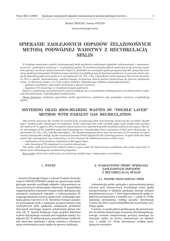 Prace IM¯ 3 (2009) Spiekanie zaolejonych odpadów ¿elazonoœnych metod¹ podwójnej warstwy... 5 Marian NIESLER, Janusz STECKO Instytut Metalurgii ¯elaza SPIEKANIE ZAOLEJONYCH ODPADÓW ¯ELAZONOŒNYCH METOD¥ PODWÓJNEJ WARSTWY Z RECYRKULACJ¥ SPALIN W artykule omówiono wyniki wariantowych prób spiekania zaolejonych odpadów ¿elazonoœnych z zastosowaniem tzw. „podwójnej warstwy” i recyrkulacji spalin. W zrealizowanych próbach spiekania przy zmiennej wysokoœci górnej warstwy i sta³ej zawartoœci oleju 1%, oko³o 30% zawracanych spalin przyjmowa³y obie po³¹czone warstwy spiekanej mieszanki. Podstawowymi zaletami zmodyfikowanej technologii spiekania s¹ znacznie ni¿sze emisje do atmosfery py³u oraz spalin a w szczególnoœci CO, NOx i SO2. Czynnikiem niekorzystnym by³ wzrost zawartoœci FeO w spieku, spowodowany miêdzy innymi zwiêkszon¹ iloœci¹ paliwa dostarczon¹ do procesu spiekania, mimo ¿e obni¿eniu uleg³o o 1,5–3,5% zu¿ycie koksiku. Dodatkowym Ÿród³em ciep³a by³o bowiem: – spalanie produktów olejowych zawartych w górnej warstwie, – dopalenie CO zawartego w recyrkulowanych spalinach. Spiek ze zwiêkszon¹ zawartoœci¹ FeO gorzej redukuje siê w warunkach wielkiego pieca, ale jednoczeœnie wykazuje korzystniejsz¹ wytrzyma³oœæ mechaniczn¹. S³owa kluczowe: zaolejona zgorzelina, mu³ki zgorzelinowe, spiekanie rud, podwójna warstwa, recyrkulacja spalin SINTERING OILED IRON-BEARING WASTES BY ”DOUBLE LAYER” METHOD WITH EXHAUST GAS RECIRCULATION This article discusses the results of variant tests of sintering oiled iron-bearing wastes by the so-called “double layer” method with exhaust gas recirculation. In the sintering tests with variable upper layer height and constant oil content of 1%, approx. 30% of recycled exhaust gases were absorbed by both combined sintered mix layers. The basic advantages of the modified sintering technology are considerably lower emissions of dust and exhaust gas, in particular CO, NOx i SO2, into the atmosphere. The disadvantageous factor was the increase in FeO content in sinter caused, among other things, by the increased amount of fuel supplied to the sintering process, in spite of the fact that quick coke consumption was reduced by 1.5-3.5%, because the additional source of heat was: – combustion of oil products contained in the upper layer, – after-burning of CO contained in recycled exhaust gas. The sinter with increased FeO content reduces worse under the blast furnace conditions, but at the same time it shows more advantageous mechanical properties. Key words: oiled scale, mill-scale, ore sintering, double layer, exhaust gas recirculation 1. WSTÊP 2. WARIANTOWE PRÓBY SPIEKANIA ZAOLEJONYCH ODPADÓW Z RECYRKULACJ¥ SPALIN Instytut Metalurgii ¯elaza w ramach Projektu Rozwojowego nr 0394/R/2/T02/06/01 podj¹³ siê opracowania ekologicznego sposobu recyklingu odpadów ¿elazonoœnych zanieczyszczonych substancjami olejowymi. W poprzednich etapach projektu wykonano wstêpne próby spiekania ¿elazonoœnych zaolejonych odpadów z wykorzystaniem filtruj¹cego dzia³ania warstwy spieku (tzw. technologia spiekania górnej warstwy) [1-3]. Okreœlono wstêpne parametry prowadzenia prób, a nastêpnie przeprowadzono seriê wariantowych prób spiekania zaolejonych produktów ubocznych zmieniaj¹c moment za³adowania górnej warstwy [4]. W ramach kolejnego etapu projektu dokonano wyboru optymalnego wariantu pod wzglêdem emisji i wydajnoœci [5]. W niniejszej pracy przedstawiono wyniki badañ dotycz¹ce spiekania z górn¹ warstw¹ z równoczesnym zawracaniem czêœci spalin do procesu spiekania. 2.1. SPOSÓB PROWADZENIA PRÓB Laboratoryjne próby spiekania z zastosowaniem górnej warstwy przy równoczesnej recyrkulacji czêœci spalin przeprowadzono w uk³adzie spiekania, którego schemat przedstawiono na rys. 1. Iloœæ doprowadzanych spalin regulowano przepustnic¹ w kominie (rys. 1, punkt 5). Próby spiekania prowadzono wed³ug sposobu okreœlonego w pracy [3], który zosta³ zmodyfikowany na potrzeby recyklingu spalin. Ustalono, ¿e punkt poboru próbek gazu, dla potrzeb analizy ich sk³adu chemicznego za pomoc¹ chromatografu gazowego, zostanie umiejscowiony powy¿ej ruroci¹gu zawracania spalin na króæcu pomiarowym na kominie (rys. 1, punkt 11). Próby prowadzono wed³ug nastêpuj¹cych wariantów. 6 Marian Niesler, Janusz Stecko Prace IM¯ 3 (2009) 1. 2. 3. 4. 5. 6. 7. 8. 9. 10. 11. Misa spiekalnicza Miejsca poboru spalin do analizy Odpylnik cyklonowy Kryzy pomiarowe Przepustnice W1, W2 – wentylatory odci¹gu spalin Przewód doprowadzenia powietrza, Pomiar przep³ywu powietrza Ko³pak przewodu doprowadzania spalin na misê Pomiar temperatury spalin Komin Króciec pomiarowy Rys. 1. Schemat laboratoryjnego uk³adu spiekania z recyrkulacj¹ spalin Fig. 1. Diagram of laboratory sintering system with exhaust gas recirculation 2.2. WARIANT PORÓWNAWCZY – SPIEK PORÓWNAWCZY Mieszankê porównawcz¹ zestawiono wg receptury przedstawionej w tablicy 1. Mieszankê spiekano tradycyjnie na misie spiekalniczej o wysokoœci warstwy 550 mm (I warstwa podstawowa). z³o¿ona z mieszanki spiekalniczej i zaolejonych mu³ków zgorzelinowych (II warstwa). Warstwa tej mieszaniny o gruboœci 20 mm jest zapalana palnikiem pieca zap³onowego. Obydwie warstwy spiekane s¹ nastêpnie z zastosowaniem recyrkulacji spalin. Wariant II Jak w wariancie I. Wysokoœæ II warstwy wynosi³a – 30 mm. Wariant I Standardowa mieszanka (I warstwa) o wysokoœci warstwy 550 mm spiekana jest z zastosowaniem recyrkulacji spalin. Po 19,5 min spiekania, w powsta³¹ w wyniku skurczu spieku woln¹ przestrzeñ, zasypywana jest mieszanina Wariant III Jak w wariancie I. Wysokoœæ II warstwy wynosi³a – 40 mm. Tablica 1. Namiar mieszanki spiekalniczej Table 1. Excess of sinter mix Lp. Komponenty H 2O Udzia³ w stanie, kg Fe CaO SiO2 MgO naturalnym suchym % kg % kg % kg % kg 1 Koncentrat Lebiedyñski 10,1 243,3 218,73 67,94 148,60 4,48 9,80