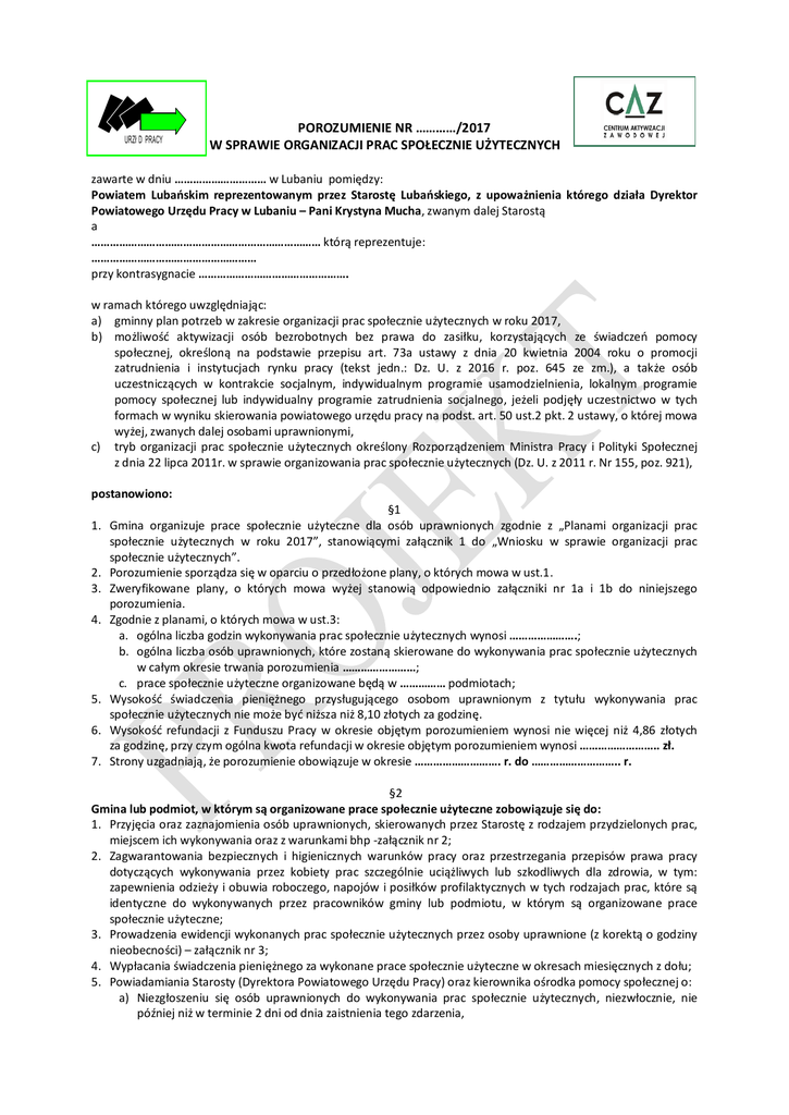 URZĄD PRACY POROZUMIENIE NR …………/2017 W SPRAWIE ORGANIZACJI PRAC SPOŁECZNIE UŻYTECZNYCH zawarte w dniu ………………………… w Lubaniu pomiędzy: Powiatem Lubańskim reprezentowanym przez Starostę Lubańskiego, z upoważnienia którego działa Dyrektor Powiatowego Urzędu Pracy w Lubaniu – Pani Krystyna Mucha, zwanym dalej Starostą a ………………………………………………………………… którą reprezentuje: ……………………………………………… przy kontrasygnacie …………………………………………. w ramach którego uwzględniając: a) gminny plan potrzeb w zakresie organizacji prac społecznie użytecznych w roku 2017, b) możliwość aktywizacji osób bezrobotnych bez prawa do zasiłku, korzystających ze świadczeń pomocy społecznej, określoną na podstawie przepisu art. 73a ustawy z dnia 20 kwietnia 2004 roku o promocji zatrudnienia i instytucjach rynku pracy (tekst jedn.: Dz. U. z 2016 r. poz. 645 ze zm.), a także osób uczestniczących w kontrakcie socjalnym, indywidualnym programie usamodzielnienia, lokalnym programie pomocy społecznej lub indywidualny programie zatrudnienia socjalnego, jeżeli podjęły uczestnictwo w tych formach w wyniku skierowania powiatowego urzędu pracy na podst. art. 50 ust.2 pkt. 2 ustawy, o której mowa wyżej, zwanych dalej osobami uprawnionymi, c) tryb organizacji prac społecznie użytecznych określony Rozporządzeniem Ministra Pracy i Polityki Społecznej z dnia 22 lipca 2011r. w sprawie organizowania prac społecznie użytecznych (Dz. U. z 2011 r. Nr 155, poz. 921), postanowiono: §1 1. Gmina organizuje prace społecznie użyteczne dla osób uprawnionych zgodnie z „Planami organizacji prac społecznie użytecznych w roku 2017”, stanowiącymi załącznik 1 do „Wniosku w sprawie organizacji prac społecznie użytecznych”. 2. Porozumienie sporządza się w oparciu o przedłożone plany, o których mowa w ust.1. 3. Zweryfikowane plany, o których mowa wyżej stanowią odpowiednio załączniki nr 1a i 1b do niniejszego porozumienia. 4. Zgodnie z planami, o których mowa w ust.3: a. ogólna liczba godzin wykonywania prac społecznie użytecznych wynosi ………………….; b. ogólna liczba osób uprawnionych, które zostaną skierowane do wykonywania prac społecznie użytecznych w całym okresie trwania porozumienia ……………………; c. prace społecznie użyteczne organizowane będą w …………… podmiotach; 5. Wysokość świadczenia pieniężnego przysługującego osobom uprawnionym z tytułu wykonywania prac społecznie użytecznych nie może być niższa niż 8,10 złotych za godzinę. 6. Wysokość refundacji z Funduszu Pracy w okresie objętym porozumieniem wynosi nie więcej niż 4,86 złotych za godzinę, przy czym ogólna kwota refundacji w okresie objętym porozumieniem wynosi …………………….. zł. 7. Strony uzgadniają, że porozumienie obowiązuje w okresie ………………………. r. do ……………………….. r. §2 Gmina lub podmiot, w którym są organizowane prace społecznie użyteczne zobowiązuje się do: 1. Przyjęcia oraz zaznajomienia osób uprawnionych, skierowanych przez Starostę z rodzajem przydzielonych prac, miejscem ich wykonywania oraz z warunkami bhp -załącznik nr 2; 2. Zagwarantowania bezpiecznych i higienicznych warunków pracy oraz przestrzegania przepisów prawa pracy dotyczących wykonywania przez kobiety prac szczególnie uciążliwych lub szkodliwych dla zdrowia, w tym: zapewnienia odzieży i obuwia roboczego, napojów i posiłków profilaktycznych w tych rodzajach prac, które są identyczne do wykonywanych przez pracowników gminy lub podmiotu, w którym są organizowane prace społecznie użyteczne; 3. Prowadzenia ewidencji wykonanych prac społecznie użytecznych przez osoby uprawnione (z korektą o godziny nieobecności) – załącznik nr 3; 4. Wypłacania świadczenia pieniężnego za wykonane prace społecznie użyteczne w okresach miesięcznych z dołu; 5. Powiadamiania Starosty (Dyrektora Powiatowego Urzędu Pracy) oraz kierownika ośrodka pomocy społecznej o: a) Niezgłoszeniu się osób uprawnionych do wykonywania prac społecznie użytecznych, niezwłocznie, nie później niż w terminie 2 dni od dnia zaistnienia tego zdarzenia, b) Niepodjęciu przez osoby uprawnione przydzielonych im prac społecznie użytecznych, niezwłocznie, nie później niż w terminie 2 dni od dnia zaistnienia tego zdarzenia, c) Opuszczeniu przez osoby uprawnione miejsca wykonywania prac społecznie użytecznych, niezwłocznie, nie później niż następnego dnia od dnia zaistnienia zdarzenia, d) Naruszeniu przez osoby uprawnione porządku i dyscypliny w miejscu wykonywania prac społecznie użytecznych w przypadkach, nie później niż następnego dnia od dnia zaistnienia zdarzenia; 6. W przypadkach, o których mowa w § 2 ust 5 a, b, c i d dopuszczenie do wykonywania prac społecznie użytecznych może nastąpić wyłącznie po otrzymaniu pisemnej informacji od Starosty, iż powyższe zdarzenia nie spowodowały utraty statusu osoby bezrobotnej i osoba może kontynuować prace społecznie użyteczne; 7. Złożenia wniosku o refundację kwoty świadczeń pieniężnych wypłaconych osobom uprawnionym z tytułu wykonywania prac społecznie użytecznych (załącznik nr 4) wraz z wymaganymi załącznikami w terminie do 30 dni po upływie miesiąca, za który przysługuje refundacja. Wymaganymi załącznikami są: uwierzytelniona kopia listy obecności, uwierzytelniona kopia imiennej listy wypłat wraz z wysokością wypłaconych świadczeń oraz ewidencja wykonywanych prac (załącznik nr 3); 8. Przestrzegania tygodniowej normy 10 godzin czasu pracy dla wykonujących prace społecznie użyteczne. §3 Starosta zobowiązuje się do: 1. Skierowania do wykonywania prac społecznie użytecznych osób uprawnionych z listy sporządzonej przez kierownika ośrodka pomocy społecznej w oparciu o postanowienia 