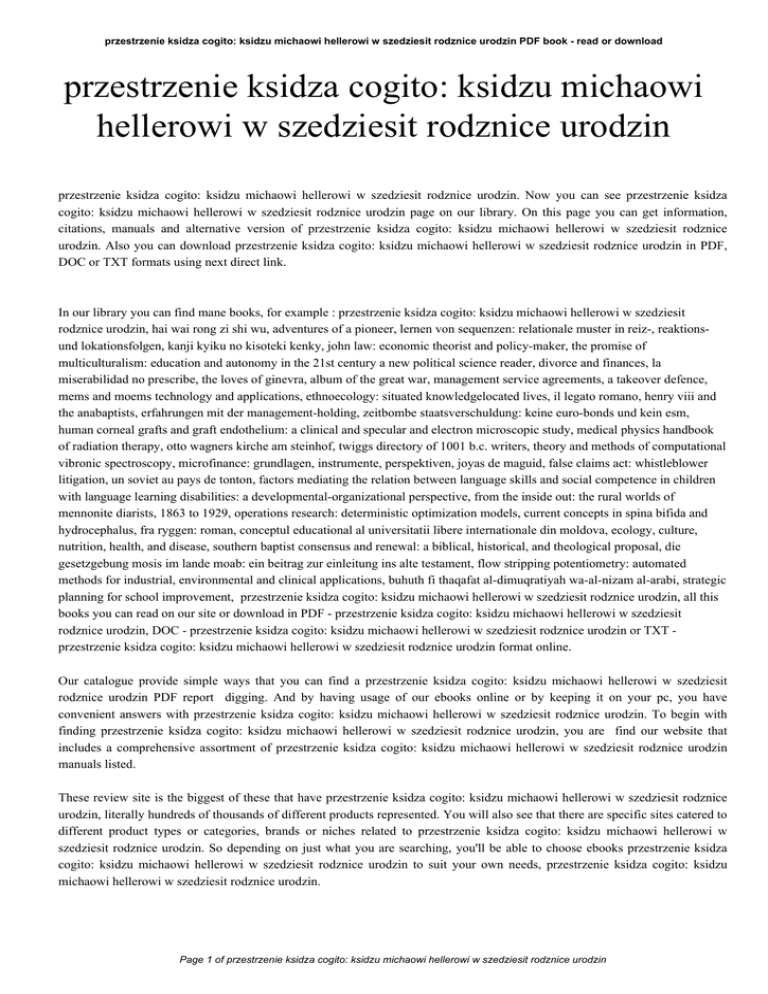 przestrzenie ksidza cogito: ksidzu michaowi hellerowi w szedziesit rodznice urodzin PDF book - read or download przestrzenie ksidza cogito: ksidzu michaowi hellerowi w szedziesit rodznice urodzin przestrzenie ksidza cogito: ksidzu michaowi hellerowi w szedziesit rodznice urodzin. Now you can see przestrzenie ksidza cogito: ksidzu michaowi hellerowi w szedziesit rodznice urodzin page on our library. On this page you can get information, citations, manuals and alternative version of przestrzenie ksidza cogito: ksidzu michaowi hellerowi w szedziesit rodznice urodzin. Also you can download przestrzenie ksidza cogito: ksidzu michaowi hellerowi w szedziesit rodznice urodzin in PDF, DOC or TXT formats using next direct link. In our library you can find mane books, for example : przestrzenie ksidza cogito: ksidzu michaowi hellerowi w szedziesit rodznice urodzin, hai wai rong zi shi wu, adventures of a pioneer, lernen von sequenzen: relationale muster in reiz-, reaktionsund lokationsfolgen, kanji kyiku no kisoteki kenky, john law: economic theorist and policy-maker, the promise of multiculturalism: education and autonomy in the 21st century a new political science reader, divorce and finances, la miserabilidad no prescribe, the loves of ginevra, album of the great war, management service agreements, a takeover defence, mems and moems technology and applications, ethnoecology: situated knowledgelocated lives, il legato romano, henry viii and the anabaptists, erfahrungen mit der management-holding, zeitbombe staatsverschuldung: keine euro-bonds und kein esm, human corneal grafts and graft endothelium: a clinical and specular and electron microscopic study, medical physics handbook of radiation therapy, otto wagners kirche am steinhof, twiggs directory of 1001 b.c. writers, theory and methods of computational vibronic spectroscopy, microfinance: grundlagen, instrumente, perspektiven, joyas de maguid, false claims act: whistleblower litigation, un soviet au pays de tonton, factors mediating the relation between language skills and social competence in children with language learning disabilities: a developmental-organizational perspective, from the inside out: the rural worlds of mennonite diarists, 1863 to 1929, operations research: deterministic optimization models, current concepts in spina bifida and hydrocephalus, fra ryggen: roman, conceptul educational al universitatii libere internationale din moldova, ecology, culture, nutrition, health, and disease, southern baptist consensus and renewal: a biblical, historical, and theological proposal, die gesetzgebung mosis im lande moab: ein beitrag zur einleitung ins alte testament, flow stripping potentiometry: automated methods for industrial, environmental and clinical applications, buhuth fi thaqafat al-dimuqratiyah wa-al-nizam al-arabi, strategic planning for school improvement, przestrzenie ksidza cogito: ksidzu michaowi hellerowi w szedziesit rodznice urodzin, all this books you can read on our site or download in PDF - przestrzenie ksidza cogito: ksidzu michaowi hellerowi w szedziesit rodznice urodzin, DOC - przestrzenie ksidza cogito: ksidzu michaowi hellerowi w szedziesit rodznice urodzin or TXT przestrzenie ksidza cogito: ksidzu michaowi hellerowi w szedziesit rodznice urodzin format online. Our catalogue provide simple ways that you can find a przestrzenie ksidza cogito: ksidzu michaowi hellerowi w szedziesit rodznice urodzin PDF report digging. And by having usage of our ebooks online or by keeping it on your pc, you have convenient answers with przestrzenie ksidza cogito: ksidzu michaowi hellerowi w szedziesit rodznice urodzin. To begin with finding przestrzenie ksidza cogito: ksidzu michaowi hellerowi w szedziesit rodznice urodzin, you are find our website that includes a comprehensive assortment of przestrzenie ksidza cogito: ksidzu michaowi hellerowi w szedziesit rodznice urodzin manuals listed. These review site is the biggest of these that have przestrzenie ksidza cogito: ksidzu michaowi hellerowi w szedziesit rodznice urodzin, literally hundreds of thousands of different products represented. You will also see that there are specific sites catered to different product types or categories, brands or niches related to przestrzenie ksidza cogito: ksidzu michaowi hellerowi w szedziesit rodznice urodzin. So depending on just what you are searching, you'll be able to choose ebooks przestrzenie ksidza cogito: ksidzu michaowi hellerowi w szedziesit rodznice urodzin to suit your own needs, przestrzenie ksidza cogito: ksidzu michaowi hellerowi w szedziesit rodznice urodzin. Page 1 of przestrzenie ksidza cogito: ksidzu michaowi hellerowi w szedziesit rodznice urodzin