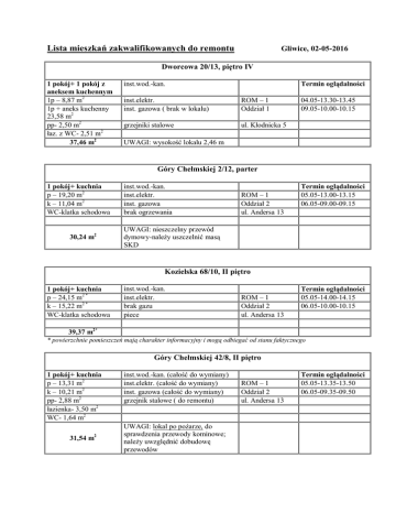 Lista mieszkań zakwalifikowanych do remontu Gliwice, 02-05-2016 Dworcowa 20/13, piętro IV 1 pokój+ 1 pokój z aneksem kuchennym 1p – 8,87 m2 1p + aneks kuchenny 23,58 m2 pp- 2,50 m2 łaz. z WC- 2,51 m2 37,46 m2 inst.wod.-kan. Termin oglądalności inst.elektr. inst. gazowa ( brak w lokalu) ROM – 1 Oddział 1 grzejniki stalowe ul. Kłodnicka 5 04.05-13.30-13.45 09.05-10.00-10.15 UWAGI: wysokość lokalu 2,46 m Góry Chełmskiej 2/12, parter 1 pokój+ kuchnia p – 19,20 m2 k – 11,04 m2 WC-klatka schodowa 30,24 m2 inst.wod.-kan. inst.elektr. inst. gazowa brak ogrzewania ROM – 1 Oddział 2 ul. Andersa 13 Termin oglądalności 05.05-13.00-13.15 06.05-09.00-09.15 UWAGI: nieszczelny przewód dymowy-należy uszczelnić masą SKD Kozielska 68/10, II piętro 1 pokój+ kuchnia p – 24,15 m2 * k – 15,22 m2 * WC-klatka schodowa inst.wod.-kan. inst.elektr. brak gazu piece ROM – 1 Oddział 2 ul. Andersa 13 Termin oglądalności 05.05-14.00-14.15 06.05-10.00-10.15 39,37 m2* * powierzchnie pomieszczeń mają charakter informacyjny i mogą odbiegać od stanu faktycznego Góry Chełmskiej 42/8, II piętro 1 pokój+ kuchnia p – 13,31 m2 k – 10,21 m2 pp- 2,88 m2 łazienka- 3,50 m2 WC- 1,64 m2 31,54 m2 inst.wod.-kan. (całość do wymiany) inst.elektr. (całość do wymiany) inst. gazowa (całość do wymiany) grzejnik stalowe ( do remontu) UWAGI: lokal po pożarze, do sprawdzenia przewody kominowe; należy uwzględnić dobudowę przewodów ROM – 1 Oddział 2 ul. Andersa 13 Termin oglądalności 05.05-13.35-13.50 06.05-09.35-09.50 Jagiellońska 1/22, piętro VII 3 pokoje+ kuchnia 1p – 20,56 m2 2p – 8,43 m2 3p – 10,01 m2 inst.wod.-kan. inst.elektr. inst. gazowa grzejniki stalowe ROM – 2 Oddział 1 ul. Zabrska 15 Termin oglądalności 04.05-10.15-10.30 05.05-12.15-12.30 k-6,38 m2 pp-9,93 m2 łazienka- 2,78 m2 WC- 1,41 m2 59,50 m2 UWAGI: do sprawdzenia przewody kominowe; należy uwzględnić dobudowę przewodów; nieruchomość wyposażona jest w windę Staszica 23/1, parter 1 pokój+ kuchnia p – 11,36 m2 k – 12,52 m2 pp- 1,85 m2 WC- 0,94 m2 26,67 m2 inst.wod.-kan. inst.elektr. brak gazu brak ogrzewania ROM – 2 Oddział 2 ul. Niedurnego 6 Termin oglądalności 04.05-14.00-14.15 09.05-09.00-09.15 UWAGI: w lokalu wykonana została nielegalnie łazienka-należy ją zalegalizować lub zlikwidować; w pokoju należy wykonać nawiew z zewnątrz budynku; brak wentylacji grawitacyjnej kuchninależy dobudować przewód z rur ocieplonych oraz wyprowadzić ponad dach Równa 19/6, piętro I 2 pokoje+ kuchnia 1p – 18,04 m2 2p – 13,09 m2 k – 8,42 m2 pp-6,24 m2 łaz., WC-2,12 m2 47,91 m2 inst.wod.-kan. inst.elektr. inst. gazowa grzejniki stalowe ROM – 3 Oddział 2 ul. Asnyka 15 Termin oglądalności 04.05-09.00-09.15 05.05-14.30-14.45 Rybnicka 19/12, piętro II BUDYNEK PRZY UL. RYBNICKIEJ 19 W SAMOISTNYM POSIADANIU MIASTA GLIWICE* inst.wod.-kan. Termin oglądalności inst.elektr. ROM – 3 04.05-09.30-09.45 inst. gazowa Oddział 2 05.05-15.00-15.15 piece ( do remontu)- grzejniki stalowe ul. Asnyka 15 do likwidacji UWAGI: należy wyremontować piec kaflowy w celu użytkowania; 36,22 m2 wykonana nielegalnie łazienka do likwidacji; ścianka z płyty GK do likwidacji *Miasto Gliwice włada przedmiotową nieruchomością jak właściciel, lecz nim nie jest; aktualnie brak możliwości wykupu na własność w/w lokalu 1 pokój+ kuchnia p – 22,96 m2 k – 13,26 m2 WC-klatka schodowa Przemysłowa 6B/2, parter 1 pokój+ kuchnia p – 18,00 m2 k – 9,54 m2 inne pom.- 6,96 m2 WC- klatka schodowa (do remontu) 34,50 m2 inst.wod.-kan. inst.elektr. inst. gazowa brak ogrzewania ROM – 4 ul. Dziewanny 2 Termin oglądalności 02.05-15.00-15.15 05.05-09.00-09.15 UWAGI: do sprawdzenia przewody kominowe; należy uwzględnić dobudowę przewodów; lokal w złym stanie technicznym Chorzowska 14/10, II piętro 1 pokój+ kuchnia p – 28,60 m2 k – 14,00 m2 WC- klatka schodowa 42,60 m2 inst.wod.-kan. Termin oglądalności inst.elektr. ROM – 6 04.05-14.00-14.15 inst. gazowa ul. Chorzowska 14 06.05-10.30-10.45 brak ogrzewania UWAGI: do sprawdzenia przewody kominowe; należy uwzględnić dobudowę przewodów Tarnogórska 252/5, piętro I 3 pokoje+ kuchnia 1p – 19,16 m2 2p – 18,88 m2 3p – 18,82 m2 inst.wod.-kan. inst.elektr. brak gazu Brak ogrzewania Termin oglądalności ROM – 6 04.05-14.45-15.00 ul. Chorzowska 14 06.05-11.15-11.30 k-15,79 m2 łaz. z WC (nielegalna )- 3,00 m2 75,65 m2 UWAGI: do sprawdzenia przewody kominowe; należy uwzględnić dobudowę przewodów; lokal został nielegalnie rozdzielony na dwa mieszkania; proponuje się przywrócić lokal do stanu poprzedniego z równoczesną legalizacją łazienki, zaś 2 łazienkę zlikwidować JEDNOKROTNA REZYGNACJA Z OBJĘCIA W NAJEM WSKAZANEGO DO REMONTU LOKALU MIESZKALNEGO SPOWODUJE SKREŚLENIE Z LISTY OSÓB OCZEKUJĄCYCH NA MIESZKANIE DO REMONTU. Prosimy o składanie podań w Biurze Podawczym Zakładu Gospodarki Mieszkaniowej z siedzibą przy Placu Inwalidów Wojennych 12. Termin składania podań do dnia 09 maja 2016 roku