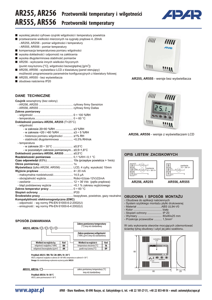 AR255, AR256 AR555, AR556 Przetworniki temperatury i wilgotności Przetworniki temperatury n wysokiej jakości cyfrowe czujniki wilgotności i temperatury powietrza n przetwarzanie wielkości mierzonych na sygnały prądowe 4..20mA - AR255, AR256 - pomiar wilgotności i temperatury - AR555, AR556 - pomiar temperatury n kompensacja temperaturowa pomiaru wilgotności n wysoka dokładność i odporność na zakłócenia n wysoka długoterminowa stabilność pomiarów n AR256 - wyliczanie innych wielkości fizycznych (punkt rosy/szronu [°C], wilgotności bezwzględnej [g/m3]) n AR256, AR556 - wyświetlacz LCD z klawiaturą (panel sterujący) możliwość programowania parametrów konfiguracyjnych z klawiatury foliowej n AR255, AR555 - bez wyświetlacza n obudowa naścienna IP20 AR255, AR555 - wersje bez wyświetlacza DANE TECHNICZNE Czujnik wewnętrzny (bez osłony) - AR256, AR255 ........................................... cyfrowy firmy Sensirion - AR556, AR555 ........................................... cyfrowy firmy Dallas Zakres pomiarowy - wilgotność .................................................. 0 ÷ 100 %RH - temperatura................................................ 0 ÷ 60 °C Dokładność pomiaru AR256, AR255 (T=25°C) - wilgotność - w zakresie 20÷80 %RH ...................... ±3 %RH - w zakresie <20 i >80 %RH ................. ±3 ÷ 5 %RH - histereza pomiaru wilgotności ............ ±1% RH - stabilność długoterminowa ................. <0,5% RH/rok - temperatura - w zakresie 20 ÷ 30°C ......................... ±0,5°C - w pozostałym zakresie pomiarowym... ±0,5÷1,8°C Dokładność pomiaru AR556, AR555 ........... ±0,5°C Rozdzielczość pomiarowa ........................... 0,1 %RH i 0,1 °C Czas odpowiedzi (63%)................................. 10s (przepływ powietrza > 1m/s) Okres pomiarowy........................................... 1s Wyświetlacz (tylko AR256, AR556) ............... LCD, 4 cyfry, wysokość 10mm Wyjście prądowe .......................................... 4÷ 20 mA - maksymalna rozdzielczość......................... 14,5 m A - obciążalność wyjścia.................................. Robc<(Uzas-12V)/22mA - zasilanie ..................................................... 12 ÷ 36 Vdc (pętla prądowa) - błąd podstawowy wyjścia .......................... <0,1 % zakresu wyjściowego Zakres temperatur pracy .............................. 0 ÷ 60 °C Stopień ochrony ............................................IP20 Środowisko pracy ......................................... bezpyłowe, powietrze, gazy neutralne Kompatybilność elektromagnetyczna (EMC) - odporność : wg normy PN-EN 61000-6-2:2002(U) - emisyjność : wg normy PN-EN 61000-6-4:2002(U) SPOSÓB ZAMAWIANIA AR255, AR256 / o /o /o /o Zakres pomiarowy temperatury [°C] inny niż standardowy AR256, AR556 - wersje z wyświetlaczem LCD OPIS LISTEW ZACISKOWYCH 3 2 1 IT + IRH + mA mA _ 3 zasilanie 12 ÷ 36 V= 2 + 1 V+ AR256, AR255 IT zasilanie 12 ÷ 36 V= + mA _ + V+ AR556, AR555 OBUDOWA I SPOSÓB MONTAŻU - Obudowa do aplikacji naściennych - System szybkiego montażu płytki drukowanej - Materiał ...............................ABS UL94-V0 - Kolor .................................... biały - Stopień ochrony .................. IP 20 - Wymiary .............................. 80x80x25 mm - Przekroje przewodów .......... 1,5mm2 W celu wykonania otworów mocujących zdemontować ściankę tylną obudowy i użyć jej jako szablonu. Zakres pomiarowy wilgotności [ %RH, g/m3] inny niż standardowy wyświetlacz LCD Wielkość na wyjściu IRH wilgotność względna [ %RH] wilgotność bezwzględna [g/m3] Kod RH AH Wielkość na wyjściu IT temperatura otoczenia [°C] punkt rosy/szronu [°C] Kod TA DP %RH 80 °C Przykład: AR255 / RH / TA / 20÷80% / 0÷30 °C AR255, wilgotność względna w zakresie 20÷80 %RH, temperatura w zakresie 0÷30 °C Uwaga: dla standardowego wykonania wystarczy podać AR255 AR555, AR556 / o Przykład: AR556 / 0÷50 °C zakres pomiarowy temperatury [°C] inny niż standardowy Klawiatura LED (nieużywane) 80 25 AR555, zakres przetwarzania 0÷50 °C www.apar.pl APAR - Biuro Handlowe, 05-090 Raszyn, ul. Gałczyńskiego 6, tel. +48 22 101-27-31, +48 22 853-48-56 • email: [email protected] CERTYFIKAT KALIBRACJI CYFROWYCH CZUJNIKÓW WILGOTNOŚCI I TEMPERATURY FIRMY SENSIRION Calibration Certification – SHT1x / SHT2x / SHT7x Series Calibration Certification Product: SHT1x / SHT2x / SHT7x Series Description: Digital Humidity and Temperature Sensors The above mentioned products are calibrated to meet the specifications according to the corresponding Sensirion data sheet. Each device is individually tested after its calibration. Sensirion uses transfer standards for the calibration. These transfer standards are themselves subject to a scheduled calibration procedure. The calibration of the reference itself used for the calibration of the transfer standards is performed by an ISO/IEC 17025 accredited laboratory. The accreditation body is full member of the International Laboratory Accreditation Cooperation (www.ilac.org). Calibration certificates issued by facilities accredited by a signatory to the ILAC Mutual Recognition Arrangement (MRA) are accepted by all signatories to the ILAC MRA. This provides traceability of measurement to recognized national standards and to units of measurement realized at the “National Physical Laboratory” (NPL) or other recognized national standards laboratories like “Physikalisch-Technische Bundesanstalt” (PTB) or “National Institute of Standards and Technology” (NIST). Staefa, August 2010 Dr. Felix Mayer Co-CEO, Sensirion AG © Copyright Sensirion AG, Switzerland Andreas Kaatz Quality Manager, Sensirion AG 1/1