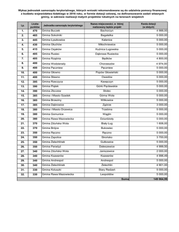 Wykaz jednostek samorządu terytorialnego, których wnioski rekomendowane są do udzielnia pomocy finansowej z budżetu województwa łódzkiego w 2016 roku, w formie dotacji celowej, na dofinansowanie zadań własnych gminy, w zakresie realizacji małych projektów lokalnych na terenach wiejskich Lp. 1. Liczba Jednostka samorządu terytorialnego punktów Gmina Buczek 470 2. 465 Gmina Sokolniki 3. 445 Gmina Łyszkowice 4. 430 5. Nazwa miejscowości, w której realizowany będzie projekt Bachorzyn Kwota dotacji (w złotych) 4 988,00 Bagatelka 5 000,00 Kalenice 5 000,00 Gmina Głuchów Miłochniewice 5 000,00 415 Gmina Osjaków Kuźnica Ługowska 5 000,00 6. 405 Gmina Rusiec Dąbrowa Rusiecka 5 000,00 7. 405 Gmina Rząśnia Będków 4 800,00 8. 400 Gmina Wodzierady Chorzeszów 4 974,00 9. 400 Gmina Pęczniew Pęczniew 5 000,00 10. 400 Gmina Głowno Popów Głowieński 5 000,00 11. 400 Gmina Sławno Owadów 5 000,00 12. 395 Gmina Rzeczyca Kawęczyn 5 000,00 13. 390 Gmina Piątek Górki Pęcławskie 5 000,00 14. 390 Gmina Złoczew Stolec 5 000,00 15. 385 Gmina i Miasto Szadek Górna Wola 5 000,00 16. 385 Gmina Brzeziny Witkowice 5 000,00 17. 385 Gmina Dąbrowice Zgórze 3 000,00 18. 380 Gmina i Miasto Drzewica Trzebina 5 000,00 19. 380 Gmina Gomunice Wąglin 5 000,00 20. 380 Gmina Rawa Mazowiecka Dziurdzioły 5 000,00 21. 370 Gmina Zduńska Wola Biały Ług 1 606,00 22. 370 Gmina Brójce Bukowiec 5 000,00 23. 350 Gmina Ręczno Ręczno 5 000,00 24. 350 Gmina Zapolice Strońsko 3 700,00 25. 350 Gmina Żelechlinek Gutkowice 5 000,00 26. 350 Gmina Paradyż Daleszewice 4 999,50 27. 340 Gmina Zduńska Wola Janiszewice 2 000,00 28. 340 Gmina Ksawerów Ksawerów 4 996,49 29. 340 Gmina Andrespol Andrespol 5 000,00 30. 340 Gmina Żelechlinek Żelechlin 4 901,00 31. 330 Gmina Koluszki Stary Redzeń 5 000,00 32. 330 Gmina Rawa Mazowiecka Leopoldów 5 000,00 Suma 149 964,99