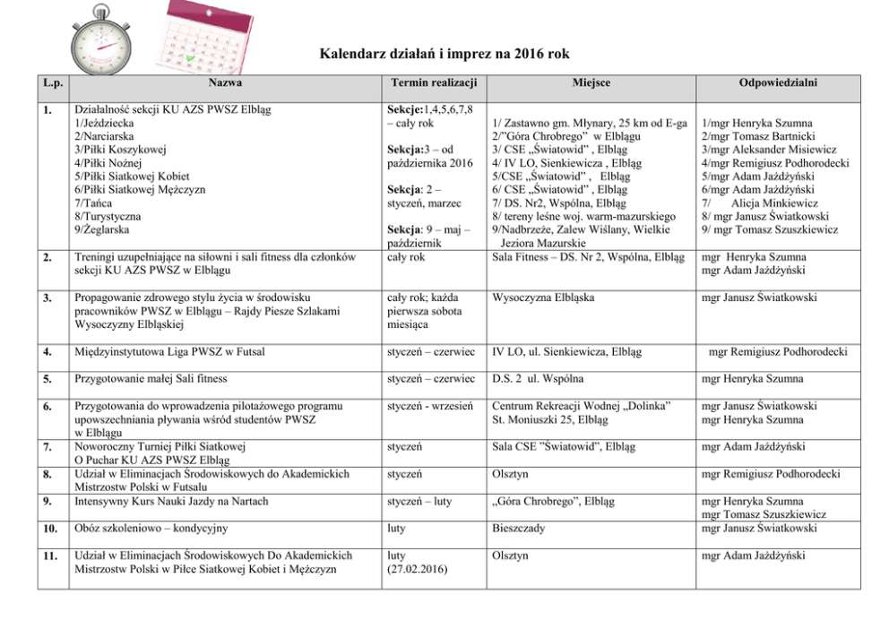 Kalendarz działań i imprez na 2016 rok L.p. 1. Nazwa Działalność sekcji KU AZS PWSZ Elbląg 1/Jeździecka 2/Narciarska 3/Piłki Koszykowej 4/Piłki Nożnej 5/Piłki Siatkowej Kobiet 6/Piłki Siatkowej Mężczyzn 7/Tańca 8/Turystyczna 9/Żeglarska Termin realizacji Sekcje:1,4,5,6,7,8 – cały rok Sekcja:3 – od października 2016 Sekcja: 2 – styczeń, marzec Sekcja: 9 – maj – październik cały rok Miejsce Odpowiedzialni 1/ Zastawno gm. Młynary, 25 km od E-ga 2/”Góra Chrobrego” w Elblągu 3/ CSE „Światowid” , Elbląg 4/ IV LO, Sienkiewicza , Elbląg 5/CSE „Światowid” , Elbląg 6/ CSE „Światowid” , Elbląg 7/ DS. Nr2, Wspólna, Elbląg 8/ tereny leśne woj. warm-mazurskiego 9/Nadbrzeże, Zalew Wiślany, Wielkie Jeziora Mazurskie Sala Fitness – DS. Nr 2, Wspólna, Elbląg 1/mgr Henryka Szumna 2/mgr Tomasz Bartnicki 3/mgr Aleksander Misiewicz 4/mgr Remigiusz Podhorodecki 5/mgr Adam Jażdżyński 6/mgr Adam Jażdżyński 7/ Alicja Minkiewicz 8/ mgr Janusz Światkowski 9/ mgr Tomasz Szuszkiewicz mgr Janusz Światkowski 2. Treningi uzupełniające na siłowni i sali fitness dla członków sekcji KU AZS PWSZ w Elblągu 3. Propagowanie zdrowego stylu życia w środowisku pracowników PWSZ w Elblągu – Rajdy Piesze Szlakami Wysoczyzny Elbląskiej cały rok; każda pierwsza sobota miesiąca Wysoczyzna Elbląska 4. Międzyinstytutowa Liga PWSZ w Futsal styczeń – czerwiec IV LO, ul. Sienkiewicza, Elbląg 5. Przygotowanie małej Sali fitness styczeń – czerwiec D.S. 2 ul. Wspólna mgr Henryka Szumna 6. styczeń - wrzesień Centrum Rekreacji Wodnej „Dolinka” St. Moniuszki 25, Elbląg mgr Janusz Światkowski mgr Henryka Szumna styczeń Sala CSE ”Światowid”, Elbląg mgr Adam Jażdżyński styczeń Olsztyn mgr Remigiusz Podhorodecki 9. Przygotowania do wprowadzenia pilotażowego programu upowszechniania pływania wśród studentów PWSZ w Elblągu Noworoczny Turniej Piłki Siatkowej O Puchar KU AZS PWSZ Elbląg Udział w Eliminacjach Środowiskowych do Akademickich Mistrzostw Polski w Futsalu Intensywny Kurs Nauki Jazdy na Nartach styczeń – luty „Góra Chrobrego”, Elbląg 10. Obóz szkoleniowo – kondycyjny luty Bieszczady mgr Henryka Szumna mgr Tomasz Szuszkiewicz mgr Janusz Światkowski 11. Udział w Eliminacjach Środowiskowych Do Akademickich Mistrzostw Polski w Piłce Siatkowej Kobiet i Mężczyzn luty (27.02.2016) Olsztyn mgr Adam Jażdżyński 7. 8. mgr Henryka Szumna mgr Adam Jażdżyński mgr Remigiusz Podhorodecki marzec – maj Elbląg mgr Henryka Szumna 13. Przygotowania do Sportowych Turbinaliów’2016 30.05 – 03.06.2016r. Mistrzostwa PWSZ w Futsalu – Eliminacje marzec – maj IV LO, ul. Sienkiewicza, Elbląg mgr Remigiusz Podhorodecki 14. Wiosenne Marsze na Orientację Las Komunalny „Bażantarnia” mgr Janusz Światkowski 15. Piłka Siatkowa Kobiet Półfinał B Łódź mgr Adam Jażdżyński 16. Piłka Siatkowa Mężczyzn Półfinał B Olsztyn mgr Adam Jażdżyński 17. XXIII Bielikowe Harce Orientacyjne marzec 19.03.2016 kwiecień 03-06.04.2016 kwiecień 07 – 10.04. 2016 kwiecień 09 – 10.04.2016 Las Komunalny „Bażantarnia” mgr Janusz Światkowski 18. Finał Akademickich Mistrzostw Polski w Siatkówce 29.04 -02.05.2016 Warszawa mgr Adam Jażdżyński 19. Biegowy Potop AZS Szwecja - Karlskrona mgr Henryka Szumna 20. Piknik Żeglarski Nadbrzeże mgr Henryka Szumna 21. Rejsy szkoleniowo – turystyczne po Zalewie Wiślanym kwiecień 17.04.2016 maj 07.05.2016 maj – czerwiec start – Nadbrzeże mgr Tomasz Szuszkiewicz mgr Tomasz Bartnicki 22. Wiosenne Rajdy Rowerowe maj –czerwiec Wysoczyzna Elbląska mgr Adam Jażdżyński 23. XII Jajecznicada wszędzie mgr Janusz Światkowski 24. Piknik Jeździecki maj 13 – 14.05.2016 maj/czerwiec mgr Henryka Szumna 25. XVII Otwarte Mistrzostwa PWSZ w Marszach na Orientację w Parach maj 21.05.2016 Zastawno gm. Młynary, pow. elbląski – 25 km od Elbląga Las Komunalny „Bażantarnia” 26. Turbinalia’TUR (termin do wyboru) Szwecja – Karlskrona mgr Henryka Szumna 27. Międzyinstytutowy Turniej Piłki Siatkowej o Puchar Przechodni Rektora PWSZ w Elblągu maj 22 – 24.05.2016 29 – 31.05.2016 maj 30.05.2016 CSE „Światowid” mgr Adam Jażdżyński 28. Mistrzostwa PWSZ w Futsalu – Finał maj 30.05.2016 IV LO mgr R. Podhorodecki 12. mgr Janusz Światkowski Festyn Wodny – II Międzyinstytutowe Mistrzostwa PWSZ w Elblągu o Wiosło Rektora 1/wyścig sztafet instytutowych – 4 kajaki/2 – na jeden instytut 2/wyścig reprezentacji wykładowców – 2 os. z instytutu maj 31.05.2016 30. Sportowe Integralia czyli Staromiejskie Marsze na Orientację dla studentów i uczniów szkół średnich 01.06.2016 Elbląska Starówka mgr Janusz Światkowski nauczyciele z ZWF 31. III Mistrzostwa PWSZ w Sportach Barowych 01.06.2016 YOLO mgr Henryka Szumna mgr Janusz Światkowski mgr Remigiusz Podhorodecki mgr Adam Jażdżyński mgr Aleksander Misiewicz mgr Tomasz Bartnicki mgr Tomasz Szuszkiewicz 32. Wielkie Żaków Grilowanie Wspólnie na Wspólnej 02.06.2016 Tereny Zielone przy Domu Studenckim ul. Wspólna mgr Henryka Szumna mgr Jacek Wojtasik 1/ mgr R.Podhorodecki 29. Kanał Elbląski – 2 mosty mgr Henryka Szumna nauczyciele z ZWF 1/ Mecz piłki nożnej Pracownicy vs. Studenci o „Puchar Turbinaliów’2016” 2/Turniej gry w Badmintona o Puchar Rektora PWSZ w Elblągu 2/ mgr Janusz Światkowski mgr Adam Jażdżyński 3/Alicja Minkiewicz 4/mgr A.Misiewicz 5/mgr A.Misiewicz 33. 3/Piknikowy Turniej gier planszowych i nie tylko 4/Wielkie grillowanie w tym konkurs na ciekawą potrawę z grilla 5/Koncert zespołów studenckich Udział w XXVII Zjeździe AZS 10 – 11.06.2016 Warszawa mgr Henryka Szumna 34. Siatkówka Plażowa Kobiet i Mężczyzn 26.05 – 19.06.2016 Łódź, Gdańsk mgr Adam Jażdżyński 35. Rejs po Wielkich Jeziorach Mazurskich 04 – 08.07.2016 program w opracowaniu mgr Tomasz Szuszkiewicz mgr Tomasz Bartnicki 36. Dwudniowe rejsy szkoleniowo – turystyczne po Zal