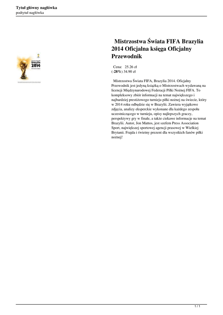 Tytuł główny nagłówka podtytuł nagłówka Mistrzostwa Świata FIFA Brazylia 2014 Oficjalna księga Oficjalny Przewodnik Cena: 25.26 zł (-28%) 34.90 zł Mistrzostwa Świata FIFA, Brazylia 2014. Oficjalny Przewodnik jest jedyną książką o Mistrzostwach wydawaną na licencji Międzynarodowej Federacji Piłki Nożnej FIFA. To kompleksowy zbiór informacji na temat największego i najbardziej prestiżowego turnieju piłki nożnej na świecie, który w 2014 roku odbędzie się w Brazylii. Zawiera wyjątkowe zdjęcia, analizy eksperckie wykonane dla każdego zespołu uczestniczącego w turnieju, opisy najlepszych graczy, perspektywy gry w finale, a także ciekawe informacje na temat Brazylii. Autor, Jon Mattos, jest szefem Press Association Sport, największej sportowej agencji prasowej w Wielkiej Brytanii. Frajda i świetny prezent dla wszystkich fanów piłki nożnej! 1/1 Powered by TCPDF (www.tcpdf.org)