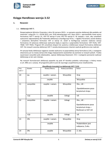 Księga Handlowa wersja 3.52 1. Nowości 1.1. Deklaracje VAT-7. Rozporządzenie Ministra Finansów z dnia 18 czerwca 2015 r. w sprawie wzorów deklaracji dla podatku od towarów i usług (Dz. U. z 29.06.2015, poz. 914) obowiązujące od 1 lipca 2015 r. wprowadziło nowe wzory formularzy VAT-7 wersja 15, VAT-7K wersja 9 oraz VAT-7D wersja 6. W związku z tym, aby umożliwić wyliczenie odpowiedniej dla Podatnika deklaracji w Konfiguracji firmy -> Ogólne Parametry został dodany i ustawiony domyślnie formularz VAT w wersji 15. Jeżeli w konfiguracji zostanie wybrana wersja formularza 14 wówczas deklaracje wyliczane będą w oparciu o poprzednie formularze: VAT-7(14), VAT7K(8) i VAT-7D(5). Program KH umożliwia eksport do systemu e-deklaracje nowych formularzy deklaracji VAT. Do nowych wzorów deklaracji VAT-7 zostały dostosowane również wydruki graficzne oraz nadruki. W sytuacji kiedy deklaracja najpierw została wyliczona na poprzedniej wersji formularza (14), a następnie otworzona już na nowej wersji (15) mogą niepoprawnie wyświetlać się wartości w nowych polach. Trzeba wyzerować wszystkie pola edytowalne, zapisać deklarację klawiszem <F2> i następnie ponownie wyliczyć deklarację za ten sam miesiąc. Na nowych formularzach deklaracji pojawiło się pole 47 Korekta podatku naliczonego, o której mowa w art. 89b ust.1 ustawy. W programie pole to jest do ręcznego uzupełnienia przez Użytkownika. Klasyfikacja transakcji na deklarację VAT-7 (15) Poz. VAT-7 Stawka 10 zw. Rodzaj faktury Rodzaj sprzedaży Status zwykłe + wewn. Wszystkie Kraj zwykłe 11 wszystkie Wszystkie zwykłe + wewn. Wszystkie Eks., UE Opodatkowane poza terytorium kraju n/p 12 wszystkie zwykłe Usługi UE zwykłe + wewn. Usługi Eks., UE Opodatkowane poza terytorium kraju – Rozliczać w VAT-UE 13 n/p zwykłe Usługi UE 0% zwykłe + wewn. Wszystkie Kraj Podatnikiem jest nabywca, Z.eks. zwykłe 14 0% Comarch ERP Klasyka KH zwykłe Wszystkie 1 Z. eks. Zmiany w wersji 3.52 15, 16 3% zwykłe + wewn. 5% zwykłe 7% zwykłe + wewn. 8% zwykłe 22% zwykłe + wewn. 23% zwykłe 21 0% zwykłe Towary, Śr. transportu UE 22 0% zwykłe Towary, Śr. transportu Eks. 23, 24 wszystkie wewnętrzne Towary, Śr. transportu UE, oprócz tych z zaznaczonym parametrem "podatnikiem jest nabywca" 25, 26 wszystkie wewnętrzne Towary, Śr. transportu Eks., Z.eks., oprócz tych z zaznaczonym parametrem "podatnikiem jest nabywca" 27, 28 wszystkie wewnętrzne Usługi Eks., Z.eks. oprócz tych z zaznaczonym parametrem "podatnikiem jest nabywca" 29, 30 wszystkie wewnętrzne Usługi UE, oprócz tych z zaznaczonym parametrem "podatnikiem jest nabywca" 31 n/p zwykłe Wszystkie 17, 18 19, 20 Comarch ERP Klasyka KH Wszystkie Kraj Wszystkie Wszystkie Kraj Wszystkie Wszystkie Kraj Wszystkie 2 Kraj - Podatnikiem jest nabywca, parametr "Podatnik VAT czynny" Zmiany w wersji 3.52 32, 33 wszystkie wewnętrzne Towary, Śr. transportu UE - podatnikiem jest nabywca, Eks. podatnikiem jest nabywca 34, 35 wszystkie wewnętrzne Wszystkie Kraj - Podatnikiem jest nabywca, parametr "Podatnik VAT czynny" 37 wszystkie wewnętrzne Śr. Transportu UE, oprócz tych z zaznaczonym parametrem "podatnikiem jest nabywca" Księga Handlowa wersja 3.51 1. Zmiany 1 lipca 2015 roku wejdzie w życie nowelizacja ustawy o podatku od towarów i usług oraz ustawy – Prawo zamówień publicznych opublikowana w Dzienniku Ustaw pod poz. 605 wg której odwrotne obciążenie będzie miało zastosowanie w sytuacji kiedy nabywcą towarów będzie podatnik VAT czynny. W związku z tym zostały wprowadzone w programie następujące zmiany. 1.2. Karta kontrahenta. Na formularzu kontrahenta wprowadzono zmiany dotyczące odwrotnego obciążenia. Zmiany w ustawie o VAT uzależniają możliwość zastosowania odwrotnego obciążenia od tego czy podmiot jest podatnikiem VAT czynnym. Zmiana dotyczy kontrahentów o statusie Kraj. Po zaznaczeniu opcji Podatnikiem jest nabywca nie jest ukrywany parametr Podatnik VAT czynny. Dla kontrahentów o statusie Eksp. i/lub UE także umożliwiono zastosowanie odwrotnego obciążenia poprzez zaznaczenie parametru Podatnikiem jest nabywca. Możliwość ta została wprowadzona, aby odpowiednio kwalifikować dokumenty na nowych formularzach deklaracji VAT-7, które znajdują się w rozporządzeniu przygotowanym przez Ministerstwo Finansów. 1.3. Zmiany na formularzu w rejestrze sprzedaży VAT. Na formularzu w rejestrze sprzedaży VAT na transakcjach krajowych po zaznaczeniu parametru Podatnikiem jest nabywca dodano możliwość zaznaczenia opcji Podatnik VAT czynny. Podatnikiem jest nabywca dostępny jest również na transakcjach ze statusem Eksport i/lub UE. Dokumenty ze statusem UE oraz Eksport z zaznaczonym parametrem Podatnikiem jest nabywca, na deklaracji VAT-7 (14) są uwzględniane jak dotychczasowe transakcje UE i Eksport. Transakcje o statusie UE przy zaznaczonym parametrze Podatnikiem jest nabywca domyślnie nie są kwalifikowane do deklaracji VAT-UE. Parametr Rozliczać w deklaracji VAT-UE jest odznaczany. Można go ręcznie zaznaczyć. 1.4. Zmiany na formularzu w rejestrze zakupu VAT. Na formularzu w rejestrze zakupu VAT na transakcjach krajowych po zaznaczeniu parametru Podatnikiem jest nabywca dodano możliwość zaznaczenia opcji Podatnik VAT czynny. Podatnikiem jest nabywca dostępny jest również na transakcjach ze statusem Import i/lub UE. Comarch ERP Klasyka KH 3 Zmiany w wersji 3.52 Dokumenty ze statusem UE oraz Import z zaznaczonym parametrem Podatnikiem jest nabywca, na deklaracji VAT-7 (14) są kwalifikowane jak dotychczasowe transakcje UE i Import. Transakcje o statusie UE przy zaznaczonym parametrze Podatnikiem jest nabywca domyślnie nie są kwalifikowane do deklaracji VAT-UE. Parametr Rozliczać w deklaracji VAT-UE jest odznaczany. Można go ręcznie zaznaczyć. 1.5. Zmiany w strukturze pliku VAT_R W wersji programu KH 3.51 nastąpiła zmiana struktury pliku wymiany danych VAT_R.txt. Szczegółowe informacje znajdują się w biu