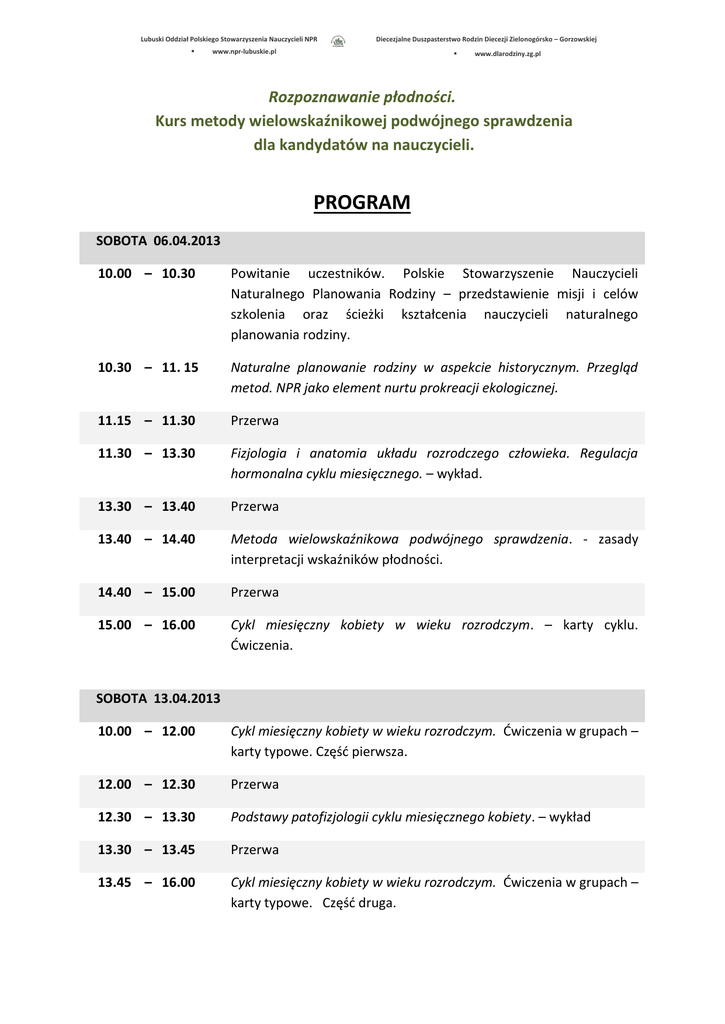 Lubuski Oddział Polskiego Stowarzyszenia Nauczycieli NPR Diecezjalne Duszpasterstwo Rodzin Diecezji Zielonogórsko – Gorzowskiej www.npr-lubuskie.pl www.dlarodziny.zg.pl Rozpoznawanie płodności. Kurs metody wielowskaźnikowej podwójnego sprawdzenia dla kandydatów na nauczycieli. PROGRAM SOBOTA 06.04.2013 10.00 – 10.30 Powitanie uczestników. Polskie Stowarzyszenie Nauczycieli Naturalnego Planowania Rodziny – przedstawienie misji i celów szkolenia oraz ścieżki kształcenia nauczycieli naturalnego planowania rodziny. 10.30 – 11. 15 Naturalne planowanie rodziny w aspekcie historycznym. Przegląd metod. NPR jako element nurtu prokreacji ekologicznej. 11.15 – 11.30 Przerwa 11.30 – 13.30 Fizjologia i anatomia układu rozrodczego człowieka. Regulacja hormonalna cyklu miesięcznego. – wykład. 13.30 – 13.40 Przerwa 13.40 – 14.40 Metoda wielowskaźnikowa podwójnego sprawdzenia. - zasady interpretacji wskaźników płodności. 14.40 – 15.00 Przerwa 15.00 – 16.00 Cykl miesięczny kobiety w wieku rozrodczym. – karty cyklu. Ćwiczenia. SOBOTA 13.04.2013 10.00 – 12.00 Cykl miesięczny kobiety w wieku rozrodczym. Ćwiczenia w grupach – karty typowe. Część pierwsza. 12.00 – 12.30 Przerwa 12.30 – 13.30 Podstawy patofizjologii cyklu miesięcznego kobiety. – wykład 13.30 – 13.45 Przerwa 13.45 – 16.00 Cykl miesięczny kobiety w wieku rozrodczym. Ćwiczenia w grupach – karty typowe. Część druga. Lubuski Oddział Polskiego Stowarzyszenia Nauczycieli NPR www.npr-lubuskie.pl Diecezjalne Duszpasterstwo Rodzin Diecezji Zielonogórsko – Gorzowskiej www.dlarodziny.zg.pl SOBOTA 27.04.2013 10.00 – 12.00 Cykl miesięczny kobiety w wieku rozrodczym. Ćwiczenia w grupach – karty typowe. Część trzecia. 12.00 – 12.30 Przerwa 12.30 – 14.30 Prokreacja ekologiczna – ciąża, poród, połóg, laktacja. Fizjologia płodności w okresie poporodowym. Udział nauczyciela MRP w profilaktyce prekoncepcyjnej. – wykład. 14.30 – 14.45 Przerwa 14.45 – 16.00 Fizjologia płodności w okresie poporodowym. – zasady obserwacji cyklu. Wprowadzenie do interpretacji kart cyklu. SOBOTA 18.05.2013 10.00 – 12.00 Fizjologia płodności w okresie poporodowym. – ćwiczenia w grupach. Część pierwsza. 12.00 – 12.30 Przerwa 12.30 – 13.30 Okres dojrzewania. Cykle miesięczne dziewcząt. – wykład 13.30 – 14.00 Cykle miesięczne dziewcząt. – ćwiczenia. 14.00 – 14.15 Przerwa 14.15 – 16.00 Fizjologia płodności w okresie poporodowym. – ćwiczenia w grupach. Część druga. SOBOTA 25.05.2013 10.00 – 11.00 Premenopauza – szczególnym czasem w życiu kobiety. – wykład. 11.30 – 12.00 Przerwa 12.00 – 12.30 Fizjologia płodności kobiety w okresie premenopauzy. - zasady obserwacji cyklu. Wprowadzenie do interpretacji karty. 12.30 – 14.30 Fizjologia płodności kobiety w okresie premenopauzy. – ćwiczenia w grupach. Część pierwsza. 14.30 – 14.45 Przerwa 14.45 – 16.00 Fizjologia płodności kobiety w okresie premenopauzy. – ćwiczenia w grupach. Część druga. Lubuski Oddział Polskiego Stowarzyszenia Nauczycieli NPR www.npr-lubuskie.pl Diecezjalne Duszpasterstwo Rodzin Diecezji Zielonogórsko – Gorzowskiej www.dlarodziny.zg.pl SOBOTA 1.06.2013 10.00 – 13.00 Antykoncepcja. Obniżona płodność i niepłodność. – wykład. 13.00 – 13.45 Przerwa 13.45 – 14.00 Zasady interpretacji kart cyklu po odstawieniu antykoncepcji. 14.00 – 15.00 Interpretacja kart cykli po odstawieniu antykoncepcji – ćwiczenia w grupach. 15.00 – 15.15 Przerwa 15.15 – 16.00 Nowoczesne technologie wspomagające metody rozpoznawania płodności. SOBOTA 15.06.2013 10.00 – 13.30 egzamin I stopnia na nauczyciela naturalnego planowania rodziny. SOBOTA 14.09.2013 10.00 – 12.45 Warsztat I Psychologiczne aspekty stosowania metod rozpoznawania płodności. Wady i zalety metody. 12.45 – 13.15 Przerwa 13.15 – 16.00 Warsztat II – Metodyka uczenia metod rozpoznawania płodności. Praca w poradni NPR. SOBOTA 28.09.2013 10.00 – 12.45 Warsztat I – Komunikacja interpersonalna – część I 12.45 – 13.15 Przerwa 13.15 – 16.00 Warsztat II - Komunikacja interpersonalna – część II