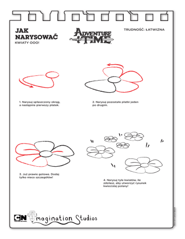 JAK NARYSOWAĆ TRUDNOŚĆ: ŁATWIZNA KWIATY OOO! 1. Narysuj spłaszczony okrąg, a następnie pierwszy płatek. 3. Już prawie gotowe. Dodaj tylko nieco szczegółów! 2. Narysuj pozostałe płatki jeden po drugim. 4. Narysuj tyle kwiatów, ile zdołasz, aby utworzyć rysunek kwiecistej polany!