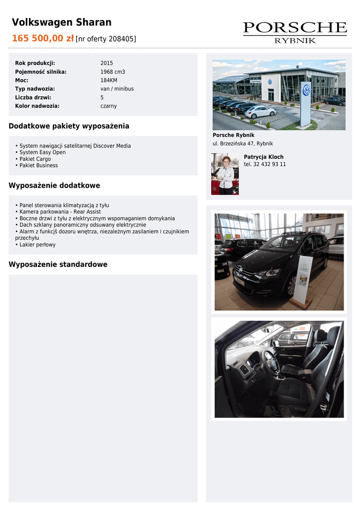 Volkswagen Sharan 165 500,00 zł [nr oferty 208405] Rok produkcji: 2015 Pojemność silnika: 1968 cm3 Moc: 184KM Typ nadwozia: van / minibus Liczba drzwi: 5 Kolor nadwozia: czarny Dodatkowe pakiety wyposażenia Porsche Rybnik • System nawigacji satelitarnej Discover Media • System Easy Open • Pakiet Cargo • Pakiet Business Wyposażenie dodatkowe • Panel sterowania klimatyzacją z tyłu • Kamera parkowania - Rear Assist • Boczne drzwi z tyłu z elektrycznym wspomaganiem domykania • Dach szklany panoramiczny odsuwany elektrycznie • Alarm z funkcjš dozoru wnętrza, niezależnym zasilaniem i czujnikiem przechyłu • Lakier perłowy Wyposażenie standardowe ul. Brzezińska 47, Rybnik Patrycja Kloch tel. 32 432 93 11 • ABS - system zapobiegający blokowaniu się kół podczas hamowania • Airbag 6 sztuk (czołowe poduszki kierowcy i pasażera, boczne poduszki przód, kurtyny powietrzne) • ASR - system zapobiegający poślizgowi kół podczas przyspieszania • Asystent siły hamowania • Automatyczne włączanie świateł awaryjnych w przypadku nagłego hamowania • Chromowane listwy na osłonie chłodnicy • Czujnik ciśnienia w oponach • Czujnik deszczu • Czujnik zmierzchu - automatyczne włączanie świateł z funkcją Coming/Leaving Home • Dywaniki materiałowe z przodu i z tyłu • EDS - elektroniczna blokada mechanizmu różnicowego • Elektromechaniczny hamulec postojowy z funkcją Auto-Hold • ESP (elektroniczny system stabilizacji toru jazdy z ABS, ASR, EDS, MSR i asystentem siły hamowania) • Felgi aluminiowe 17 Sydney z ogumieniem samouszczelniającym 225/50 • Fotel pasażera - składane oparcie • Fotele przednie - podgrzewane • Fotele przednie Sport-Komfort • Fotele przednie z regulacją lędźwiową oraz pochylenia oparcia, dla kierowcy elektryczna regulacja • Gniazdo 12V w bagażniku • Immobilizer • Kierownica wielofunkcyjna 3-ramienna w skórze z funkcją zmiany biegów i dźwignia zm. biegów w skórze • Klimatyzacja automatyczna Climatronic - 3 strefowa • Kolumna kierownicy regulowana w dwóch płaszczyznach • Komputer pokładowy MFA Premium • Lakier uni • Lampy tylne wykonane w technologii LED (diodowe) • Listwy dookoła szyb bocznych, chromowane • Lusterka boczne elektrycznie regulowane i ogrzewane, po stronie kierowcy asferyczne • Lusterka make-up w osłonach przeciwsłonecznych z przodu, podświetlane • Lusterko wsteczne przyciemniające się automatycznie • MSR- układ przeciwblokujący przy hamowaniu silnikiem • Ogrzewane dysze spryskiwaczy szyby przedniej • Oświetlenie ambiente • Oświetlenie LED tablicy rejestracyjnej • Oświetlenie przestrzeni wokół nóg z przodu i z tyłu • Oświetlenie wnętrza z opóźnionym wyłączaniem i funkcją przyciemniania, dwie lampki do czytania • Przedni podłokietnik regulowany wzdłużnie ze schowkiem • Radio CD/MP3/SD/AUX Composition Colour z 5 calowym kolorowym ekranem dotykowym + 8 głośników • Relingi dachowe - chromowane • Roleta przestrzeni bagażowej z możliwością demontażu • Schowek w konsoli dachowej - podwójny, zamykany • Schowek w konsoli środkowej z przodu z 2 miejscami na napoje i gniazdem 12V, zamykany żaluzją • Schowek w konsoli środkowej z przodu z 2 miejscami na napoje, zamykany żaluzją • Schowki w podłodze bagażnika • Schowki w podłodze za przednimi fotelami • Siedzenia z tyłu, pojedyncze, przesuwane z funkcją łatwego składania EasyFold • Stoliki i kieszenie w oparciach foteli przednich • Sygnalizacja niskiego stanu płynu do spryskiwaczy • System stabilizacji toru jazdy przyczepy • System Start-Stop wyłączający silnik podczas postoju z rekuperacją energii podczas hamowania • System wykrywania zmęczenia kierowcy • Szuflady pod siedzeniami kierowcy i pasażera • Szyby termoizolujące • Światła przeciwmgielne z funkcją doświetlania skrętu • Tapicerka łączona Alcantara/Vienna • Tempomat z automatyczną regulacją odległości (do 160km/h) ACC i systemem Front Assist • Uchwyty ISOFIX do instalacji fotelika dziecięcego na siedzeniach w drugim rzędzie • Wspomaganie kierownicy, elektromechniczne, zależne od prędkości • Wykońzenie wnęrza Piano Black • Wyłącznik poduszki powietrznej • XDS - elektroniczna blokada mechanizmu różnicowego • Zabezpieczenie przed otwarciem tylnych drzwi i okien - elektryczne • Zamek centralny z pilotem • Zderzaki, obudowy lusterek zewnętrznych i klamki lakierowane w kolorze nadwozia Informacje dodatkowe Dzień dobry, Witamy w PORSCHE RYBNIK autoryzowanym salonie i serwisie marki Volkswagen. Należymy do międzynarodowej organizacji Porsche Inter Auto zajmującej się sprzedażą samochodów w całej Europie. Oferujemy Klientom profesjonalną i kompleksową obsługę w szerokim zakresie, proponując rozwiązania dostosowane do każdej grupy Klientów PORSCHE RYBNIK Rybnik, ul. Brzezińska 47 | tel.: 32 423 00 00 | Najlepsze ceny i największy wybór samochodów Mamy przyjemność zaproponować Państwu szeroki asortyment samochodów osobowych marki Volkswagen na atrakcyjnych warunkach cenowych. Dostępne, atrakcyjne sposoby sfinansowania zakupu samochodu pozwolą Państwu szybko cieszyć się nowym, wymarzonym Volkswagenem. Jeżeli aktualnie posiadacie Państwo samochód, dla którego poszukujecie nabywcy chętnie pomożemy w jego sprzedaży. Prowadzimy skup i sprzedaż samochodów używanych. Samochód nowy bez przebiegu zarejestrowany na dealera.