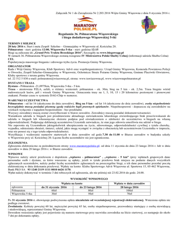 Załącznik Nr 1 do Zarządzenia Nr 2.203.2016 Wójta Gminy Wiązowna z dnia 8 stycznia 2016 r. Regulamin 36. Półmaratonu Wiązowskiego i biegu dodatkowego Wiązowskiej 5-tki TERMIN I MIEJSCE 28 luty 2016 r. Start i meta Zespół Szkolno – Gimnazjalny w Wiązownie ul. Kościelna 20. Półmaraton - start: godzina 12:00, Wiązowska 5-tka - start: godzina 12:15 Biegi są zaliczane do „Grand Prix Traktu Brzeskiego 2016”. Szczegóły na www.biegowegp.pl W ramach 36. Półmaratonu Wiązowskiego zostaną rozegrane IV Mistrzostwa Polski Służby Celnej (informacji udziela Służba Celna) CEL Popularyzacja masowego biegania i zdrowego trybu życia. Promocja Gminy Wiązowna. ORGANIZATOR Rada i Wójt Gminy Wiązowna, Klub Sportowy Advit oraz współorganizatorzy: Urząd Gminy Wiązowna, Komenda Powiatowa Policji w Otwocku, Zespół Szkolno-Gimnazjalny w Wiązownie, Ochotnicze Straże Pożarne Gminy Wiązowna, Gminne Placówki Oświatowe, Kluby sportowe z terenu gminy Wiązowna. tel. 22 512 5 830 e-mail: [email protected], strona: www.tuwiazowna.pl, www.wiazownapolmaraton.pl DYSTANS I TRASA Dystans - Półmaraton -21,0975km, Wiązowska 5-tka - 5 km. Trasa - atestowana PZLA, asfalt, o różnicy wzniesień: półmaraton - ok. 30m, bieg na 5 km - ok. 2,5m. Trasa biegnie wśród malowniczych lasów, pól i wiosek Gminy Wiązowna. Oznaczenia trasy na 1, 5, 10, 15 i 20 kilometrze poziomymi i pionowymi znakami. Pomiar czasu w systemie DAG-Chip w numerze. WARUNKI UCZESTNICTWA Półmaraton - od lat 16 (ukończone do dnia zawodów), Bieg na 5 km - od lat 14 (ukończone do dnia zawodów), osoby niepełnoletnie bezwzględnie muszą posiadać pisemną zgodę rodziców bądź prawnych opiekunów. Niepełnosprawni - dopuszcza się zawodników na wózkach wyłącznie z napędem bezpośrednim - bez przekładni. Wszyscy zawodnicy muszą zostać zweryfikowani w biurze zawodów. Zawodnicy muszą posiadać dokument tożsamości. Warunkiem udziału w biegach jest przedstawienie aktualnego zaświadczenia lekarskiego stwierdzającego brak przeciwwskazań do udziału w biegach lub własnoręczne złożenie podpisu pod oświadczeniem o zdolności do uczestnictwa w biegach na własną odpowiedzialność. Podpisując deklarację uczestnictwa Uczestnik zaświadcza, że stan jego zdrowia umożliwia mu udział w biegu. Nie zapewnia się Uczestnikom jakiegokolwiek ubezpieczenia na życie, zdrowotnego, odpowiedzialności cywilnej z tytułu choroby, wypadku, odniesienia obrażeń, śmierci, szkód, jakie mogą wystąpić w związku z obecnością lub uczestnictwem Uczestnika w imprezie, oraz nie ponosi się z tego tytułu odpowiedzialności. Weryfikacja i wydawanie numerów startowych w dniu zawodów od godz.7.30 do 11.00 w Biurze zawodów w budynku szkoły w Wiązownie przy ul. Kościelnej 20. Łączna liczba uczestników nie jest ograniczona. ZGŁOSZENIA Zgłoszenia elektroniczne za pośrednictwem strony www.maratonypolskie.pl. od dnia 11 stycznia do dnia 23 lutego 2016 r. lub w dniu zawodów w dniu 28 lutego 2016 r. w Biurze zawodów. WPISOWE Wpisowe należy uiścić przelewem z dopiskiem „wpisowe - półmaraton” , „wpisowe - 5 km” (przy wpłatach grupowych dane personalne osób i dystans, za które wnoszone są opłaty, jeżeli w tytule przelewu brak miejsca na podanie danych wszystkich zgłaszanych uczestników, należy podać liczbę uczestników zgłaszanych na poszczególne biegi, a ich dane personalne przesłać pocztą elektroniczną w dniu dokonania przelewu). Wpłaty na konto: Klubu Sportowego Advit Wiązowna ul. Sportowa 15, 05-462 Wiązowna, Bank PKO SA 93 1240 2119 1111 0010 6626 1170. Wpłat należy dokonywać w terminie 3 dni roboczych od zgłoszenia, ale nie później niż 23.02.2016 do godz. 24.00. WYSOKOŚĆ WPISOWEGO zgłoszenia Półmaraton Wiązowska 5-tka Wpłata na konto do 31 stycznia 2016 do 23 lutego 2016 60zł 80zł 30zł 50zł Wpłata w dniu zawodów 28 lutego 2016 100zł 70zł Po 31 stycznia 2016 r. obowiązuje podwyższona opłata niezależnie od wcześniejszej rejestracji elektronicznej. Wniesiona opłata nie podlega zwrotowi. Zwolnienia: Kobiety powyżej 60 lat, mężczyźni powyżej 65 lat, osoby niepełnosprawne, przewodnicy startujący z osobą niewidzącą i niedowidzącą, reprezentanci Gminy Wiązowna. Dowodem wniesienia opłaty jest pojawienie się numeru startowego przy nazwisku zawodnika na liście startowej, co następuje do około 7 dni po dokonaniu opłaty. FAKTURY Dla podmiotów prowadzących działalność gospodarczą będą wystawiane faktury VAT, wobec czego należy wskazać kompletne dane, w tym NIP nabywcy. Osoby fizyczne nie prowadzące działalności gospodarczej mogą otrzymać fakturę, jeżeli wyrażą takie życzenie w formularzu zgłoszeniowym oraz podadzą dane niezbędne do wystawienia faktury (imię i nazwisko, adres). Faktury za wpisowe wpłacone do końca stycznia zostaną wysłane za pośrednictwem poczty zwykłym listem. Faktury wystawione za wpisowe wpłacone po 31 stycznia 2016 r. będą do odbioru w Biurze zawodów w dniu imprezy. KLASYFIKACJA Półmaraton - GENERALNA K i M oraz w kategoriach wiekowych K,M-20 (16-29 lat), K,M-30 (30-39 lat), K,M-40 (40-49 lat), K,M50 (50-59 lat), K,M-60 (60-69 lat), K,M-70 (70-79 lat), K,M- 80 (80 lat i więcej). O przynależności do kategorii wiekowej decyduje rok urodzenia. Nie jest prowadzona oddzielna klasyfikacja osób niepełnosprawnych. Bieg na 5km - GENERALNA K i M. NAGRODY Półmaraton: - Premie finansowe za miejsca K, M I - 1.600zł, K, M II - 1.100zł, K, M III - 760zł, K, M IV - 500zł, K, M V - 300zł, K, M VI - 200zł (nagrody finansowe powyżej 760zł podlegają opodatkowaniu) oraz dyplomy, puchary i medale za miejsca I-III, upominki: dla najstarszego zawodnika K i M oraz reprezentanta Gminy Wiązowna, który najszybciej pokona trasę. W kategoriach wiekowych za miejsca I-III dyplomy i upominki. Nagrody w klasyfikacjach wiekowych pokrywają się z nagrodami w klasyfikacji generalnej. Dla wszystkich