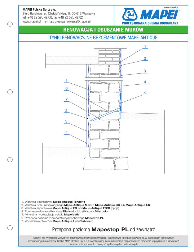 MAPEI Polska Sp. z o.o. Biuro Handlowe: ul. Chałubińskiego 8, 00-613 Warszawa tel. +48 22 595 42 00, fax +48 22 595 42 02 www.mapei.pl e-mail: [email protected] RENOWACJA I OSUSZANIE MURÓW TYNKI RENOWACYJNE BEZCEMENTOWE MAPE-ANTIQUE 1 2 3 1 6 4 5 7 2 3 4 1. Warstwa podkładowa Mape-Antique Rinzaffo 2. Warstwa tynku renowacyjnego Mape-Antique MC lub Mape-Antique CC lub Mape-Antique LC 3. Warstwa szpachlowa Mape-Antique FC lub Mape-Antique FC/R (opcja) 4. Powłoka malarska silikonowa Silancolor lub silikatowa Silexcolor 5. Mineralna hydroizolacja cokołu Mapelastic 6. Przepona pozioma z preparatu hydrofobowego Mapestop PL 7. Wypełnienie otworów Mape-Antique I lub Stabilcem Przepona pozioma Mapestop PL od zewnątrz Rysunek nie wyczerpuje wszystkich aspektów technicznych rozwiązania. Szczegółowe informacje zawarte są w instrukcjach technicznych proponowanych materiałów. Spółka MAPEI Polska Sp. z o.o. wyraża zgodę na zamieszczanie proponowanych rozwiazań w projektach budowlanych z zastrzeżeniem prawa do rozwiązań systemowych i materiałowych.