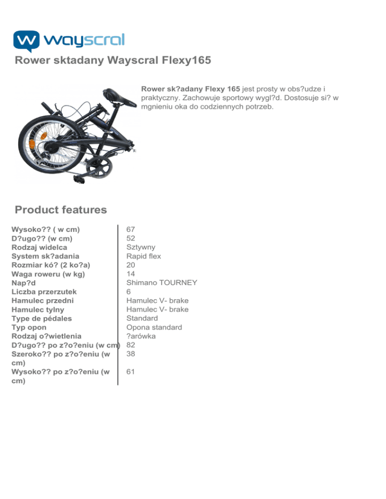 Rower sktadany Wayscral Flexy165 Rower sk?adany Flexy 165 jest prosty w obs?udze i praktyczny. Zachowuje sportowy wygl?d. Dostosuje si? w mgnieniu oka do codziennych potrzeb. Product features Wysoko?? ( w cm) D?ugo?? (w cm) Rodzaj widelca System sk?adania Rozmiar kó? (2 ko?a) Waga roweru (w kg) Nap?d Liczba przerzutek Hamulec przedni Hamulec tylny Type de pédales Typ opon Rodzaj o?wietlenia D?ugo?? po z?o?eniu (w cm) Szeroko?? po z?o?eniu (w cm) Wysoko?? po z?o?eniu (w cm) Powered by TCPDF (www.tcpdf.org) 67 52 Sztywny Rapid flex 20 14 Shimano TOURNEY 6 Hamulec V- brake Hamulec V- brake Standard Opona standard ?arówka 82 38 61