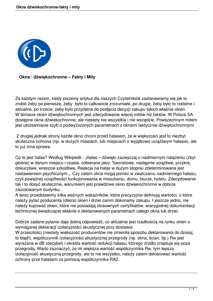 Okna dźwiekochronne-fakty i mity Okna dźwiękochronne – Fakty i Mity Za każdym razem, kiedy piszemy artykuł dla naszych Czytelników zastanawiamy się jak to zrobić żeby po pierwsze, żeby było to całkowicie zrozumiałe, po drugie, żeby było to rzetelne i aktualne, po trzecie, żeby było przydatne do podjęcia decyzji zakupu takich właśnie okien. W temacie okien dźwiękochronnych jest zdecydowanie więcej mitów niż faktów. W Polsce SA dostępne okna dźwiekochronne, ale niestety nie wszystkie i nie wszędzie. Powszechnym mitem jest utożsamianie szyb o podwyższonych parametrach z oknami faktycznie dźwiękochronnymi. Z drugiej jednak strony każde okno chroni przed hałasem, że w większości jest to niezbyt skuteczna ochrona (np. w dużych miastach, lub miejscach o wyjątkowo uciążliwym hałasie), ale to już inna sprawa. Co to jest hałas? Według Wikipedii : „Hałas – dźwięki zazwyczaj o nadmiernym natężeniu (zbyt głośne) w danym miejscu i czasie, odbierane jako: "bezcelowe, następnie uciążliwe, przykre, dokuczliwe, wreszcie szkodliwe. Reakcja na hałas w dużym stopniu zdeterminowana jest nastawieniem psychicznym „. Czy zatem okna mogą pomóc w zwalczaniu nadmiernego hałasu, czyli poważnej uciążliwości funkcjonowania w mieszkaniu, domu, biurze, hotelu. Zdecydowanie tak i to dosyć skutecznie, warunkiem jest prawdziwe okno dźwiękochronne w dobrze zaizolowanym budynku. A teraz przedstawimy kilka ważnych wskaźników, które precyzyjnie definiują wartości, o które należy pytać producenta (dilera) okien i drzwi zanim dokonamy zakupu. I jeszcze jedno, nie należy kupować okien, które nie posiadają stosownych certyfikatów, wiarygodnej dokumentacji technicznej świadczącej właśnie o deklarowanych parametrach całego okna lub drzwi. Dobrze zadane pytanie daje dobrą odpowiedź, co aktualnie jest rzadkością na rynku okien o wymaganej deklaracji izolacyjności akustycznej przy dostawie. W przeszłości (niestety większość producentów nie zmieniła sposobu deklarowania do dzisiaj, to błąd!), współczynnik izolacyjności akustycznej przegrody (np. okna, ścian, itp.) Rw jest wyrażana w dB (decybel) i określa wartość redukcji hałasu, którego źródło znajduje się poza przegrodą. Warto zaznaczyć, że im większa wartość współczynnika Rw, tym lepsza izolacyjność akustyczna przegrody, ale to nie wszystko, należy zatem deklarować wartość ochrony prze hałasem za pomocą współczynnika RA2. 1/4 Okna dźwiekochronne-fakty i mity Oto detale. Podstawowym wskaźnikiem do oceny izolacyjności akustycznej właściwej ścian zewnętrznych jest wskaźnik RA2. Norma PN-B-02151-03:1999 [18] podobnie jak norma PN-87/B-02151/03 [17] uzależnia wymagany wskaźnik RA2 od przeznaczenia budynku i hałasu w otoczeniu budynku, z tym, że hałas zewnętrzny określony jest za pomocą tzw. poziomu miarodajnego, uwzględniającego między innymi wartości poziomów maksymalnych. Wymagane wartości wskaźników RA2 oceny wypadkowej izolacyjności akustycznej ściany zewnętrznej są następujące: RA2 = 23, 28, 33, 38 (dB) Ocenę izolacyjności akustycznej ściany zewnętrznej przeprowadza się na podstawie porównania wartości odpowiednich wskaźników izolacyjności akustycznej danego rozwiązania, określonych w warunkach laboratoryjnych z wartościami wymaganymi (według odpowiedniej normy PN) dla danego obiektu, uwzględniając zasady podane w tych normach. Według normy PN-87/B-02151/03 [17] do porównania przyjmuje się bezpośrednio wartość wskaźnika Rw. Według normy PN-B-02151-03:1999 [18] wartość wskaźnika RA2 zmniejszana jest o 2 dB i dopiero po takiej korekcji stanowi ona podstawę do oceny akustycznej danego rozwiązania w stosunku do wymagań normowych. Rw - średni ważony wskaźnik izolacyjności akustycznej C - wskaźnik adaptacyjny stosowany w wypadku hałasu pochodzącego od takich źródeł hałasu jak, boisko , od palców zabaw, szkół, transportu kolejowego, transportu na dr bawiącymi się dziećmi, szybko przejeżdżające pociągi, lotnisko, itp. Ctr - wskaźnik adaptacyjny stosowany w przypadku hałasu związanego z ruchem ulicznym Problemem inwestorów budujących budynki w obszarach o znanym poziomie hałasu jest deklaracja producenta co do wartości wskaźników izolacyjności akustycznej od oferentów na dostawę okien. Zgodnie z prawem budowlanym producent deklaruje parametry wyrobu budowlanego, czyli okna. Należy jednak podkreślić, że producent okna nie może być odpowiedzialny za parametr, jaki ma przegroda zewnętrzna z oknem zamontowanym w konkretnym obiekcie. Do zadań architekta należy dobór okna o odpowiednim parametrze uwzględniając powierzchnię okna w stosunku do części nieprzeszklonej oraz określenie warunków montażu, a także dostosowanie typu okna do obciążenia hałasem środowiskowym w miejscu lokalizacji budynku. W projekcie wykonawczym stosowne dane co do wymaganej deklaracji wskaźnika izolacyjności akustycznej powinny być integralną częścią zestawienia stolarki. W przypadku takich klasycznych technologii wznoszenia budynków jak ceramika, różnica pomiędzy wartością deklarowaną a wartością uzyskiwaną ostatecznie na obiekcie może wynieść nawet do 6 dB. W dobrze zaprojektowanym budynku korekta warunków obiektowych powinna być maksymalnie na poziomie 2-3 dB różnicy. Przykładowo jeśli mamy otrzymać okno 2/4 Okna dźwiekochronne-fakty i mity o wskaźniku izolacyjności akustycznej np. R’A2 na poziomie 30 dB, należy zamówić okno o wskaźniku RA2 wynoszącym od 32 do 33 dB. Problemów z deklaracją dostawców okien jest wiele. Większość trudności wynika z nieznajomości podstaw akustyki w architekturze. Określenie wskaźnika izolacyjności akustycznej od dźwięków powietrznych całej przegrody zewnętrznej odbywa się według następującego wzoru: R’A2 = Lobc – Lwym (dB) gdzie R’A2 – wymagana wartość wskaźnika izolacyjnoś
