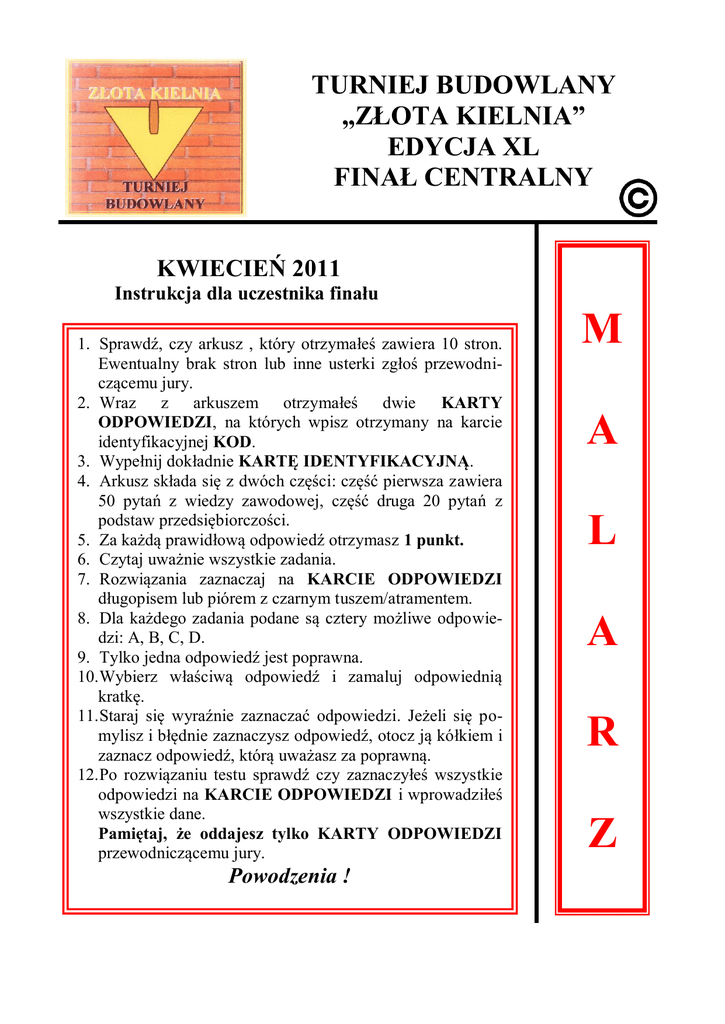 TURNIEJ BUDOWLANY „ZŁOTA KIELNIA” EDYCJA XL FINAŁ CENTRALNY KWIECIEŃ 2011 Instrukcja dla uczestnika finału 1. Sprawdź, czy arkusz , który otrzymałeś zawiera 10 stron. Ewentualny brak stron lub inne usterki zgłoś przewodniczącemu jury. 2. Wraz z arkuszem otrzymałeś dwie KARTY ODPOWIEDZI, na których wpisz otrzymany na karcie identyfikacyjnej KOD. 3. Wypełnij dokładnie KARTĘ IDENTYFIKACYJNĄ. 4. Arkusz składa się z dwóch części: część pierwsza zawiera 50 pytań z wiedzy zawodowej, część druga 20 pytań z podstaw przedsiębiorczości. 5. Za każdą prawidłową odpowiedź otrzymasz 1 punkt. 6. Czytaj uważnie wszystkie zadania. 7. Rozwiązania zaznaczaj na KARCIE ODPOWIEDZI długopisem lub piórem z czarnym tuszem/atramentem. 8. Dla każdego zadania podane są cztery możliwe odpowiedzi: A, B, C, D. 9. Tylko jedna odpowiedź jest poprawna. 10. Wybierz właściwą odpowiedź i zamaluj odpowiednią kratkę. 11. Staraj się wyraźnie zaznaczać odpowiedzi. Jeżeli się pomylisz i błędnie zaznaczysz odpowiedź, otocz ją kółkiem i zaznacz odpowiedź, którą uważasz za poprawną. 12. Po rozwiązaniu testu sprawdź czy zaznaczyłeś wszystkie odpowiedzi na KARCIE ODPOWIEDZI i wprowadziłeś wszystkie dane. Pamiętaj, że oddajesz tylko KARTY ODPOWIEDZI przewodniczącemu jury. Powodzenia ! M A L A R Z I . WIEDZA ZAWODOWA 1. Al. fresco secco oznacza A) malowanie na świeżym tynku, B) malowanie na pół wyschniętym tynku, C) „dziobanie” świeżego tynku, D) proces utwardzania zaprawy. 2. Polikondensacja to A) gromadzenie się związków soli na powierzchni tynku, B) gromadzenie się pary wodnej na powierzchni ściany, C) pęcznienie drewna na skutek wysokiej wilgotności, D) tworzenie wielocząstkowej struktury chemicznej w wyniku reakcji między składnikami spoiwa. 3. Ług potasowy stosujemy do: A) zmiękczania powłok, B) odrdzewiania powłok, C) usuwania starych powłok, D) odtłuszczania podłoża. 4. Mieszanina przeznaczona do wygładzenia podłoża, składająca się ze spoiwa, wypełniaczy i pigmentu to: A) kit, B) zaprawa, C) gruntownik, D) szpachlówka. 5. Do właściwości mechanicznych materiałów budowlanych zaliczamy: A) przewodność cieplną, B) gęstość pozorną, C) ścieralność, D) szczelność. 6. Substancję powłokotwórczą tworzącą cienką warstwę na powierzchni podłoża nazywamy: A) flautem, B) pigmentem, C) rozcieńczalnikiem, D) spoiwem. 7. Zdolność krycia to fizyczna właściwość: A) cieczy upłynniającej, B) pigmentu, C) spoiwa, D) wypełniacza. 8. Proces utwardzania się spoiw ftalowych schnących na powietrzu przebiega A) w jednej fazie, B) w dwóch fazach, C) w trzech fazach, D) w czterech fazach. 9. Aparat Du Ponta służy do badania: A) elastyczności , B) odporności na uderzenie, C) odporności na zarysowanie, D) przyczepności. 10. Jeżeli po pięciokrotnym potarciu powłoki miękką tkaniną nie występują na tkaninie zanieczyszczenia to znaczy, że powłoka jest: A) odporna ścieranie , B) odporna na uderzenia, C) odporna na światło, D) odporna na zmywanie. 11. Do pomalowania dwukrotnie farbą emulsyjną ściany o powierzchni 40 m2, przy orientacyjnym zużyciu do jednokrotnego malowania 0,125 l/m2, należy kupić: A) 5 l farby, B) 6 l farby, C) 8 l farby, D) 10 l farby. 12. Malarz pomalował ścianę o wymiarach 10 m długości i 2,5 m wysokości farbą emulsyjną. Cena pomalowania 1 m2 ściany wynosi 7,00 zł. Należność za wykonaną pracę wynosi: A) 175,00 zł, B) 200,00 zł, C) 250,00 zł, D) 300,00 zł. 13. W pomieszczeniach z otworami okiennymi i drzwiowymi, malowanymi techniką wapienną i klejową wraz z nadprożami i ościeżami otworów, przy wykonywaniu obmiarów nie potrąca się otworów: A) które mają ościeżnice, B) powierzchni do 3,0 m2, C) nie posiadających parapetu, D) powierzchni do 1,0 m2. 36. Powłoki olejne można wykonywać na podłożu drewnianym, jeżeli jego wilgotność nie przekracza: A) 3 %, B) 5 %, C) 5 10 %, D) 8 12 %. 37. Szkło wodne potasowe jest składnikiem farby: A) klejowej, B) krzemianowej, C) emulsyjnej, D) olejnej. 16. Rysunek obok przedstawia oznaczenie graficzne tapety o: A) dostatecznej światłoodporności, B) wysokiej światłoodporności, C) braku światłoodporności, D) słonecznym wzorze. 17. Podział tapet na zwykłe, wodoodporne i zmywalne to podział ze względu na: A) wzornictwo, B) fakturę powierzchni licowej, C) właściwości użytkowe, D) rodzaj papieru. 18. Oblicz ile rolek tapety trzeba zużyć do tapetowania ścian o powierzchni 80 m2 przyjmując nadmiar na ubytki w wysokości 6% i zakładając, że jedna rolka ma powierzchnię 5,3 m2. A) 6 rolek, B) 8 rolek, C) 12 rolek, D) 16 rolek. 19. Jeśli w projekcie przedstawiono rzut kondygnacji powtarzalnej w skali 1:100, a należy go powiększyć, to w jakiej skali powinien być przedstawiony?? A) 1:50, B) 1:300, C) 1:500, D) 1:1000. 20. Motowidło to: A) przymiar do ustalania wysokości faset, B) przymiar taśmowy, C) pion malarski, D) deseczka do sznura malarskiego. 21. Ściany dużego pokoju usytuowanego od strony północnej pomalowano farbą o barwie jasnożółtej. Którą z poniższych zasad doboru barw uwzględniono? A) pokoje powinno się malować barwami w tonacjach jasnych, B) pokoje powinno się malować barwami w tonacjach pełnych, C) pomieszczenia mieszkalne powinno się malować barwami matowymi, D) pomieszczenia o małym nasłonecznieniu powinno się malować barwami w tonacjach jasnych 22. Rysunek obok przedstawia kolejne fazy naprawy pękniętego tynku. Cyfrą „3” na rysunku oznaczono: A) rysę, B) tynk nasycony wodą, C) zaprawę tynkarską, D) drugą warstwę zaprawy. 23. Zmniejszenie nasiąkliwości tynków nie przeznaczonych do malowania (np.. zewnętrznych tynków szlachetnych) możemy osiągnąć przez: A) gruntowanie , B) impregnowanie, C) flautowanie, D) ługowanie. 24. Najprostsza farba wapienna składa się z: A) 20% ciasta wapiennego i 80% wody, B) 30% ciasta