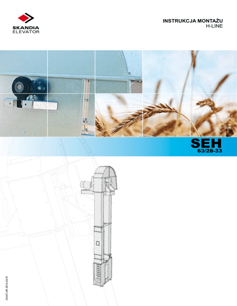 INSTRUKCJA MONTAŻU H-LINE SEH ZMA016PL 2016-04-01 63/28-33 Informacje na temat dostawy Sprawdzenie towaru Sprawdzić, czy liczba paczek jest zgodna z dokumentem przewozowym, a także czy opakowanie i towar są nieuszkodzone. Odnotować ewentualne uszkodzenia oraz brakujące materiały na dokumencie przewozowym i powiadomić o tym firmę przewozową oraz producenta. Po rozpakowaniu towaru sprawdzić, czy dostawa jest kompletna. Materiałów będących w stanie uszkodzonym nie wolno montować. Gwarancja Wszystkie modele maszyn wyprodukowane przez firmę Skandia Elevator AB są objęte 2-letnią gwarancją producenta, której okres liczy się od daty dostawy. Warunkiem ważności gwarancji i uwzględnienia ewentualnych roszczeń odszkodowawczych jest skontaktowanie się z firmę Skandia Elevator AB oraz uzgodnienie między klientem a firmą Skandia Elevator AB sposobu usunięcia ewentualnych usterek. Gwarancja obejmuje elementy, które uległy uszkodzeniu lub zepsuły się na skutek wad konstrukcyjnych lub produkcyjnych. Usterki i uszkodzenia spowodowane nieprawidłowym montażem lub użytkowaniem albo brakiem konserwacji nie są objęte gwarancją. Oznaczenie CE Oznaczenie CE znajduje się po stronie przekładni głowicy podnośnika i potwierdza fakt, że urządzenie zostało wyprodukowane zgodnie z dyrektywą maszynową UE i spełnia wymagania dotyczące bezpieczeństwa. Na oznaczeniu CE podano rok produkcji, oznaczenie typu i numer zamówienia. Przy składaniu reklamacji i zamawianiu części zamiennych należy zawsze podać numer zamówienia. Deklaracja zgodności WE Skandia Elevator AB Arentorp S-53494 Vara SWEDEN oświadcza na własną odpowiedzialność, że produkt: SEH numer zamówienia: ................................................................................................................................................................................................ objęty niniejszą deklaracją jest zgodny z Dyrektywą Rady nr 2006/42/WE z dnia 29 grudnia 2009 roku w sprawie zbliżenia ustawodawstw Państw Członkowskich odnoszących się do maszyn. O ile na oznaczeniu CE nie podano inaczej, produkt został wyprodukowany zgodnie z dyrektywą maszynową UE i zakwalifikowany do kategorii II 2D/0D. Produkt jest przeznaczony do transportu materiałów zgodnie z wymaganiami dla strefy 21 wg dyrektywy ATEX oraz w miejscach, gdzie otoczenie zewnętrzne nie zostało sklasyfikowane. Vara, 29.12.2009 Joakim Larsson, Dyrektor Generalny SKANDIA ELEVATOR – SEH 63/28-33 3 Spis treści Dziękujemy, że wybrali Państwo firmę Skandia Elevator! Do właściwego działania urządzenia transportowego wymagany jest jego prawidłowy montaż i staranna konserwacja. Przestrzeganie zaleceń podanych w niniejszej instrukcji montażu oraz w oddzielnej instrukcji konserwacji jest wymagane dla zachowania ważności gwarancji. Mamy nadzieję, że urządzenie transportowe firmy Skandia będzie służyć Państwu niezawodnie przez długi czas. Prezentacja maszyny....................................................................................................................6 Informacje na temat bezpieczeństwa................................................................7 Ogólne informacje na temat bezpieczeństwa..............................................................................7 Bezpieczeństwo elektryczne............................................................................................................................8 Naklejki dotyczące bezpieczeństwa........................................................................................................9 Przed montażem................................................................................................................................11 Połączenie urządzenia........................................................................................................... 13 Umiejscowienie wlotu.......................................................................................................................................... 13 Połączenie innego urządzenia z podnośnikiem..................................................................... 13 Połączenie podnośnika z przenośnikiem...................................................................................... 13 Montaż urządzenia........................................................................................................................ 14 Koryta.................................................................................................................................................................................... 14 Głowica podnośnika.............................................................................................................................................. 15 Hamulec............................................................................................................................................................................. 16 Pas kubełkowy............................................................................................................................................................. 17 Kubełki................................................................................................................................................................................. 19 Środkowanie pasa kubełkowego.............................................................................................................20 Czujnik położenia pasa...................................................................................................................................... 21 Regulacja płyty przeciwrozpryskowej.................................................................................................22 Osłona podnośnika................................................................................................................................................22 Czujnik o