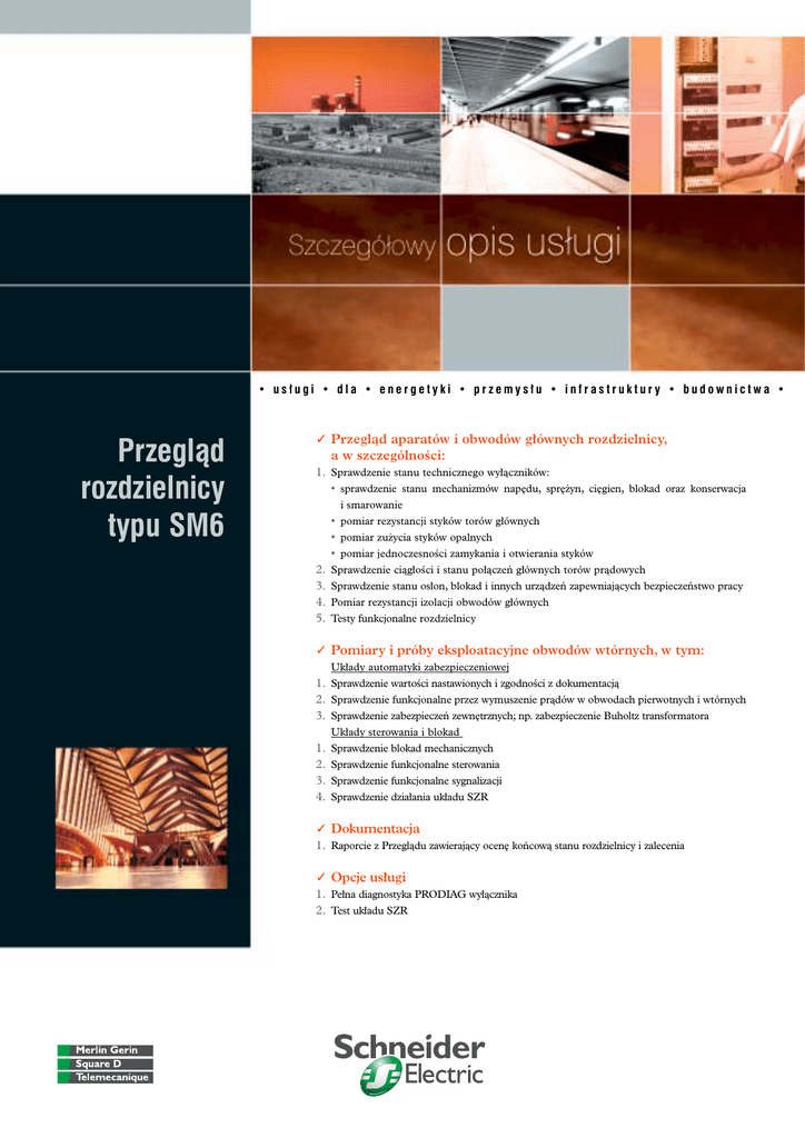• us∏ugi • dla • energetyki • przemys∏u • infrastruktury • budownictwa • Przeglàd rozdzielnicy typu SM6 ✓ Przeglàd aparatów i obwodów g∏ównych rozdzielnicy, a w szczególnoÊci: 1. Sprawdzenie stanu technicznego wy∏àczników: • sprawdzenie stanu mechanizmów nap´du, spr´˝yn, ci´gien, blokad oraz konserwacja i smarowanie • pomiar rezystancji styków torów g∏ównych • pomiar zu˝ycia styków opalnych • pomiar jednoczesnoÊci zamykania i otwierania styków 2. 3. 4. 5. Sprawdzenie ciàg∏oÊci i stanu po∏àczeƒ g∏ównych torów pràdowych Sprawdzenie stanu os∏on, blokad i innych urzàdzeƒ zapewniajàcych bezpieczeƒstwo pracy Pomiar rezystancji izolacji obwodów g∏ównych Testy funkcjonalne rozdzielnicy ✓ Pomiary i próby eksploatacyjne obwodów wtórnych, w tym: Uk∏ady automatyki zabezpieczeniowej 1. Sprawdzenie wartoÊci nastawionych i zgodnoÊci z dokumentacjà 2. Sprawdzenie funkcjonalne przez wymuszenie pràdów w obwodach pierwotnych i wtórnych 3. Sprawdzenie zabezpieczeƒ zewn´trznych; np. zabezpieczenie Buholtz transformatora 1. 2. 3. 4. Uk∏ady sterowania i blokad Sprawdzenie blokad mechanicznych Sprawdzenie funkcjonalne sterowania Sprawdzenie funkcjonalne sygnalizacji Sprawdzenie dzia∏ania uk∏adu SZR ✓ Dokumentacja 1. Raporcie z Przeglàdu zawierajàcy ocen´ koƒcowà stanu rozdzielnicy i zalecenia ✓ Opcje us∏ugi 1. Pe∏na diagnostyka PRODIAG wy∏àcznika 2. Test uk∏adu SZR • us∏ugi • dla • energetyki • przemys∏u • infrastruktury • budownictwa • Przeglàd rozdzielnicy typu SM6 Czy chcà Paƒstwo mieç pewnoÊç niezawodnoÊci urzàdzeƒ Mogà Paƒstwo polegaç na swoim systemie zasilajàcym ✓Uzyskacie Paƒstwo pe∏nà wiedz´ na temat faktycznego stanu urzàdzeƒ, zaplanujecie remonty i zminimalizujecie ryzyko nieplanowanych przerw produkcyjnych. i ciàg∏oÊci zasilania? ✓Dzi´ki przeglàdom okresowym mo˝ecie Paƒstwo liczyç na swój system zasilajàcy i koncentrowaç si´ na podstawowej dzia∏alnoÊci przedsi´biorstwa. ✓Pami´tajmy, ˝e Artyku∏ 61 i 62 Ustawy Prawo Budowlane nak∏ada na w∏aÊciciela lub zarzàdc´ obiektu budowlanego obowiàzek okresowych kontroli stanu sprawnoÊci technicznej ca∏ego obiektu, z naciskiem na badania instalacji elektrycznych. ✓Serwis Schneider Electric, dostawcy aparatury elektrycznej, dysponuje pe∏nà wiedzà, narz´dziami i procedurami do wykonania przeglàdu i jest do Paƒstwa dyspozycji. ✓Wysoka jakoÊç us∏ug i wykorzystanie oryginalnych cz´Êci zamiennych to gwarancja niezawodnoÊci ca∏ej instalacji. ✓Uk∏ady zabezpieczeƒ w rozdzielni elektrycznej czuwajà nieprzerwanie i chronià instalacj´ przed skutkami zwarç i innych zdarzeƒ. Weryfikujcie Paƒstwo ich sprawnoÊç nie czekajàc na awari´.