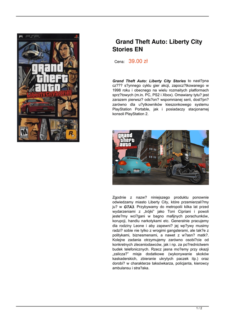 Grand Theft Auto: Liberty City Stories EN Cena: 39.00 zł Grand Theft Auto: Liberty City Stories to nast?pna cz??? s?ynnego cyklu gier akcji, zapocz?tkowanego w 1998 roku i obecnego na wielu rozmaitych platformach sprz?towych (m.in. PC, PS2 i Xbox). Omawiany tytu? jest zarazem pierwsz? ods?on? wspomnianej serii, dost?pn? zarówno dla u?ytkowników kieszonkowego systemu PlayStation Portable, jak i posiadaczy stacjonarnej konsoli PlayStation 2. Zgodnie z nazw? niniejszego produktu ponownie odwiedzamy miasto Liberty City, które przemierzali?my ju? w GTA3. Przybywamy do metropolii kilka lat przed wydarzeniami z „trójki” jako Toni Cipriani i powoli jeste?my wci?gani w bagno mafijnych porachunków, korupcji, handlu narkotykami etc. Generalnie pracujemy dla rodziny Leone i aby zapewni? jej wp?ywy musimy radzi? sobie nie tylko z wrogimi gangsterami, ale tak?e z politykami, biznesmenami, a nawet z w?asn? matk?. Kolejne zadania otrzymujemy zarówno osobi?cie od konkretnych zleceniodawców, jak i np. za po?rednictwem budek telefonicznych. Rzecz jasna mo?emy przy okazji „zalicza?” misje dodatkowe (wykonywanie skoków kaskaderskich, zbieranie ukrytych paczek itp.) oraz dorobi? w charakterze taksówkarza, policjanta, kierowcy ambulansu i stra?aka. 1/2 Standardowo developerzy przygotowali mnóstwo odmiennych samochodów, które prowadzimy w trakcie zabawy. Ponadto dost?pne s? jeszcze motocykle, szybkie ?odzie, a tak?e kolej i promy. Nie zapomniano oczywi?cie o zaimplementowaniu szeregu rozmaitych typów uzbrojenia (pistolet, granaty, karabin szturmowy itd.) rodem ze s?ynnych sklepów Ammu-Nation, aby?my nie byli bezbronni w licznych konfrontacjach z przeciwnikami. Warto zauwa?y?, ?e Liberty City sk?ada si? naturalnie z trzech obszernych dzielnic, rozmieszczonych na wyspach, ale bez problemu dostrzegamy pewne ró?nice architektoniczne, maj?ce odzwierciedla? czasowy dystans pomi?dzy wydarzeniami z Liberty City Stories i Grand Theft Auto 3. Zobacz wideo: 2/2 Powered by TCPDF (www.tcpdf.org)