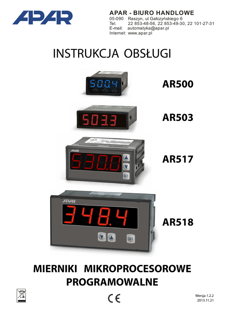 APAR - BIURO HANDLOWE 05-090 Tel. E-mail: Internet: Raszyn, ul Gałczyńskiego 6 22 853-48-56, 22 853-49-30, 22 101-27-31 [email protected] www.apar.pl INSTRUKCJA OBSŁUGI AR500 AR503 AR517 AR518 MIERNIKI MIKROPROCESOROWE PROGRAMOWALNE Wersja 1.2.2 2013.11.21 Dziękujemy za wybór naszego produktu. Niniejsza instrukcja ułatwi Państwu prawidłową obsługę, bezpieczne użytkowanie i pełne wykorzystanie możliwości miernika. Przed montażem i uruchomieniem prosimy o przeczytanie i zrozumienie niniejszej instrukcji. W przypadku dodatkowych pytań prosimy o kontakt z doradcą technicznym. SPIS TREŚCI 1. ZASADY BEZPIECZEŃSTWA................................................................................................................. 2. ZALECENIA MONTAŻOWE................................................................................................................... 3. OGÓLNA CHARAKTERYSTYKA MIERNIKÓW..................................................................................... 4. ZAWARTOŚĆ ZESTAWU........................................................................................................................ 5. DANE TECHNICZNE.............................................................................................................................. 6. WYMIARY OBUDOWY I DANE MONTAŻOWE................................................................................. 7. OPIS LISTEW ZACISKOWYCH I POŁĄCZEŃ ELEKTRYCZNYCH...................................................... 8. ZNACZENIE PRZYCISKÓW. PODGLĄD MINIMUM I MAKSIMUM................................................. 9. WEJŚCIE BINARNE............................................................................................................................... 10. USTAWIANIE PARAMETRÓW KONFIGURACYJNYCH................................................................... 11. MENU SZYBKIEGO DOSTĘPU............................................................................................................ 12. KONFIGURACJA PRACY WYJŚCIA ANALOGOWEGO I ALARMU................................................ 12.1. ZMIANA WARTOŚCI ZADANEJ DLA ALARMU I TRYBU RĘCZNEGO................................ 12.2. WYJŚCIE ANALOGOWE............................................................................................................ 12.3. FUNKCJA STEROWANIA RĘCZNEGO I ZDALNEGO........................................................... 13. SYGNALIZACJA KOMUNIKATÓW I BŁĘDÓW.................................................................................. 14. PODŁĄCZANIE DO KOMPUTERA I DOSTĘPNE OPROGRAMOWANIE...................................... 15. INTERFEJS KOMUNIKACYJNY RS485 (wg EIA RS-485)................................................................. 16. PROTOKÓŁ TRANSMISJI SZEREGOWEJ MODBUS–RTU (SLAVE)............................................... 17. NOTATKI WŁASNE................................................................................................................................ ! Należy zwrócić szczególną uwagę na teksty oznaczone tym znakiem Producent zastrzega sobie prawo do dokonywania zmian w konstrukcji i oprogramowaniu urządzenia bez pogorszenia parametrów technicznych. 2 3 3 3 4 4 5 6 6 7 8 11 11 11 12 12 12 13 14 14 16 1. ZASADY BEZPIECZEŃSTWA ! przed rozpoczęciem użytkowania urządzenia należy dokładnie przeczytać niniejszą instrukcję w celu uniknięcia porażenia prądem elektrycznym bądź uszkodzenia urządzenia montaż mechaniczny oraz elektryczny należy zlecić wykwalifikowanemu personelowi przed włączeniem zasilania należy upewnić się, że wszystkie przewody zostały podłączone prawidłowo przed dokonaniem wszelkich modyfikacji przyłączeń przewodów należy wyłączyć napięcia doprowadzone do urządzenia zapewnić właściwe warunki pracy, zgodne z danymi technicznymi urządzenia (napięcie zasilania, wilgotność, temperatura, rozdział 5) 2. ZALECENIA MONTAŻOWE ! Przyrząd został zaprojektowany tak, aby zapewnić odpowiedni poziom odporności na większość zaburzeń, które mogą wystąpić w środowisku przemysłowym. W środowiskach o nieznanym poziomie zakłóceń zaleca się stosowanie następujących środków zapobiegających ewentualnemu zakłócaniu pracy przyrządu: nie zasilać urządzenia z tych samych linii co urządzenia wysokiej mocy bez odpowiednich filtrów sieciowych stosować ekranowanie przewodów zasilających, czujnikowych i sygnałowych, przy czym uziemienie ekranu powinno być jednopunktowe, wykonane jak najbliżej przyrządu unikać prowadzenia przewodów pomiarowych (sygnałowych) w bezpośrednim sąsiedztwie i równolegle do przewodów energetycznych i zasilających wskazane jest skręcanie parami przewodów sygnałowych dla czujników oporowych w połączeniu 3-przewodowym stosować jednakowe przewody unikać bliskości urządzeń zdalnie sterowanych, mierników elektromagnetycznych, obciążeń wysokiej mocy, obciążeń z fazową lub grupową regulacją mocy oraz innych urządzeń wytwarzających duże zakłócenia impulsowe uziemiać lub zerować metalowe szyny, na których montowane są przyrządy listwowe Przed rozpoczęciem pracy z urządzeniem należy usunąć folię zabezpieczającą okno wyświetlacza LED. 3. OGÓLNA CHARAKTERYSTYKA MIERNIKÓW pomiar temperatury oraz innych wielkości fizycznych (wilgotność, ciśnienie, poziom, prędkość, itp.) przetworzonych na standardowy sygnał elektryczny (0/4÷20mA, 0÷10V, 0÷60mV, 0÷2,5kΩ) 1 uniwersalne wejście pomiarowe (termorezystancyjne, termoparowe i analogowe) z pamięcią minimum i maksimum wielkości mierzonej oraz funkcją zdalnego wyświetlania danych ( poprzez protokół MODBUS-RTU, oprócz AR500) programowalne wejście cyfrowe (oprócz AR500) do zmiany trybu pracy miernika: tryb ręczny/automatyczny dla wyjścia analogowego, blokada klawiatury, zatrzymanie wskazań wyświetlacza (funkcja HOLD) wyjście analogowe (oprócz AR500) 0/4÷2
