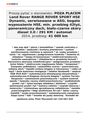 Proszę pytać o stanowisko: POZA PLACEM Land Rover RANGE ROVER SPORT HSE Dynamic, serwisowane w ASO, bogate wyposażenie HSE, min. przebieg 42tyś, panoramiczny dach, biało-czarne skóry diesel 3.0 / 291 KM / automat 2014, przebieg: 41 000 km * abs esp ebd * alarm i immobiliser * zamek centralny z pilotem * poduszki i kurtyny powietrzne * system monitorowania ciśnienia w oponach * el. szyby przednie i tylne * el. regulowane i podgrzewane lusterka * lusterka el. składane * lampy bi-ksenonowe * elektrochromatyczne lusterko wewnętrzne * chłodziarka w przedniej konsoli * kierownica skórzana wielofunkcyjna * podgrzewane przednie i tylne fotele * elektrycznie regulowane fotele * tempomat * komputer pokładowy * podsufitka czarna * panoramiczny szklany dach * łopatki zmiany biegów w kierownicy * radio cd mp3 * duża kolorowa nawigacja * telefon bluetooth * wejście USB iPod AUX * automatyczna klimatyzacja dwustrefowa * automatyczna 8 biegowa skrzynia biegów * system Terrain Response * zawieszenie pneumatyczne * system kontroli zjazdu * hamulec ręczny elektromechaniczny * podłokietnik przód i tył * tylna kanapa składana i dzielona * czujniki parkowania przód i tył * kamera cofania * czujniki deszczu i zmierzchu * ciśnieniowe spryskiwacze reflektorów * światła przeciwmgielne * felgi aluminiowe 20 cali * lakier czarny metalik * szyby przyciemniane * automatycznie zamykana klapa tylna * hak * światła do jazdy dziennej Kontakt do opiekuna auta: Piotr Murawski tel: 519 022 420 1/2 4x4; ABS; ASR; EDS; ESP; alufelgi; autoalarm; centralny zamek; czujnik deszczu; czujniki cofania; el. lusterka; el.szyby; hak; immobiliser; kierownica wielofunkcyjna; klimatyzacja; komputer; ksenony; podgrzewana przednia szyba; podgrzewane fotele; poduszka powietrzna; przyciemniane szyby; radio / CD; reg. wysokość podwozia; skórzana tapicerka; nawigacja; szyberdach; tempomat; wspomaganie kierownicy; światła przeciwmgłowe; relingi dachowe; elektryczne fotele; regulacja wysokości fotela; klimatronik bezwypadkowy; garażowany; pierwszy właściciel; serwisowany w ASO; V6; gwarancja Cena: 289 000 PLN brutto Opiekun: Piotr Murawski +48 519 022 420 Al. Krakowska 178, Punkt A 2/2