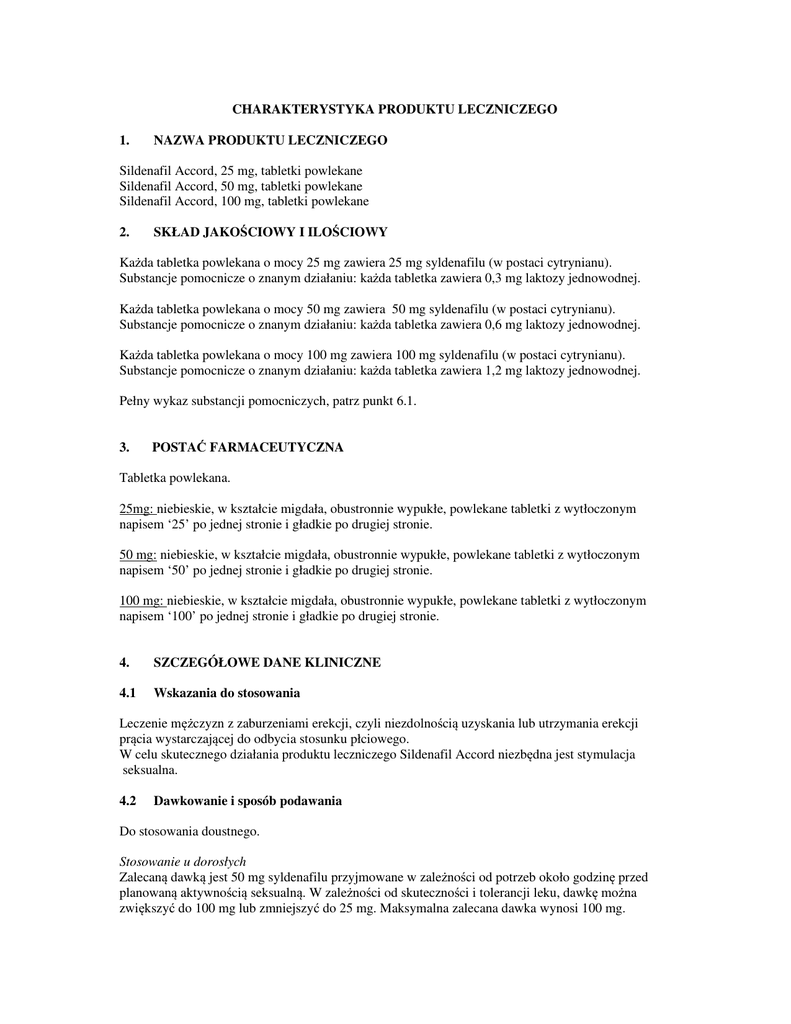 CHARAKTERYSTYKA PRODUKTU LECZNICZEGO 1. NAZWA PRODUKTU LECZNICZEGO Sildenafil Accord, 25 mg, tabletki powlekane Sildenafil Accord, 50 mg, tabletki powlekane Sildenafil Accord, 100 mg, tabletki powlekane 2. SKŁAD JAKOŚCIOWY I ILOŚCIOWY Każda tabletka powlekana o mocy 25 mg zawiera 25 mg syldenafilu (w postaci cytrynianu). Substancje pomocnicze o znanym działaniu: każda tabletka zawiera 0,3 mg laktozy jednowodnej. Każda tabletka powlekana o mocy 50 mg zawiera 50 mg syldenafilu (w postaci cytrynianu). Substancje pomocnicze o znanym działaniu: każda tabletka zawiera 0,6 mg laktozy jednowodnej. Każda tabletka powlekana o mocy 100 mg zawiera 100 mg syldenafilu (w postaci cytrynianu). Substancje pomocnicze o znanym działaniu: każda tabletka zawiera 1,2 mg laktozy jednowodnej. Pełny wykaz substancji pomocniczych, patrz punkt 6.1. 3. POSTAĆ FARMACEUTYCZNA Tabletka powlekana. 25mg: niebieskie, w kształcie migdała, obustronnie wypukłe, powlekane tabletki z wytłoczonym napisem ‘25’ po jednej stronie i gładkie po drugiej stronie. 50 mg: niebieskie, w kształcie migdała, obustronnie wypukłe, powlekane tabletki z wytłoczonym napisem ‘50’ po jednej stronie i gładkie po drugiej stronie. 100 mg: niebieskie, w kształcie migdała, obustronnie wypukłe, powlekane tabletki z wytłoczonym napisem ‘100’ po jednej stronie i gładkie po drugiej stronie. 4. SZCZEGÓŁOWE DANE KLINICZNE 4.1 Wskazania do stosowania Leczenie mężczyzn z zaburzeniami erekcji, czyli niezdolnością uzyskania lub utrzymania erekcji prącia wystarczającej do odbycia stosunku płciowego. W celu skutecznego działania produktu leczniczego Sildenafil Accord niezbędna jest stymulacja seksualna. 4.2 Dawkowanie i sposób podawania Do stosowania doustnego. Stosowanie u dorosłych Zalecaną dawką jest 50 mg syldenafilu przyjmowane w zależności od potrzeb około godzinę przed planowaną aktywnością seksualną. W zależności od skuteczności i tolerancji leku, dawkę można zwiększyć do 100 mg lub zmniejszyć do 25 mg. Maksymalna zalecana dawka wynosi 100 mg. Nie zaleca się stosowania preparatu Sildenafil Accord częściej niż raz na dobę. Jeżeli preparat Sildenafil Accord jest przyjmowany podczas posiłku, początek działania leku może być opóźniony w porównaniu do przyjęcia leku na czczo (patrz punkt 5.2) Stosowanie u osób w wieku podeszłym Dostosowanie dawkowania u pacjentów w wieku podeszłym nie jest wymagane. Stosowanie u pacjentów z zaburzeniami czynności nerek Zalecenia dotyczące dawkowania opisane w punkcie „Stosowanie u dorosłych” dotyczą także pacjentów z łagodnymi lub umiarkowanymi zaburzeniami czynności nerek (klirens kreatyniny 30-80 ml/min). U pacjentów z ciężkimi zaburzeniami czynności nerek (klirens kreatyniny < 30 ml/min), ze względu na zmniejszony klirens syldenafilu należy rozważyć zastosowanie dawki 25 mg. W zależności od skuteczności i tolerancji leku, dawka może być zwiększona do 50 mg lub 100 mg. Stosowanie u pacjentów z zaburzeniami czynności wątroby U pacjentów z niewydolnością wątroby (np. z marskością wątroby), ze względu na zmniejszony klirens syldenafilu należy rozważyć zastosowanie dawki 25 mg. W zależności od skutecznośc i tolerancji leku, dawka może być zwiększona do 50 mg lub 100 mg. Stosowanie u dzieci i młodzieży Preparat Sildenafil Accord nie jest wskazany dla osób w wieku poniżej 18 lat. Stosowanie u pacjentów przyjmujących inne leki Za wyjątkiem rytonawiru, którego nie zaleca się stosować jednocześnie z syldenafilem (patrz punkt 4.4), należy rozważyć podanie dawki początkowej 25 mg u pacjentów stosujących jednocześnie inhibitory izoenzymu CYP3A4 (patrz punkt 4.5). W celu zmniejszenia ryzyka wystąpienia niedociśnienia ortostatycznego, stan pacjenta przyjmującego leki α-adrenolityczne powinien być stabilny przed rozpoczęciem leczenia syldenafilem. Dodatkowo należy rozważyć rozpoczęcie terapii od 25 mg syldenafilu (patrz punkt 4.4 i 4.5). 4.3. Przeciwwskazania Stwierdzona nadwrażliwość na substancję czynną lub którykolwiek ze składników preparatu Sildenafil Accord. Ze względu na wpływ syldenafilu na przemiany metaboliczne, w których biorą udział tlenek azotu i cykliczny guanozynomonofosforan (cGMP) (patrz punkt 5.1) nasila on hipotensyjne działanie azotanów. Przeciwwskazane jest zatem równoczesne stosowanie syldenafilu z lekami uwalniającymi tlenek azotu (np. azotanem amylu) lub azotanami w jakiejkolwiek postaci. Preparatów przeznaczonych do leczenia zaburzeń erekcji, w tym syldenafilu nie należy stosować u mężczyzn, u których aktywność seksualna nie jest wskazana (np. pacjenci z ciężkimi schorzeniami układu sercowo-naczyniowego, takimi jak niestabilna dławica piersiowa lub ciężka niewydolność serca). Preparat Sildenafil Accord jest przeciwwskazany u pacjentów, którzy utracili wzrok w jednym oku w wyniku niezwiązanej z zapaleniem tętnic przedniej, niedokrwiennej neuropatii nerwu wzrokowego (ang. non-arteritic anterior ischaemic optic neuropathy, NAION) niezależnie od tego, czy miało to związek, czy nie miało związku z wcześniejszą ekspozycją na inhibitor PDE5 (patrz punkt 4.4). Bezpieczeństwa stosowania nie określono w następujących grupach pacjentów, dlatego stosowanie syldenafilu u tych pacjentów jest przeciwwskazane: pacjenci z ciężką niewydolnością wątroby, hipotonią (ciśnienie krwi < 90/50 mm Hg), po niedawno przebytym udarze lub zawale serca oraz ze stwierdzonymi dziedzicznymi zmianami degeneracyjnymi siatkówki, takimi jak retinitis pigmentosa (niewielka część tych pacjentów ma genetycznie uwarunkowane nieprawidłowości fosfodiesterazy siatkówki). 4.4. Specjalne ostrzeżenia i środki ostrożności dotyczące stosowania. Przed zastosowaniem leczenia farmakologicznego, należy przeprowadzić badanie podmiotowe i przedmiotowe pacjenta w celu rozpoznania zaburzeń erekcji i określenia jego przyczyn. Czynniki