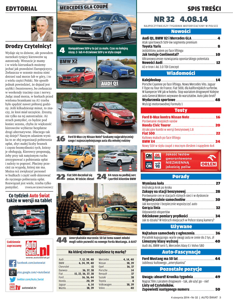 EDYTORIAL MERCEDES GLA COUPÉ SPIS TREŚCI NR 32 4.08.14 NAJPOCZYTNIEJSZY TYGODNIK MOTORYZACYJNY W POLSCE Nowości Audi Q1, BMW X2 i Mercedes GLA........................................ 4 Drodzy Czytelnicy! Wydaje się to dziwne, ale powodem narzekań tysięcy kierowców są autostrady. Wreszcie je mamy i w wielu kierunkach możemy jechać jak prawdziwi Europejczycy. Zwłaszcza w sezonie można nimi dotrzeć nad morze lub w góry, i to z wielu części Polski. Nie sposób jednak powiedzieć, że dojazd jest szybki i bezstresowy, bo zwłaszcza w weekendy tracimy czas i nerwy. Jadąc znad morza, w korkach przed wieloma bramkami na A1 trzeba było spędzić nawet półtorej godziny. Jeśli kilkadziesiąt minut, to znaczy, że ktoś miał szczęście. Zresztą nie tylko na tej autostradzie. Aż strach pomyśleć, co będzie pod koniec sezonu, chyba że większość kierowców wybierze bezpłatne drogi alternatywne. Dlaczego tak się dzieje? Naszym zdaniem wynika to ze złej organizacji pobierania opłat, zbyt małej liczby bramek i często bezmyślności tych, którzy je obsługują. Kierowcy proponują, żeby przy tak natężonym ruchu zrezygnować z pobierania opłat i należy to poprzeć. Płacimy przecież za wygodę, której nie ma. Można też zwiększyć personel w budkach i część osób skierować do ręcznego pobierania opłat. Rozwiązań jest wiele, trzeba tylko STANISŁAW SEWASTIANOWICZ pomyśleć. Atak sportowych SUV-ów segmentu premium 4 Kompaktowe SUV-y to już za mało. Czas na kolejną niszę: 2- lub 4-drzwiowe SUV-y w stylu coupé Toyota Yaris ....................................................................................... 8 Jeździliśmy autem po face liftingu Jak testuje Continental? ........................................................ 10 Ultranowoczesne rozwiązania oponiarskiego potentata BMW X2 Nowości Audi.................................................................................. 12 A3 e-tron i A6 3.0 TDI Concept Wiadomości AUDI Q1 Kalejdoskop .................................................................................... 14 Porsche Cayenne po face liftingu. Nowy Mercedes Vito. Jaguar F-Type na Tour de France. Fiat 500L dla kalifornijskich surferów. W kamperze VW jak w hotelu. Stop wariatom drogowym! Kolejne auta General Motors wzywane do warsztatów. Auto jako broń? Wydarzenia sportowe ............................................................ 48 Wyścigi motorowodnej Formuły 1 Testy Ford B-Max kontra Nissan Note ........................................ 16 Porównanie miejskich vanów Honda Civic Tourer.................................................................... 20 Atrakcyjne kombi w wersji benzynowej 1.8 16 Ford B-Max czy Nissan Note? Szukamy najpraktyczniejszego i najoszczędniejszego auta dla młodej rodziny Fiat 500.............................................................................................. 22 Kultowy maluch po face liftingu BMW X4 ............................................................................................ 24 Nowy SUV w stylu coupé z mocnym dieslem i napędem 4x4 X4 rusza na podbój serc 500 doczekał się 22 Fiat zmian. W teście: diesel 24 i portfeli klientów BMW Porady Wymiana koła ............................................................................... 27 Instrukcja krok po kroku Zakupy na stacji benzynowej.............................................. 28 Co tydzień Auto Świat także w wersji na tablet Porównanie cen w stacjach różnych sieci i w dyskoncie Wypożyczalnie samochodów ............................................. 30 Jak korzystnie i bezpiecznie wypożyczyć auto Gorąca linia .................................................................................... 32 Odpowiedzi ekspertów Odcinkowe pomiary prędkości ......................................... 34 Jak to działa? W których miejscach w Polsce staną kamery? Używane Najtańsze samochody z ogłoszenia............................... 36 44 Codziennie zapraszamy Amerykańskie marzenie: 50 lat temu nawet młodzi mogli sobie pozwolić na nowego Forda Mustanga. A dziś? Poradnik kupującego: warte uwagi auta w cenie do 2 tys. zł Limuzyny klasy wyższej ........................................................ 40 Audi A6, BMW serii 5, Mercedes klasy E i Volvo S80 Na której stronie znajdziesz tę markę? facebook.com/autoswiat plus.google.com/+AutoŚwiat twitter.com/Auto_Swiat autoswiat.tv Audi ........................ 7, 12, 39, 40 BMW ......................6, 24, 39, 40 Chevrolet ................................. 15 Daewoo .......................36, 37, 38 Fiat ................. 15, 22, 36, 37, 38 Ford ............................ 16, 36, 44 Honda................................20, 39 Jaguar ................................. 6, 14 Mazda................................ 38, 39 Mercedes ..................... 4, 14, 40 Nissan ............................... 38, 39 Opel ................................... 36, 37 Porsche .................................... 14 Renault .................................... 37 Suzuki .....................................38 Toyota ........................................8 Volkswagen....................... 38, 39 Volvo ....................................... 40 Auto-Fascynacje Ford Mustang ma 50 lat......................................................... 44 Jubileusz kultowego „amerykanina” Pozostałe pozycje Uwaga: absurd! Kronika tygodnia ................................. 49 Nagrać film z piratem drogowym – tak, ale użyć go – nie! Listy od Czytelników. Zapowiedź następnego numeru....................................... 50 4 sierpnia 2014 Nr 32 | AUTO ŚWIAT 3
