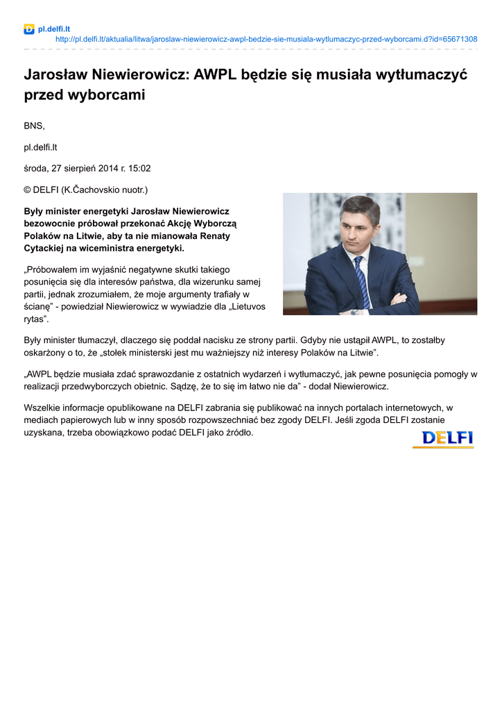 pl.delfi.lt http://pl.delfi.lt/aktualia/litwa/jaroslaw-niewierowicz-awpl-bedzie-sie-musiala-wytlumaczyc-przed-wyborcami.d?id=65671308 Jarosław Niewierowicz: AWPL będzie się musiała wytłumaczyć przed wyborcami BNS, pl.delfi.lt środa, 27 sierpień 2014 г. 15:02 © DELFI (K.Čachovskio nuotr.) Były minister energetyki Jarosław Niewierowicz bezowocnie próbował przekonać Akcję Wyborczą Polaków na Litwie, aby ta nie mianowała Renaty Cytackiej na wiceministra energetyki. „Próbowałem im wyjaśnić negatywne skutki takiego posunięcia się dla interesów państwa, dla wizerunku samej partii, jednak zrozumiałem, że moje argumenty trafiały w ścianę” - powiedział Niewierowicz w wywiadzie dla „Lietuvos rytas”. Były minister tłumaczył, dlaczego się poddał nacisku ze strony partii. Gdyby nie ustąpił AWPL, to zostałby oskarżony o to, że „stołek ministerski jest mu ważniejszy niż interesy Polaków na Litwie”. „AWPL będzie musiała zdać sprawozdanie z ostatnich wydarzeń i wytłumaczyć, jak pewne posunięcia pomogły w realizacji przedwyborczych obietnic. Sądzę, że to się im łatwo nie da” - dodał Niewierowicz. Wszelkie informacje opublikowane na DELFI zabrania się publikować na innych portalach internetowych, w mediach papierowych lub w inny sposób rozpowszechniać bez zgody DELFI. Jeśli zgoda DELFI zostanie uzyskana, trzeba obowiązkowo podać DELFI jako źródło.