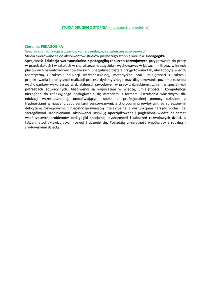 STUDIA DRUGIEGO STOPNIA (magisterskie, dwuletnie) Kierunek: PEDAGOGIKA Specjalność: Edukacja wczesnoszkolna z pedagogiką zaburzeń rozwojowych Studia skierowane są do absolwentów studiów pierwszego stopnia kierunku Pedagogika. Specjalność Edukacja wczesnoszkolna z pedagogiką zaburzeń rozwojowych przygotowuje do pracy w przedszkolach i w szkołach w charakterze nauczyciela - wychowawcy w klasach I - III oraz w innych placówkach oświatowo-wychowawczych. Specjalność została przygotowana tak, aby zdobytą wiedzę teoretyczną z zakresu edukacji wczesnoszkolnej, metodyczną oraz umiejętności z zakresu projektowania i praktycznej realizacji procesu dydaktycznego oraz diagnozowania poziomu rozwoju wychowanków wykorzystać w działalności zawodowej, w pracy z dzieckiem/uczniem o specjalnych potrzebach edukacyjnych. Absolwenci są wyposażeni w wiedzę, umiejętności i kompetencje niezbędne do refleksyjnego posługiwania się metodami i formami kształcenia właściwymi dla edukacji wczesnoszkolnej, umożliwiającymi udzielanie profesjonalnej pomocy dzieciom z trudnościami w nauce, z zaburzeniami sensorycznymi, z chorobami przewlekłymi, ze sprzężonymi deficytami rozwojowymi, z niepełnosprawnością intelektualną, z dysfunkcjami narządu ruchu i ze szczególnymi uzdolnieniami. Absolwenci uzyskują uporządkowaną i pogłębioną wiedzę na temat współczesnych problemów pedagogiki specjalnej, dysharmonii i zaburzeń rozwojowych dzieci, a także metod aktywizujących rozwój i uczenie się. Posiadają umiejętność współpracy z rodziną i środowiskiem dziecka.