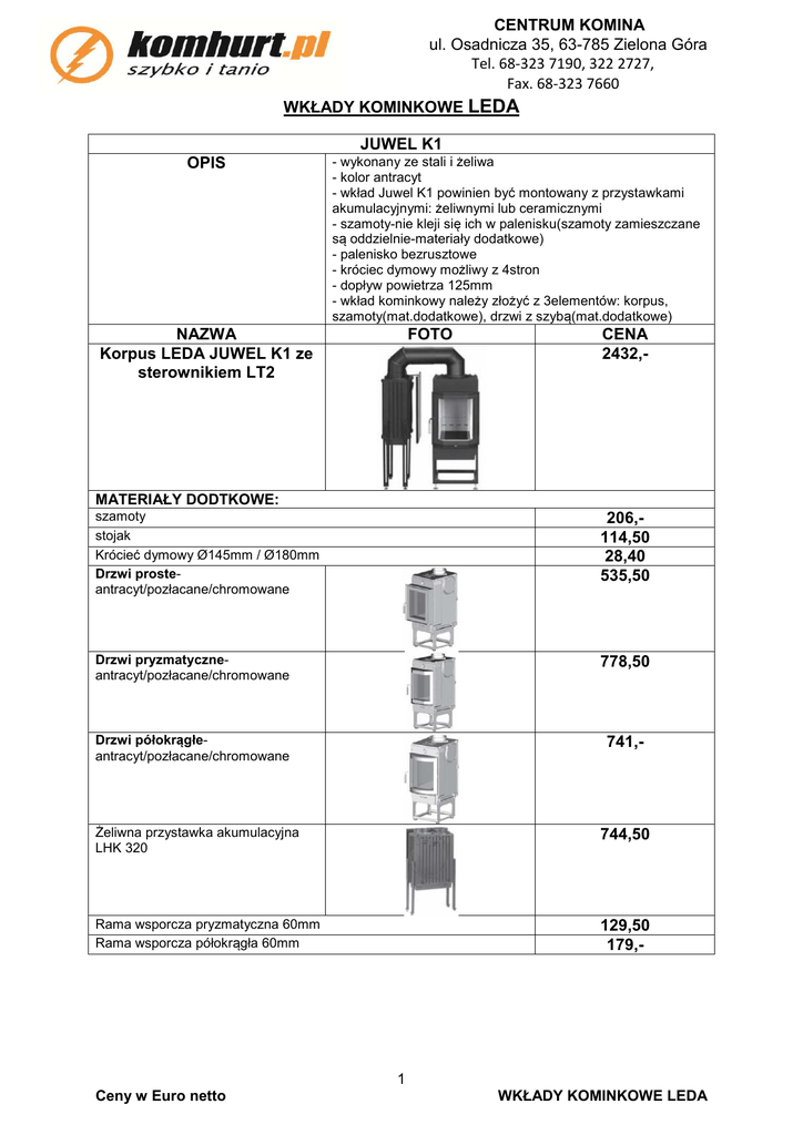 CENTRUM KOMINA ul. Osadnicza 35, 63-785 Zielona Góra Tel. 68-323 7 Tel. 68-323 7190, 322 2727, 68-323 7660 www.kominki.fm Fax. 68-323 7660 WKŁADY KOMINKOWE LEDA [Wpisz tekst] JUWEL K1 OPIS - wykonany ze stali i żeliwa - kolor antracyt - wkład Juwel K1 powinien być montowany z przystawkami akumulacyjnymi: żeliwnymi lub ceramicznymi - szamoty-nie kleji się ich w palenisku(szamoty zamieszczane są oddzielnie-materiały dodatkowe) - palenisko bezrusztowe - króciec dymowy możliwy z 4stron - dopływ powietrza 125mm - wkład kominkowy należy złożyć z 3elementów: korpus, szamoty(mat.dodatkowe), drzwi z szybą(mat.dodatkowe) NAZWA Korpus LEDA JUWEL K1 ze sterownikiem LT2 FOTO CENA 2432,- MATERIAŁY DODTKOWE: szamoty stojak Krócieć dymowy Ø145mm / Ø180mm Drzwi prosteantracyt/pozłacane/chromowane 206,114,50 28,40 535,50 Drzwi pryzmatyczneantracyt/pozłacane/chromowane 778,50 Drzwi półokrągłeantracyt/pozłacane/chromowane 741,- Żeliwna przystawka akumulacyjna LHK 320 744,50 Rama wsporcza pryzmatyczna 60mm Rama wsporcza półokrągła 60mm 129,50 179,- 1 Ceny w Euro netto WKŁADY KOMINKOWE LEDA CENTRUM KOMINA ul. Osadnicza 35, 63-785 Zielona Góra Tel. 68-323 7 Tel. 68-323 7190, 322 2727, 68-323 7660 www.kominki.fm Fax. 68-323 7660 JUWEL K1 PARAMETRY TECHNICZNE [Wpisz tekst] JUWEL K1 PROSTY JUWEL K1 PRYZMATYCZNY -Moc nominalna z przystawką akumulacyjną: Ø145mm 6kW Ø180mm 7kW -moc bez przystawki akumulacyjnej: Ø145mm 4,5kW Ø180mm 5,5kW - wysokość fasady 450mm -wysokość szyby 352mm -szerokość 378mm -szerokość szyby 276mm - głębokość 560mm - głębokość paleniska 380mm JUWEL K1 PÓŁOKRĄGŁY -Moc nominalna z przystawką akumulacyjną: Ø145mm 6kW Ø180mm 7kW -moc bez przystawki akumulacyjnej: Ø145mm 4,5kW Ø180mm 5,5kW - wysokość fasady 450mm -wysokość szyby 348mm -szerokość 378mm -szerokość szyby 304mm - głębokość 566mm - głębokość paleniska 380mm -Moc nominalna z przystawką akumulacyjną: Ø145mm 6kW Ø180mm 7kW -moc bez przystawki akumulacyjnej: Ø145mm 4,5kW Ø180mm 5,5kW - wysokość fasady 450mm -wysokość szyby 348mm -szerokość 378mm -szerokość szyby 303mm - głębokość 568mm - głębokość paleniska 380mm LAVA D NAZWA OPIS LAVA D prosty LAVA D pryzmatyczny LAVA D półokrągły MATERIAŁY DODATKOWE FOTO PARAMETRY TECHNICZNE -wykonany z żeliwa -spalanie bezrusztowe -wnętrze paleniska z szamotów -króciec dymowy skrętny 180° -dopływ powietrza 125mm -Moc nominalna 7kW - wysokość fasady 573mm -wysokość szyby 460mm -szerokość 530mm -szerokość fasady 490mm -szerokość szyby 394mm - głębokość 435mm - króciec dymowy 160mm -śr.króćca dymowego 125mm -Moc nominalna 7kW - wysokość fasady 573mm -wysokość szyby 460mm -szerokość 530mm -szerokość fasady 490mm -szerokość szyby 420mm - głębokość 522mm - króciec dymowy 160mm -śr.króćca dymowego 125mm -Moc nominalna 7kW - wysokość fasady 573mm -wysokość szyby 460mm -szerokość 530mm -szerokość fasady 490mm -szerokość szyby 417mm - głębokość 522mm - króciec dymowy 160mm -śr.króćca dymowego 125mm Rama wsporcza pryzmatyczna 100mm Rama wsporcza półokrągła CENA 1798,- 2067,- 2235,- 135,202,50 2 Ceny w Euro netto WKŁADY KOMINKOWE LEDA [Wpisz tekst] Tel. 68-323 7 68-323 7660 www.kominki.fm NAZWA OPIS LAVA N prosty LAVA N pryzmatyczny LAVA N półokrągły MATERIAŁY DODATKOWE FOTO CENTRUM KOMINA ul. Osadnicza 35, 63-785 Zielona Góra Tel. 68-323 7190, 322 2727, Fax. 68-323 7660 LAVA N PARAMETRY CENA TECHNICZNE -wykonany z żeliwa kolor antracytowy -powinien być instalowany z przystawkami akumulacyjnymi żeliwnymi lub ceramicznymi -spalanie bezrusztowe -wnętrze paleniska szamotowe -króciec dymowy skrętny 180° -Moc nominalna z przystawka akumulacyjną 8kW 1724,- wysokość fasady 573mm -wysokość szyby 460mm -szerokość 530mm -szerokość fasady 520mm -szerokość szyby 394mm - głębokość 435mm -śr.króćca dymowego 180mm -śr.dolotu powietrza 125mm -Moc nominalna z przystawka akumulacyjną 8kW 1994,- wysokość fasady 573mm -wysokość szyby 460mm -szerokość 530mm -szerokość fasady 520mm -szerokość szyby 420mm - głębokość 523mm -śr.króćca dymowego 180mm -śr.dolotu powietrza 125mm -Moc nominalna z przystawka akumulacyjną 8kW 2162,- wysokość fasady 573mm -wysokość szyby 460mm -szerokość 530mm -szerokość fasady 520mm -szerokość szyby 417mm - głębokość 523mm -śr.króćca dymowego 180mm -śr.dolotu powietrza 125mm Żeliwna przystawka akumulacyjna LHK 320 744,50 Rama wsporcza pryzmatyczna 100mm 135,Rama wsporcza półokrągła 202,50 Sterowanie LT3 do Lava D i Lava N 1469,- MAGMA D OPIS MAGMA D 510x450 (uchwyt chromowany) -wykonany z żeliwa i stali kolor antracytowy -spalanie bezrusztowe -wnętrze paleniska szamotowe -króciec dymowy skrętny 180° -Moc nominalna 6kW - wysokość fasady 525mm -wysokość szyby 393mm -szerokość 530mm -szerokość fasady 435mm -szerokość szyby 413mm - głębokość 447mm - króciec dymowy 160mm -śr.króćca dymowego 125mm 1533,- 3 Ceny w Euro netto WKŁADY KOMINKOWE LEDA [Wpisz tekst] Tel. 68-323 7 68-323 7660 www.kominki.fm NAZWA FOTO CENTRUM KOMINA ul. Osadnicza 35, 63-785 Zielona Góra Tel. 68-323 7190, 322 2727, Fax. 68-323 7660 MAGMA D PARAMETRY CENA TECHNICZNE -Moc nominalna 7kW - wysokość fasady 525mm -wysokość szyby 393mm -szerokość 585mm -szerokość fasady 550mm -szerokość szyby 428mm - głębokość 447mm - króciec dymowy 160mm -śr.króćca dymowego 125mm MAGMA D 510x550 (uchwyt chromowany) -Moc nominalna 8kW - wysokość fasady 525mm -wysokość szyby 393mm -szerokość 695mm -szerokość fasady 660mm -szerokość szyby 428mm - głębokość 538mm - króciec dymowy 160mm -śr.króćca dymowego 125mm -Moc nominalna 6kW - wysokość fasady 585mm -wysokość szyby 463mm -szerokość 530mm -szerokość fasady 435mm -szerokość szyby 313mm - głębokość 447mm - króciec dymowy 160mm -śr.króćca dymowego 125mm -Moc nominalna 7kW - wysokość fasady 