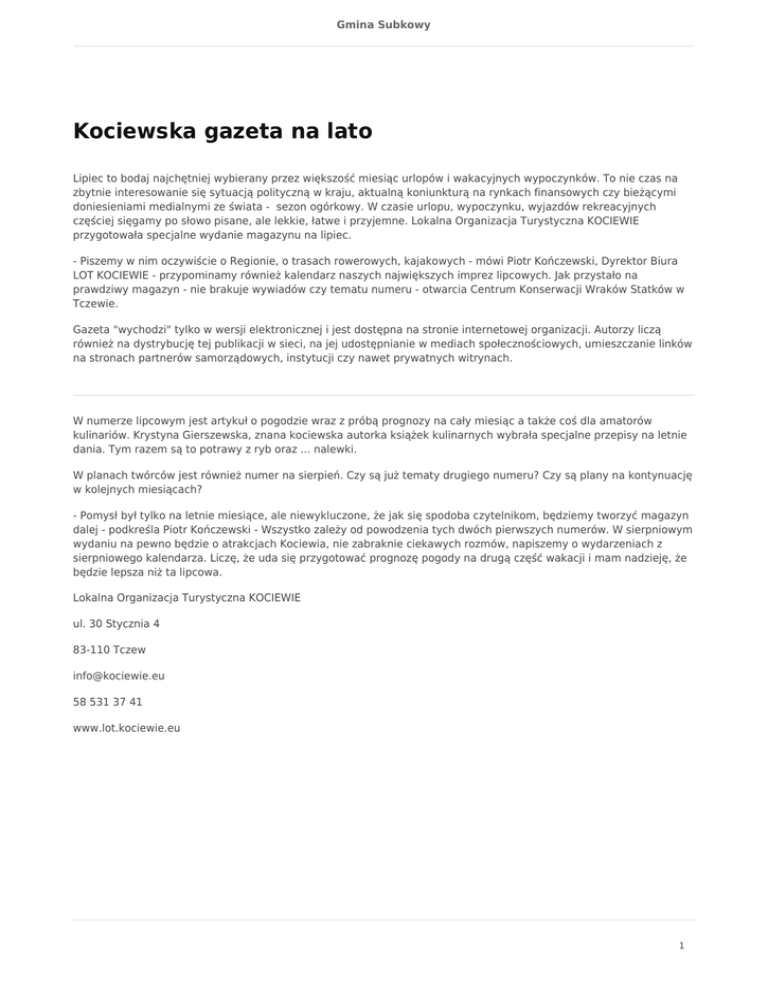 Gmina Subkowy Kociewska gazeta na lato Lipiec to bodaj najchętniej wybierany przez większość miesiąc urlopów i wakacyjnych wypoczynków. To nie czas na zbytnie interesowanie się sytuacją polityczną w kraju, aktualną koniunkturą na rynkach finansowych czy bieżącymi doniesieniami medialnymi ze świata - sezon ogórkowy. W czasie urlopu, wypoczynku, wyjazdów rekreacyjnych częściej sięgamy po słowo pisane, ale lekkie, łatwe i przyjemne. Lokalna Organizacja Turystyczna KOCIEWIE przygotowała specjalne wydanie magazynu na lipiec. - Piszemy w nim oczywiście o Regionie, o trasach rowerowych, kajakowych - mówi Piotr Kończewski, Dyrektor Biura LOT KOCIEWIE - przypominamy również kalendarz naszych największych imprez lipcowych. Jak przystało na prawdziwy magazyn - nie brakuje wywiadów czy tematu numeru - otwarcia Centrum Konserwacji Wraków Statków w Tczewie. Gazeta "wychodzi" tylko w wersji elektronicznej i jest dostępna na stronie internetowej organizacji. Autorzy liczą również na dystrybucję tej publikacji w sieci, na jej udostępnianie w mediach społecznościowych, umieszczanie linków na stronach partnerów samorządowych, instytucji czy nawet prywatnych witrynach. W numerze lipcowym jest artykuł o pogodzie wraz z próbą prognozy na cały miesiąc a także coś dla amatorów kulinariów. Krystyna Gierszewska, znana kociewska autorka książek kulinarnych wybrała specjalne przepisy na letnie dania. Tym razem są to potrawy z ryb oraz ... nalewki. W planach twórców jest również numer na sierpień. Czy są już tematy drugiego numeru? Czy są plany na kontynuację w kolejnych miesiącach? - Pomysł był tylko na letnie miesiące, ale niewykluczone, że jak się spodoba czytelnikom, będziemy tworzyć magazyn dalej - podkreśla Piotr Kończewski - Wszystko zależy od powodzenia tych dwóch pierwszych numerów. W sierpniowym wydaniu na pewno będzie o atrakcjach Kociewia, nie zabraknie ciekawych rozmów, napiszemy o wydarzeniach z sierpniowego kalendarza. Liczę, że uda się przygotować prognozę pogody na drugą część wakacji i mam nadzieję, że będzie lepsza niż ta lipcowa. Lokalna Organizacja Turystyczna KOCIEWIE ul. 30 Stycznia 4 83-110 Tczew [email protected] 58 531 37 41 www.lot.kociewie.eu 1