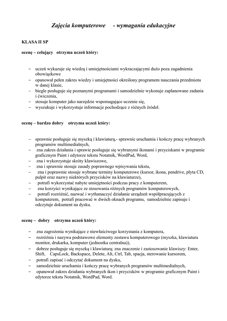 Zajęcia komputerowe - wymagania edukacyjne KLASA II SP ocenę – celujący otrzyma uczeń który: ‒ uczeń wykazuje się wiedzą i umiejętnościami wykraczającymi dużo poza zagadnienia obowiązkowe ‒ opanował pełen zakres wiedzy i umiejętności określony programem nauczania przedmiotu w danej klasie, biegle posługuje się poznanymi programami i samodzielnie wykonuje zaplanowane zadania i ćwiczenia, stosuje komputer jako narzędzie wspomagające uczenie się, wyszukuje i wykorzystuje informacje pochodzące z różnych źródeł. ocenę – bardzo dobry otrzyma uczeń który: sprawnie posługuje się myszką i klawiaturą,- sprawnie uruchamia i kończy pracę wybranych programów multimedialnych, zna zakres działania i sprawie posługuje się wybranymi ikonami i przyciskami w programie graficznym Paint i edytorze tekstu Notatnik, WordPad, Word, zna i wykorzystuje skróty klawiszowe, zna i sprawnie stosuje zasady poprawnego wpisywania tekstu, zna i poprawnie stosuje wybrane terminy komputerowe (kursor, ikona, pendrive, płyta CD, pulpit oraz nazwy niektórych przycisków na klawiaturze), potrafi wykorzystać nabyte umiejętności podczas pracy z komputerem, zna korzyści wynikające ze stosowania różnych programów komputerowych, potrafi rozróżnić, nazwać i wytłumaczyć działanie urządzeń współpracujących z komputerem, potrafi pracować w dwóch oknach programu, samodzielnie zapisuje i odczytuje dokument na dysku. ocenę – dobry ‒ ‒ ‒ ‒ ‒ ‒ otrzyma uczeń który: zna zagrożenia wynikające z niewłaściwego korzystania z komputera, rozróżnia i nazywa podstawowe elementy zestawu komputerowego (myszka, klawiatura monitor, drukarka, komputer (jednostka centralna)), dobrze posługuje się myszką i klawiaturą; zna znaczenie i zastosowanie klawiszy: Enter, Shift, CapsLock, Backspace, Delete, Alt, Ctrl, Tab, spacja, sterowanie kursorem, potrafi zapisać i odczytać dokument na dysku, samodzielnie uruchamia i kończy pracę wybranych programów multimedialnych, opanował zakres działania wybranych ikon i przycisków w programie graficznym Paint i edytorze tekstu Notatnik, WordPad, Word. ocenę – dostateczny ‒ ‒ ‒ ‒ ‒ ‒ ‒ ‒ ‒ otrzyma uczeń który: szanuje obowiązujące prawa przy korzystaniu z komputera, rozpoznaje i nazywa urządzenia znajdujące się w pracowni komputerowej, samodzielnie posługuje się myszką i klawiaturą, korzysta z wybranych ikon i przycisków w programie graficznym Paint i edytorze tekstu Notatnik, WordPad, Word, potrafi zapisać i odczytać dokument na dysku, z pomocą nauczyciela uruchamia i kończy pracę wybranych programów multimedialnych, wykonuje zadania i ćwiczenia o średnim stopniu trudności, potrafi wymienić podstawowe urządzenia współpracujące z komputerem. ocenę – dopuszczający otrzyma uczeń który: ‒ ‒ ‒ ‒ ‒ ‒ ‒ zna i stosuje zasady bezpiecznej i higienicznej pracy z komputerem, szanuje pracę swoją i kolegów, potrafi wskazać podstawowe elementy zestawu komputerowego, potrafi włączyć i wyłączyć komputer, z pomocą nauczyciela posługuje się myszką i klawiaturą, z pomocą nauczyciela zapisuje i odczytuje dokument na dysku, z pomocą nauczyciela korzysta z wybranych ikon i przycisków w programie graficznym Paint i edytorze tekstu Notatnik, WordPad, Word, ‒ wykonuje zadania i ćwiczenia o niewielkim stopniu trudności. ocenę – niedostateczny otrzyma uczeń który: - nie opanował podstawowych wiadomości i umiejętności z zakresu zajęć komputerowych w nauczaniu zintegrowanym, - nie okazuje chęci nadrobienia zaległości, - nawet przy pomocy nauczyciela nie potrafi wykonać najprostszych zadań i ćwiczeń. KLASA III SP ocenę – celujący otrzyma uczeń który: ‒ uczeń wykazuje się wiedzą i umiejętnościami wykraczającymi dużo poza zagadnienia obowiązkowe ‒ opanował pełen zakres wiedzy i umiejętności określony programem nauczania przedmiotu w danej klasie, ‒ biegle posługuje się poznanymi programami i samodzielnie wykonuje zaplanowane zadania i ćwiczenia, ‒ stosuje komputer jako narzędzie wspomagające uczenie się, ‒ wyszukuje i wykorzystuje informacje pochodzące z różnych źródeł. ocenę – bardzo dobry otrzyma uczeń który: ‒ ‒ ‒ ‒ ‒ ‒ ‒ ‒ ‒ ‒ ‒ ‒ ‒ sprawnie posługuje się myszką i klawiaturą, sprawnie uruchamia i kończy pracę wybranych programów multimedialnych, zna zakres działania i sprawie posługuje się wybranymi ikonami i przyciskami w programie graficznym Paint i edytorze tekstu WordPad, Word, zna i wykorzystuje skróty klawiszowe, zna i sprawnie stosuje zasady poprawnego wpisywania tekstu, zna i poprawnie stosuje wybrane terminy komputerowe (kursor, ikona, pendrive, płyta CD, pulpit oraz nazwy niektórych przycisków na klawiaturze), potrafi wykorzystać nabyte umiejętności podczas pracy z komputerem, zna korzyści wynikające ze stosowania różnych programów komputerowych, potrafi rozróżnić, nazwać i wytłumaczyć działanie urządzeń współpracujących z komputerem, potrafi pracować w dwóch oknach programu, potrafi pracować w dwóch programach, samodzielnie zapisuje i odczytuje dokument na dysku. ocenę – dobry ‒ ‒ ‒ ‒ ‒ ‒ otrzyma uczeń który: zna zagrożenia wynikające z niewłaściwego korzystania z komputera, rozróżnia i nazywa podstawowe elementy zestawu komputerowego (myszka, klawiatura monitor, drukarka, komputer (jednostka centralna)), dobrze posługuje się myszką i klawiaturą; zna znaczenie i zastosowanie klawiszy: Enter, Shift, CapsLock, Backspace, Delete, Tab, Alt, Ctrl, Esc, spacja, sterowanie kursorem, potrafi zapisać i odczytać dokument na dysku, samodzielnie uruchamia i kończy pracę wybranych programów multimedialnych, opanował zakres działania wybranych ikon i przycisków w programie graficznym Paint i edytorze tekstu WordPad, Word,. ‒ ocenę – dostateczny ‒ ‒ ‒ ‒ ‒ ‒ ‒ ‒ ‒ otrzyma uczeń