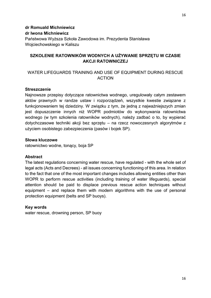 16 dr Romuald Michniewicz dr Iwona Michniewicz Państwowa Wyższa Szkoła Zawodowa im. Prezydenta Stanisława Wojciechowskiego w Kaliszu SZKOLENIE RATOWNIKÓW WODNYCH A UŻYWANIE SPRZĘTU W CZASIE AKCJI RATOWNICZEJ WATER LIFEGUARDS TRAINING AND USE OF EQUIPMENT DURING RESCUE ACTION Streszczenie Najnowsze przepisy dotyczące ratownictwa wodnego, uregulowały całym zestawem aktów prawnych w randze ustaw i rozporządzeń, wszystkie kwestie związane z funkcjonowaniem tej dziedziny. W związku z tym, że jedną z najważniejszych zmian jest dopuszczenie innych niż WOPR podmiotów do wykonywania ratownictwa wodnego (w tym szkolenia ratowników wodnych), należy zadbać o to, by wypierać dotychczasowe techniki akcji bez sprzętu – na rzecz nowoczesnych algorytmów z użyciem osobistego zabezpieczenia (pasów i bojek SP). Słowa kluczowe ratownictwo wodne, tonący, boja SP Abstract The latest regulations concerning water rescue, have regulated - with the whole set of legal acts (Acts and Decrees) - all issues concerning functioning of this area. In relation to the fact that one of the most important changes includes allowing entities other than WOPR to perform rescue activities (including training of water lifeguards), special attention should be paid to displace previous rescue action techniques without equipment – and replace them with modern algorithms with the use of personal protection equipment (belts and SP buoys). Key words water rescue, drowning person, SP buoy 16 17 Wstęp W ratownictwie medycznym od dawna głoszona jest teoria, że ratując czyjeś życie należy przede wszystkim zadbać o to, by nie doszło do podwójnej tragedii. Ta zasada winna być w pełni stosowana także w ratownictwie wodnym. Jednakże nie zawsze jest tak, że życie ratownika stawia się na pierwszym miejscu (Graham, 2005). Każda akcja ratunkowa niesie ryzyko dla ratownika. Ratownicy wodni znajdują się w szczególnie trudnym środowisku, gdyż już sama woda (z pominięciem zagrożenia ze strony osoby tonącej) stanowi niebezpieczeństwo i zwiększa prawdopodobieństwo utraty zdrowia i życia dla wszystkich uczestników wypadku (ofiary i ratującego). Autorom niniejszego tekstu trudno zgodzić się z poglądami wyrażanymi w części polskich publikacji, że „podczas prawidłowo wykonanej akcji ratunkowej nie istnieje w zasadzie obawa uchwycenia ratownika przez tonącego” (Błasiak, Chadaj, Kurek, 2001). Takie twierdzenia pogłębiają bowiem przekonanie wśród ratowników o braku zagrożenia i łatwości udzielania pomocy tonącemu (Michniewicz, Michniewicz, 2011). A przecież istnieją badania naukowe (Dahl, Miller, 1979; Michniewicz, 2011), które obalają ten mit. Szkoleniem ratowników wodnych w Polsce zajmowała się dotychczas jedna organizacja – Wodne Ochotnicze Pogotowie Ratunkowe. To od standardów stosowanych przez WOPR (w tym przede wszystkim programów kursów) zależała jakość przygotowania każdego ratownika. Od 21 czerwca 2012 roku obowiązują jednak zupełnie nowe przepisy, do których muszą zastosować się wszystkie podmioty (dopuszczone przez Ministerstwo Spraw Wewnętrznych, w konsekwencji zmian w prawie wprowadzonych Ustawą o bezpieczeństwie osób przebywających na obszarach wodnych). Należy zatem zadbać, aby każdy aktywny zawodowo ratownik, niezależnie od tego kiedy ukończył szkolenie, miał co najmniej porównywalne, podstawowe umiejętności (i wiedzę). Najnowsze zmiany w szkoleniach ratowników Zmieniające się zalecenia medyczne, doskonalone techniki pływackie czy wprowadzany nowoczesny sprzęt, wymuszają konieczność dostosowywania wymogów szkolenia do pojawiających się potrzeb. Modyfikacji ulegają zarówno niektóre głoszone wcześniej poglądy – choćby w odniesieniu do akcji bez sprzętu (wcześniej uznawano ją za trudną ale wykonalną, obecnie teoria ta jest wypierana na rzecz akcji ze sprzętem), nadawanych uprawnień i nauczanych technik. Przez długi czas ratownicy WOPR mogli uzyskać uprawnienia w rozbiciu na pięć stopni (od młodszego ratownika do instruktora wykładowcy – bez podziału na akwen), od 2010 roku do wejścia w życie nowych przepisów1 – było to dziewięć stopni (od młodszego ratownika do instruktora wykładowcy – z dużym rozszerzeniem na rodzaj akwenu). Obecnie są to jedynie dwa stopnie: ratownik i instruktor. Ustawa z dnia 18 sierpnia 2011 r. o bezpieczeństwie osób przebywających na obszarach wodnych (Dz. U. Nr 208, poz. 1240) oraz Rozporządzenie Ministra Spraw Wewnętrznych z dnia 21 czerwca 2012, w sprawie szkoleń w ratownictwie wodnym (Dz. U. 2012 poz. 747) 1 17 18 Koniecznością dopełniającą uprawnienia ratownika wodnego jest posiadanie ukończonego kursu z kwalifikowanej pierwszej pomocy (KPP), co wynika z art. 13 ust. 1 ustawy z dnia 8 września 2006 r. o Państwowym Ratownictwie Medycznym. Bez posiadania dokumentu potwierdzającego odbycie kursu i pozytywne zdanie egzaminu końcowego KPP, żaden podmiot szkolący ratowników wodnych nie powinien nadawać im stopnia ratownika. Zgodnie z przytoczonym zapisem Ustawy o Państwowym Ratownictwie Medycznym, ratownikiem może być osoba: 1) posiadająca pełną zdolność do czynności prawnych; 2) zatrudniona lub pełniąca służbę w jednostkach współpracujących z systemem, o których mowa w art. 15, lub będąca członkiem tych jednostek; 3) posiadająca ważne zaświadczenie o ukończeniu kursu w zakresie kwalifikowanej pierwszej pomocy, zwanego dalej "kursem", i uzyskaniu tytułu ratownika. Spełnianie tych wymogów jest podyktowane zapisem art. 2 ust.5 ustawy z dnia 18 sierpnia 2011 r. o bezpieczeństwie osób przebywających na obszarach wodnych (Dz. U. Nr 208, poz. 1240) w brzmieniu: Ilekroć w ustawie jest mowa o: (…); ratowniku wodnym — rozumie się przez to osobę posiadającą wiedzę i umiejętności z zakresu ratownictwa i technik pływackich oraz inne kwalifikacje przydatne w ratownictwie wodnym i spełniającą wymag