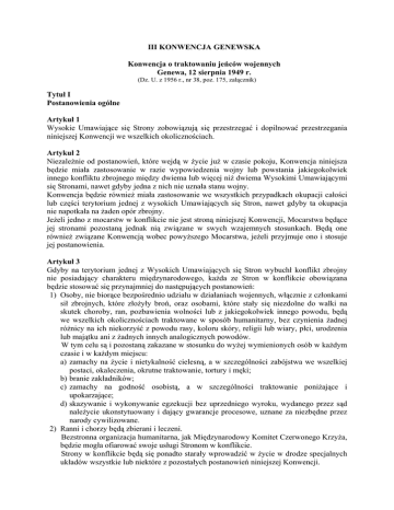 III KONWENCJA GENEWSKA Konwencja o traktowaniu jeńców wojennych Genewa, 12 sierpnia 1949 r. (Dz. U. z 1956 r., nr 38, poz. 175, załącznik) Tytuł I Postanowienia ogólne Artykuł 1 Wysokie Umawiające się Strony zobowiązują się przestrzegać i dopilnować przestrzegania niniejszej Konwencji we wszelkich okolicznościach. Artykuł 2 Niezależnie od postanowień, które wejdą w życie już w czasie pokoju, Konwencja niniejsza będzie miała zastosowanie w razie wypowiedzenia wojny lub powstania jakiegokolwiek innego konfliktu zbrojnego między dwiema lub więcej niż dwiema Wysokimi Umawiającymi się Stronami, nawet gdyby jedna z nich nie uznała stanu wojny. Konwencja będzie również miała zastosowanie we wszystkich przypadkach okupacji całości lub części terytorium jednej z wysokich Umawiających się Stron, nawet gdyby ta okupacja nie napotkała na żaden opór zbrojny. Jeżeli jedno z mocarstw w konflikcie nie jest stroną niniejszej Konwencji, Mocarstwa będące jej stronami pozostaną jednak nią związane w swych wzajemnych stosunkach. Będą one również związane Konwencją wobec powyższego Mocarstwa, jeżeli przyjmuje ono i stosuje jej postanowienia. Artykuł 3 Gdyby na terytorium jednej z Wysokich Umawiających się Stron wybuchł konflikt zbrojny nie posiadający charakteru międzynarodowego, każda ze Stron w konflikcie obowiązana będzie stosować się przynajmniej do następujących postanowień: 1) Osoby, nie biorące bezpośrednio udziału w działaniach wojennych, włącznie z członkami sił zbrojnych, które złożyły broń, oraz osobami, które stały się niezdolne do walki na skutek choroby, ran, pozbawienia wolności lub z jakiegokolwiek innego powodu, będą we wszelkich okolicznościach traktowane w sposób humanitarny, bez czynienia żadnej różnicy na ich niekorzyść z powodu rasy, koloru skóry, religii lub wiary, płci, urodzenia lub majątku ani z żadnych innych analogicznych powodów. W tym celu są i pozostaną zakazane w stosunku do wyżej wymienionych osób w każdym czasie i w każdym miejscu: a) zamachy na życie i nietykalność cielesną, a w szczególności zabójstwa we wszelkiej postaci, okaleczenia, okrutne traktowanie, tortury i męki; b) branie zakładników; c) zamachy na godność osobistą, a w szczególności traktowanie poniżające i upokarzające; d) skazywanie i wykonywanie egzekucji bez uprzedniego wyroku, wydanego przez sąd należycie ukonstytuowany i dający gwarancje procesowe, uznane za niezbędne przez narody cywilizowane. 2) Ranni i chorzy będą zbierani i leczeni. Bezstronna organizacja humanitarna, jak Międzynarodowy Komitet Czerwonego Krzyża, będzie mogła ofiarować swoje usługi Stronom w konflikcie. Strony w konflikcie będą się ponadto starały wprowadzić w życie w drodze specjalnych układów wszystkie lub niektóre z pozostałych postanowień niniejszej Konwencji. Zastosowanie powyższych postanowień nie będzie miało wpływu na sytuację prawną Stron w konflikcie. Artykuł 4 A. Jeńcami wojennymi w rozumieniu niniejszej Konwencji są osoby, które znalazły się we władzy nieprzyjaciela, a należą do jednej z następujących kategorii: 1) członkowie sił zbrojnych Strony w konflikcie, jak również członkowie milicji i oddziałów ochotniczych, stanowiących część tych sił zbrojnych; 2) członkowie innych milicji i innych oddziałów ochotniczych, włączając w to członków zorganizowanych ruchów oporu, należących do jednej ze Stron w konflikcie i działających poza granicami lub w granicach własnego terytorium, nawet jeżeli pod warunkiem, że te milicje lub oddziały ochotnicze, włączając w to zorganizowane ruchy oporu, odpowiadają następującym warunkom: a) mają na czele osobę odpowiedzialną za swych podwładnych; b) noszą stały i dający się z daleka rozpoznać znak rozpoznawczy; c) jawnie noszą broń; d) przestrzegają w swych działaniach praw i zwyczajów wojny; 3) członkowie regularnych sił zbrojnych, którzy podają się za podlegających rządowi lub władzy nie uznanym przez Mocarstwo zatrzymujące; 4) osoby towarzyszące siłom zbrojnym, ale nie należące do nich bezpośrednio, jak na przykład cywilni członkowie załóg samolotów wojskowych, korespondenci wojenni, dostawcy, członkowie oddziałów pracy lub służb, powołanych do opiekowania się wojskowymi, pod warunkiem, że otrzymali oni upoważnienie od sił zbrojnych, którym towarzyszą, przy czym te ostatnie obowiązane są wydać im w tym celu kartę tożsamości według załączonego wzoru; 5) członkowie załóg statków handlowych, włączając w to kapitanów, pilotów i uczniów, oraz członkowie załóg samolotów cywilnych Stron w konflikcie, o ile nie przysługuje im prawo do korzystniejszego traktowania na mocy innych postanowień prawa międzynarodowego; 6) ludność terytorium nie okupowanego, która przy zbliżaniu się nieprzyjaciela chwyta spontanicznie za broń, aby stawić opór inwazji, a nie miała czasu zorganizować się w regularne siły zbrojne, jeżeli jawnie nosi broń i przestrzega praw i zwyczajów wojennych. B. Korzystać będą również z traktowania zastrzeżonego przez niniejszą Konwencję dla jeńców wojennych: 1) osoby, które należą lub należały do sił zbrojnych kraju okupowanego, jeżeli z tytułu tej przynależności Mocarstwo okupujące, które je nawet początkowo zwolniło w czasie trwania działań wojennych poza okupowanym przezeń terytorium, uważa za niezbędne ich internowanie, zwłaszcza po nieudanej próbie tych osób połączenia się z siłami zbrojnymi, do których należą i które nadal walczą, lub gdy osoby te nie stawią się na wezwanie w celu ich internowania. 2) Osoby należące do jednej z kategorii wyliczonych w niniejszym artykule, przyjęte na terytorium Mocarstw neutralnych lub nie będących stroną wojującą, a podlegające internowaniu na mocy prawa międzynarodowego, z zastrzeżeniem wszelkiego rodzaju korzys