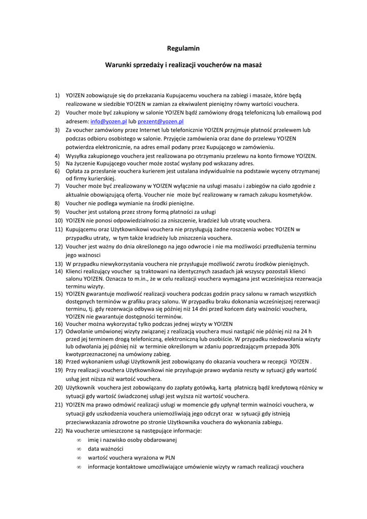 Regulamin Warunki sprzedaży i realizacji voucherów na masaż 1) YO!ZEN zobowiązuje się do przekazania Kupujacemu vouchera na zabiegi i masaże, które będą realizowane w siedzibie YO!ZEN w zamian za ekwiwalent pieniężny równy wartości vouchera. 2) Voucher może być zakupiony w salonie YO!ZEN bądź zamówiony drogą telefoniczną lub emailową pod adresem: [email protected] lub [email protected] 3) Za voucher zamówiony przez Internet lub telefonicznie YO!ZEN przyjmuje płatność przelewem lub podczas odbioru osobistego w salonie. Przyjęcie zamówienia oraz dane do przelewu YO!ZEN potwierdza elektronicznie, na adres email podany przez Kupującego w zamówieniu. 4) Wysyłka zakupionego vouchera jest realizowana po otrzymaniu przelewu na konto firmowe YO!ZEN. 5) Na życzenie Kupującego voucher może zostać wysłany pod wskazany adres. 6) Opłata za przesłanie vouchera kurierem jest ustalana indywidualnie na podstawie wyceny otrzymanej od firmy kurierskiej. 7) Voucher może być zrealizowany w YO!ZEN wyłącznie na usługi masażu i zabiegów na ciało zgodnie z aktualnie obowiązującą ofertą. Voucher nie może być realizowany w ramach zakupu kosmetyków. 8) Voucher nie podlega wymianie na środki pieniężne. 9) Voucher jest ustaloną przez strony formą płatności za usługi 10) YO!ZEN nie ponosi odpowiedzialności za zniszczenie, kradzież lub utratę vouchera. 11) Kupującemu oraz Użytkownikowi vouchera nie przysługują żadne roszczenia wobec YO!ZEN w przypadku utraty, w tym także kradzieży lub zniszczenia vouchera. 12) Voucher jest ważny do dnia określonego na jego odwrocie i nie ma możliwości przedłużenia terminu jego ważnosci 13) W przypadku niewykorzystania vouchera nie przysługuje możliwość zwrotu środków pieniężnych. 14) Klienci realizujący voucher są traktowani na identycznych zasadach jak wszyscy pozostali klienci salonu YO!ZEN. Oznacza to m.in., że w celu realizacji vouchera wymagana jest wcześniejsza rezerwacja terminu wizyty. 15) YO!ZEN gwarantuje mozliwość realizacji vouchera podczas godzin pracy salonu w ramach wszystkich dostępnych terminów w grafiku pracy salonu. W przypadku braku dokonania wcześniejszej rezerwacji terminu, tj. gdy rezerwacja odbywa się później niż 14 dni przed końcem daty ważności vouchera, YO!ZEN nie gwarantuje dostępności terminów. 16) Voucher można wykorzystać tylko podczas jednej wizyty w YO!ZEN 17) Odwołanie umówionej wizyty związanej z realizacją vouchera musi nastąpić nie później niż na 24 h przed jej terminem drogą telefoniczną, elektroniczną lub osobiście. W przypadku niedowołania wizyty lub odwołania jej później niż w terminie określonym w zdaniu poprzedzającym przepada 30% kwotyprzeznaczonej na umówiony zabieg. 18) Przed wykonaniem usługi Użytkownik jest zobowiązany do okazania vouchera w recepcji YO!ZEN . 19) Przy realizacji vouchera Użytkownikowi nie przysługuje prawo wydania reszty w sytuacji gdy wartość usług jest niższa niż wartość vouchera. 20) Użytkownik vouchera jest zobowiązany do zapłaty gotówką, kartą płatniczą bądź kredytową różnicy w sytuacji gdy wartość świadczonej usługi jest wyższa niż wartość vouchera. 21) YO!ZEN ma prawo odmówić realizacji usługi w momencie gdy upłynął termin ważności vouchera, w sytuacji gdy uszkodzenia vouchera uniemożliwiają jego odczyt oraz w sytuacji gdy istnieją przeciwwskazania zdrowotne po stronie Użytkownika vouchera do wykonania zabiegu. 22) Na voucherze umieszczone są następujące informacje: • imię i nazwisko osoby obdarowanej • data ważności • wartość vouchera wyrażona w PLN • informacje kontaktowe umożliwiające umówienie wizyty w ramach realizacji vouchera 23) Wszelkie reklamacje związane z realizacją usługi w ramach vouchera będą rozpatrywane przez YO!ZEN po złożeniu pisemnej reklamacji w siedzibie YO!ZEN . 24) Podstawą uznania reklamacji usługi jest dowód zakupu vouchera, który w przypadku złożenia reklamacji reklamacji powinien być dołączony do vouchera. 25) Kupujący lub Użytkownik vouchera wraz otrzymaniem vouchera oświadcza, że zapoznał się z treścią niniejszego Regulaminu, akceptuje jego treść w całości i zobowiązuje się przestrzegać jego zapisów. 26) Wzór aktualnie obowiązujących voucherów jest w załączniku nr.1 do niniejszego regulaminu Załacznik nr. 1