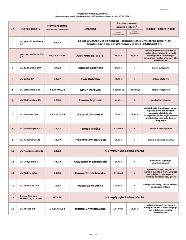 22.02.2016 r. WSTĘPNY WYNIK KONKURSU ofert na najem lokali użytkowych nr 1/2016 ogłoszonego w dniu 13.01.2016 r. Zaoferowana stawka zł/m2 Powierzchnia L.p. Adres lokalu podstawowa / dodatkowa Oferent pow. podstawowa 1 ul. gen. W. Andersa 35 2 gen. W. Andersa 35, 37 3 89,92 Rodzaj działalności pow. dodatkowa Lokal wycofany z konkursu - Komunikat Burmistrza Dzielnicy Śródmieście m. st. Warszawy z dnia 12.02.2016r. 66,32 / 13,88 Just Men sp. z o.o. 85,10 zł 40,10 zł sklep zielarski i cukiernia naturalna - zioła, żywność ekologiczna, kosmetyki naturalne i naturalne wyroby cukiernicze ul. Bednarska 20A 27,22 Tomasz Czarnota 29,39 zł x salon optyczny 4 ul. Dzika 17 14,77 Ewa Kubicka 51,00 zł x sklep płytowy 5 ul. Elektoralna 11 62,75/92,24 Artur Parzych 1 500,00 zł 1 500,00 zł salon fryzjerski 6 ul. Elektoralna 23 18,00 Iwona Bojczuk 66,00 zł x zakład fryzjerski 97,93/25,59 Gabriel Janowski 77,00 zł 21,00 zł działalność handlowa: salon wystawowy produktów rolnych, działalność usługowa: salon wystawowy produktów rolnych, biuro, magazyn ul. Górnośląska 27 12,77 Teresa Hećko 125,00 zł x sklep z pieczywem ul. Koszykowa 20 42,77 Przemysław Dziubek 62,00 zł x butik z odzieżą męską 10 ul. Nowosielecka 22 22,82 11 ul. Ordynacka 9 44,72 Krzysztof Modrzewski 23,00 zł x biurowa - agencja marketingowa 12 ul. Piękna 68A 14,50 Hanna Chmielewska 255,00 zł x sprzedaż kaw, herbat z całego świata z konsumpcją na miejscu i na wynos, wyroby cukiernicze, gofry 13 ul. Piwna 40/42 76,55 Mateusz Pacocha 60,99 zł x sklep sportowy, biuro sklepu, magazyn sklepu 14 Rynek Starego Miasta 19, 21/21A 15 ul. Wilcza 60 7 ul. Freta 44/46 8 9 nie wpłynęła żadna oferta nie wpłynęła żadna oferta 453,54 31,11/17,94 Hanna Chmielewska Strona 1 z 1 201,00 zł 55,00 zł sklep z kawą i herbatą z całego świata z konsumpcją na miejscu, wyroby cukiernicze