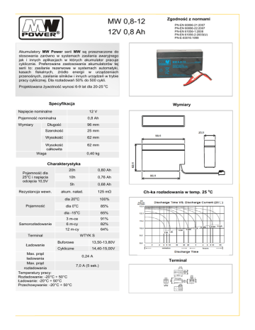 MW 0,8-12 12V 0,8 Ah Zgodność z normami PN-EN 60896-21:2007 PN-EN 60896-22:2007 PN-EN 61056-1:2008 PN-EN 61056-2:2003(U) PN-E-83016:1999 Akumulatory MW Power serii MW są przeznaczone do stosowania zarówno w systemach zasilania awaryjnego jak i innych aplikacjach w których akumulator pracuje cyklicznie. Preferowane zastosowania akumulatorów tej serii to: zasilanie rezerwowe w systemach automatyki, kasach fiskalnych, źródło energii w urządzeniach przenośnych, zasilanie silników i innych urządzeń w trybie pracy cyklicznej. Dla rozładowań 50% do 500 cykli. Projektowana żywotność wynosi 6-9 lat dla 20-25 oC Specyfikacja Wymiary Napięcie nominalne 12 V Pojemność nominalna 0,8 Ah Wymiary Długość 96 mm Szerokość 25 mm Wysokość 62 mm Wysokość całkowita Waga 62 mm 0,40 kg Charakterystyka Pojemność dla 25oC i napięcia odcięcia 10,5V Rezystancja wewn. Pojemność Samorozładowanie 20h 0,80 Ah 10h 0,76 Ah 5h 0,68 Ah akum. naład. 125 mΩ dla 20oC 100% dla 0oC 85% o dla -15 C 65% 3 m-ce 6 m-cy 91% 82% 12 m-cy Terminal Ładowanie Ch-ka rozładowania w temp. 25 oC 64% WTYK S Buforowe 13,50-13,80V Cykliczne 14,40-15,00V Max. prąd 0,24 A ładowania Max. prąd 7,0 A (5 sek.) rozładowania Temperatury pracy: Rozładowanie: -20°C ÷ 50°C Ładowanie: -20°C ÷ 50°C Przechowywanie: -20°C ÷ 50°C Terminal