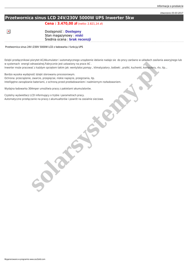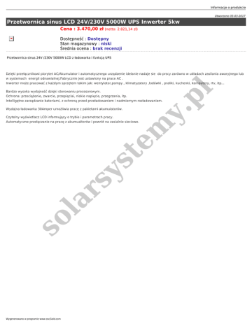 Informacje o produkcie Utworzono 03-03-2017 Przetwornica sinus LCD 24V/230V 5000W UPS Inwerter 5kw Cena : 3.470,00 zł (netto: 2.821,14 zł) Dostępność : Dostępny Stan magazynowy : niski Średnia ocena : brak recenzji Przetwornica sinus 24V /230V 5000W LCD z ładowarka i funkcją UPS Wydajna ładowarka 30Amper umożliwia pracę z pakietami akumulatorów. so la rs ys te m Czytelny wyświetlacz LCD informujący o trybie i parametrach pracy. Automatyczne przełączanie na pracę z akumualtorów i powrót na zasialnie sieciowe. y. p Bardzo wysoka wydajność dzięki sterowaniu procesorowym. Ochrona: przeciążenie, zwarcie, przepięciai, niskie napięcie, przegrzania, itp. Intelligętne zarządzanie bateriami, z ochroną przed przeładowaniem i nadmiernym rozładowaniem. Wygenerowano w programie www.oscGold.com l Dzięki przełącznikowi piorytet AC/Akumulator i automatycznego urządzenie idelanie nadaje sie do prscy zarówno w układach zasilania awaryjnego lub w systemach energii odnawialnej.Fabrycznie jest ustawiony na prace AC . Inwerter może pracować z każdym sprzętem takim jak: wentylator,pompy , klimatyzatory ,lodówki , praliki, kuchenki, komputery, rtv, itp... l y. p te m ys la rs so Możliwość dokupienia panel sterownia na kablu 10m Informacje o produkcie so la rs ys te m y. p l cena 280zł brutto Wygenerowano w programie www.oscGold.com