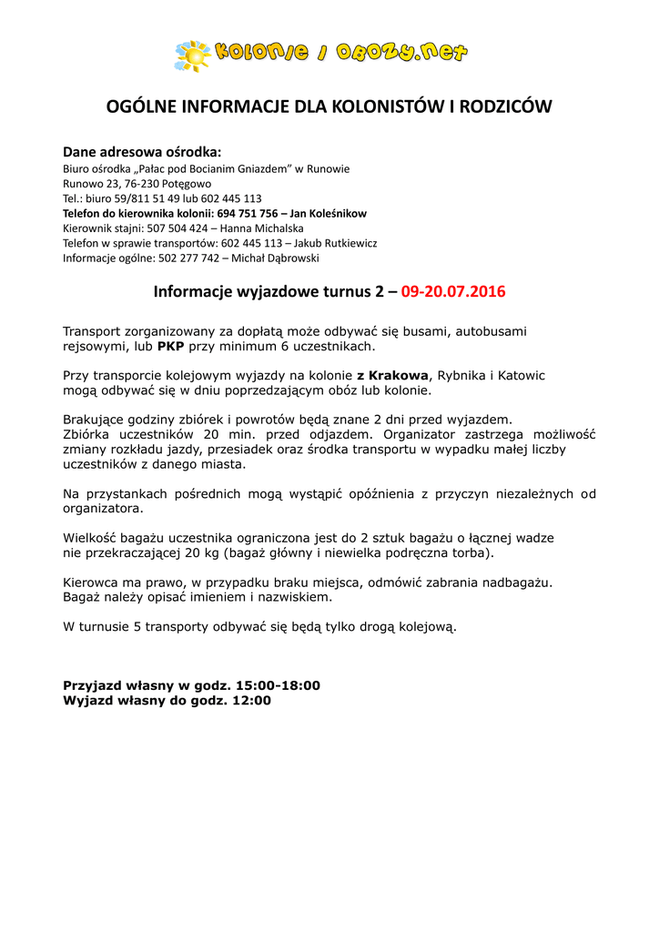 OGÓLNE INFORMACJE DLA KOLONISTÓW I RODZICÓW Dane adresowa ośrodka: Biuro ośrodka „Pałac pod Bocianim Gniazdem” w Runowie Runowo 23, 76-230 Potęgowo Tel.: biuro 59/811 51 49 lub 602 445 113 Telefon do kierownika kolonii: 694 751 756 – Jan Koleśnikow Kierownik stajni: 507 504 424 – Hanna Michalska Telefon w sprawie transportów: 602 445 113 – Jakub Rutkiewicz Informacje ogólne: 502 277 742 – Michał Dąbrowski Informacje wyjazdowe turnus 2 – 09-20.07.2016 Transport zorganizowany za dopłatą może odbywać się busami, autobusami rejsowymi, lub PKP przy minimum 6 uczestnikach. Przy transporcie kolejowym wyjazdy na kolonie z Krakowa, Rybnika i Katowic mogą odbywać się w dniu poprzedzającym obóz lub kolonie. Brakujące godziny zbiórek i powrotów będą znane 2 dni przed wyjazdem. Zbiórka uczestników 20 min. przed odjazdem. Organizator zastrzega możliwość zmiany rozkładu jazdy, przesiadek oraz środka transportu w wypadku małej liczby uczestników z danego miasta. Na przystankach pośrednich mogą wystąpić opóźnienia z przyczyn niezależnych od organizatora. Wielkość bagażu uczestnika ograniczona jest do 2 sztuk bagażu o łącznej wadze nie przekraczającej 20 kg (bagaż główny i niewielka podręczna torba). Kierowca ma prawo, w przypadku braku miejsca, odmówić zabrania nadbagażu. Bagaż należy opisać imieniem i nazwiskiem. W turnusie 5 transporty odbywać się będą tylko drogą kolejową. Przyjazd własny w godz. 15:00-18:00 Wyjazd własny do godz. 12:00 Warszawa Konwojent: Biuro „Cogito” – 667 162 817 -Wyjazd 09.07.2016 ul. Zamenhofa Parking przy Muzeum Żydów Polskich godz. 8:30, zbiórka – godz. 8:00 Transport autobusem wraz z biurem podróży „Cogito” -Powrót w dniu 20.06.2016 odbiór z autobusu na parking Torwar od ul. Czerniakowskiej ok. godz. 20:00 Katowice Konwojent: Biuro „Cogito” – 667 162 817 - WYJAZD 09.07.2016 Parking MCDonald’s ul. Górnośląska nr 55 róg ul. Ofiar Katynia (w kierunku na Wrocław) godz. 06:00, Zbiórka – godz. 05:45 wyjazd autobusem wraz z biurem podróży „Cogito” - Powrót w dniu 20.07.2016 odbiór z autobusu parking McDonald’s ul. Górnośląska 40A (w kierunku na Kraków) godz. 20:00 Łódź Konwojent Biuro „Cogito” – 667 162 817 - WYJAZD 09.07.2016 Parking Hipermarket E.leclerc, ul. Inflacka 45 przy stacji paliw godz. 10:15, Zbiórka – godz. 10:00 wyjazd autobusem z biurem podróży „Cogito” -Powrót w dniu 20.07.2016 odbiór z autobusu Parking Hipermarket E.leclerc, ul. Inflacka 45 godz. 18:00 Wrocław Konwojent Biuro „Cogito” – 667 162 817- WYJAZD 09.07.2016 o godzinie 7:00 McDonald’s przy stacji BP (prawa strona) obok salonu BMW, ul. Karkonoska przy trasie wylotowej na Kudowę, zbiórka – godz. 06:30. Transport autobusem z biurem podróży „Cogito” - Powrót w dniu 20.07.2016 odbiór z autobusu o godz. 16:45 McDonald’s przy stacji BP (prawa strona) obok salonu BMW, ul. Karkonoska przy trasie wylotowej na Kudowę Gdańsk/Gdynia Konwojent : Justyna Zielińska – Tel.: 721 124 806 - WYJAZD 09.07.2016 wyjazd pociągiem TLK Nr 15101 dosiadanie się do pociągu o godz. 17:42, zbiórka na peronie o godz. – 17:30 – Powrót w dniu 20.07.2016 miejsce zbiórki oraz powrotu zostanie podany na 2 dni przed wyjazdem Kraków Konwojent Justyna Zielińska – Tel.: 721 124 806 - WYJAZD 09.07.2016 wyjazd pociągiem z dworca „Kraków Główny” EIP nr 3506 o godz. 11:46, zbiórka na peronie 5 o godz. 11:30 – Powrót w dniu 20.07.2016 odbiór dzieci na peronie 5 o godz. 08:24 na dworcu „Kraków Główny” Poznań Konwojent : Biuro „Cogito” – 667 162 817 - WYJAZD 09.07.2016 Auchan ul. Głogowska 432, przy skrzyżowaniu A2 i drogi nr 5, przy McDonald’s o godz. 13:00, zbiórka na miejscu o godz. 12:30. Transport autobusem z biurem podróży „Cogito” - Powrót w dniu 20.07.2016 Auchan ul. Głogowska 432, przy skrzyżowaniu A2 i drogi nr 5, przy McDonald’s o godz. 13:00. Transport autobusem z biurem podróży „Cogito” Koszalin Konwojent : Justyna Dusza – Tel.: 796 499 829 - WYJAZD 09.07.2016 Dosiadanie do pociągu „Rybak” Wagon 12 wyjazd - godz. 13:06, zbiórka – 12:50 na peronie I – Powrót w dniu 20.07.2016 odbiór z pociągu nr 58101 o godz. 11:23 peron I Szczecin Konwojent : Justyna Dusza – Tel.: 796 499 829 - WYJAZD 09.07.2016 Pociąg „Rybak” Wagon 12 wyjazd - godz. 10:51, zbiórka – 10:40 na peronie II – Powrót w dniu 20.07.2016 odbiór z pociągu nr 58101 Wagon 12 o godz. 13:38 na peronie II WAKACJE W SIODLE 2016 - Profesjonalny Obóz Jeździecki oraz Pałacowa Przygoda Małej Optymistki Co ze sobą warto zabrać: bryczesy do jazy konnej lub wygodne spodnie (leginsy, dresy) kurtka nieprzemakalna, bluza lub kamizelka długie skarpety sztylpy, oficerki, gumowce lub inne buty za kostkę do jazdy konnej buty turystyczne do wędrówek klapki, kąpielówki, przybory toaletowe, ręcznik latarka, czapkę lub chustkę na głowę OBOWIĄZKOWO! Karimata, śpiwór (zakwaterowanych w namiotach) spray na komary i owady Proszek do prania Kieszonkowe (średnio ok. 10 zł na dzień) Rękawiczki WAŻNA legitymacja szkolna OBOWIĄZKOWO! Podpisany protokół na odznakę Jeżdżę Konno* link do pobrania http://pzj.pl/sites/default/files/plikoteka/protokol_egzaminu.doc Wypełniona karta uczestnika wraz z zaznaczoną dietą W naszej stajni prowadzimy także mini komis z artykułami jeździeckimi. Będzie dodatkowo możliwość zakupienia nowych drobnych akcesoriów jeździeckich. Dotyczy tylko osób nie posiadających odznaki ADRENALINA TEAM Co warto ze sobą zabrać: buty 2 pary w tym jedna za kostkę stare rzeczy do brudzenia na zajęcia survivalowe (dresy, moro itp.) latarka czapka chustka grube wełniane skarpety zwykłe skarpety kurtka nieprzemakalna kąpielówki klapki przybory toaletowe ręczniki spray na komary i owady Karimata, śpiwór Bidon lub manierka Mały plecak podróżny WAŻNA legitymacja szkolna OBOWIĄZKOWO! Po
