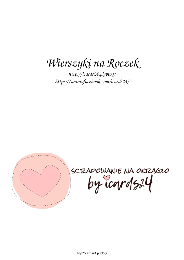 Wierszyki na Roczek http://icards24.pl/blog/ https://www.facebook.com/icards24/ http://icards24.pl/blog/ Dziś już mija pierwszy roczek, na mej główce pierwszy loczek, więc zapraszam Was do siebie, zabawimy się jak w niebie! Będzie tort, a na nim świeczka, uśmiechnięte me usteczka. Oprócz tortu, mnóstwo soku i tak będzie już co roku! Minął właśnie roczek cały, odkąd jestem na tym świecie, Chociaż byłem całkiem mały, już urosłem-pewnie wiecie. Więc zaprosić pragnę Was, bo urodzin przyszedł czas. Świeczki się na torcie mienią, obok wiśnie się czerwienią, cudnie pachnie czekolada, skrzy się w szklankach lemoniada, baloniki wiszą w górze, klaun oklasków zbiera burzę, a to wszystko z tej przyczyny, że masz pierwsze urodziny! Jeden kroczek, drugi kroczek Adaś zaraz skończy roczek. Z tej okazji tort pieczemy i przyjęcie wydajemy Wpadnij chociaż na chwileczkę, zobacz jak Adaś gasi świeczkę. Na swym torcie za chwileczkę Adaś pierwszą zdmuchnie świeczkę więc serdecznie zapraszamy byś się cieszył razem z nami, że nasz mały niemowlaczek to już roczny dziś dzieciaczek http://icards24.pl/blog/ Rok mija od moich narodzin i każdy się chyba zgodzi że uczcić wypada tą chwilę. Wpadajcie więc do nas i tyle. Idzie miś, żyrafa wielka, lew grzywiasty, mysz maleńka, wszyscy razem z prezentami, z najlepszymi życzeniami. Bo to dzień radosny wielce – masz o jeden roczek więcej! Idzie misio, idzie konik, małpka, piesek no i słonik. Wszyscy razem z balonami, z najlepszymi życzeniami. Bo to dzień radosny wielce, mam już jeden roczek więcej! I dzisiaj po roku doświadczeń, choć myślisz, ze wszystko już znasz, zdmuchnij swą pierwszą świeczkę, bo zawsze jest pierwszy raz. Promyku naszych nadziei, ty nie wiesz jak ważne dziś święto, to tylko dla ciebie rok temu pierwsze jaśminy ucięto. Rok temu ujrzałeś pierwszą chmurkę na modrym niebie, rok temu, pierwszy wróbelek wyćwierkał piosenkę dla ciebie. Rok temu, pierwszy raz Ojciec pokazał Ci cały świat, rok temu, właśnie rok temu, nie miałeś jeszcze lat. http://icards24.pl/blog/