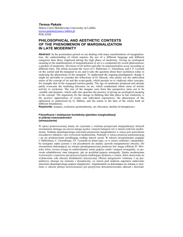 Teresa Pękala Maria Curie-Skłodowska University in Lublin [email protected] POLAND PHILOSOPHICAL AND AESTHETIC CONTEXTS OF THE PHENOMENON OF MARGINALIZATION IN LATE MODERNITY Abstract: In the postmodern period we are dealing with many manifestations of marginalization, the understanding of which requires the use of a different language and different categories than those employed during the high phase of modernity. Giving an axiological meaning to the manifestations of marginalization in art is a comparatively recent phenomenon, a product of modernity. Divisions of art before and after its autonomization occur according to different rules. The article recounts the views of J. Habermas, C. Greenberg, and J. F. Lyotard on the central and the marginal in art, and it asks the question about their usefulness today in analyzing the phenomena of the marginal. To understand the ongoing paradigmatic change it might be advisable to consider the reflections of D. Mersch, who points out the ambivalent status of the concept of art and the avant-garde, which permits us to vindicate other concepts, for example that of the rearguard (arrière-garde). The age of modernity produced and already partly overcame the totalizing discourse on art, which condemned whole areas of artistic activity to exclusion. The size of the margins seen from this perspective turns out to be variable and dynamic, which calls into question the practice of giving an axiological meaning to the concept. The arguments for the change in thinking that take place in late modernity is the positive appreciation of events and individual experiences, the phenomena of the ephemeral as understood by G. Böhme, and the return to the idea of the whole built on different foundations. Keywords: margins, exclusion, postmodernity, art, discourse, decline of metaphysics. Filozoficzne i estetyczne konteksty zjawiska marginalizacji w późnej nowoczesności (streszczenie) W epoce ponowoczesnej mamy do czynienia z wieloma przejawami marginalizacji, których zrozumienie domaga się użycia innego języka i innych kategorii niż w latach rozkwitu modernizmu. Nadanie aksjologicznego znaczenie przejawom marginalności w sztuce jest zjawiskiem stosunkowo młodym i jest wytworem modernizmu. Podziały w sztuce przed jej autonomizacją i po jej przekroczeniu przebiegają według innych zasad. W tekście przypomniano poglądy J. Habermasa, C. Greenberga, J.F. Lyotarda na temat tego, co w sztuce centralne i marginalne, by następnie zadać pytanie o ich przydatność do analizy zjawisk marginalności obecnie. Do zrozumienia dokonującej się zmiany paradygmatycznej pomocne być mogą refleksje D. Merscha, który zwraca uwagę na ambiwalentny status pojęcia sztuki i pojęcia awangardy, co pozwala rehabilitować inne kategorie, jak na przykład pojęcie ariregrady. Epoka modernizmu wytworzyła i częściowo już przezwyciężyła totalizujące dyskursy o sztuce, które skazywały na wykluczenie całe obszary działalności artystycznej. Obszar marginesów widziany z tej perspektywy okazuje się zmienny i dynamiczny, co stawia pod znakiem zapytania nadawanie znaczenia aksjologicznego pojęciu marginesów. Argumentami za dokonującą się zmianą w myśleniu w okresie późnej nowoczesności jest pozytywne dowartościowanie zdarzeń i doświad- czeń jednostkowych, zjawisk efemeryczności, jak u G. Böhme, a także powrót do zbudowanej na innych podstawach idei całości. Słowa kluczowe: marginesy, wykluczenie, ponowoczesność, sztuka, dyskurs, upadek metafizyki. Krzysztof Cichoń ……… [email protected] AROUND THE MARGIN IN EIGHTY WORLDS AND TWENTY YEARS. REMARKS ON THE PARADOXICAL NATURE OF THE NOTION OF A MARGIN Abstact: This article obviously aims at messing around, checking if borderlines of disciplines can be ignored, so as not to lose sight of their margins. The increase in the interest in margins may be associated with the change of the cultural paradigm at the turn of 1980s and 1990s, the so-called “spatial turn”, i.e. a rediscovery of the cognitive indispensability of spatial metaphors. This turn was also influenced by intrinsically ex-centric and centrifugal strivings of the avant-garde. However, a much greater incentive to deal with the topic is provided by the common uncertainty of our own position, role and usefulness in the global circulation of culture. A strong sense of marginalization or marginality in the culture described as global is paradoxical in the light of geometry’s “intuition-free” generalizations. There is no margin on the surface of a sphere, at most each point of the spherical space can be described as peripheral locality. And in each such locality, peripheral vicissitudes may occur and do occur, as dramatic as they are uninteresting to anyone outside the locality. It is quite a precise model – more geometrico – of the cultural processes which are most frequently called alienation, defamiliarization, disillusion, enstrangement or estrangement. Only having referred a margin to a triangle formed by the three terms остранение, Verfremdung, dépaysement, can we can fully understand the reasons for the constant fascination with the marginal. Keywords: alienation, disillusion, enstrangement, остранение, Verfremdung, dépaysement, perimeter-peryferium, das Unheimliche/the uncanny. Dookoła marginesu w osiemdziesiąt światów i dwadzieścia lat. Uwagi na temat paradoksalnej natury marginalności (streszczenie) Celem artykułu jest oczywiście wprowadzenie bałaganu, sprawdzenie, czy możliwe jest ignorowanie granic dyscyplin choćby po to, by ani na moment nie tracić z oczu marginesu. Wzrost zainteresowania marginesami, marginaliami da się powiązać z kolejną zmianą paradygmatu kultury na przełomie lat osiemdziesiątych i dziewięćdziesiątych XX wieku, tzw. zwrotem przestrzennym, czyli (ponownym) odkryciem dogodności poznawczej metafor przestrzennych. Rolę w przygotowaniu tego zwrotu odeg