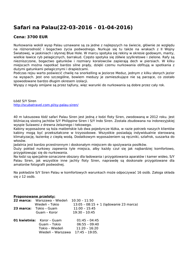 Safari na Palau(22-03-2016 - 01-04-2016) Cena: 3700 EUR Nurkowania wokół wysp Palau uznawane są za jedne z najlepszych na świecie, głównie ze względu na różnorodność i bogactwo życia podwodnego. Nurkuje się tu także na wrakach z II Wojny Światowej, w jaskiniach i słynnej Blue Hole. W marcu spotyka się rekiny w okresie godowym, manty, wielkie ławice ryb pelagicznych, barrakud. Często spotyka się żółwie szylkretowe i zielone. Rafy są niezniszczone, bogactwo gatunków i rozmiary koralowców zapierają dech w piersiach. W kilku miejscach można napotkać bardzo silne prądy, dzięki czemu nurkowania obfitują w spotkania z dużymi gatunkami pelagicznymi i drapieżcami. Podczas rejsu warto poświecić chwilę na snorkelling w Jeziorze Meduz, jednym z kilku słonych jezior na wyspach. Jest ono szczególne, bowiem meduzy je zamieszkujące nie są parzące, co zostało spowodowane bardzo długim okresem izolacji. Wyspy z reguły omijane są przez tajfuny, więc warunki do nurkowania są dobre przez cały rok. Łódź S/Y Siren http://scubatravel.com.pl/sy-palau-siren/ 40 m luksusowa łódź safari Palau Siren jest jedną z łodzi floty Siren, zwodowaną w 2012 roku. Jest bliźniaczą siostrą jachtów S/Y Philippine Siren i S/Y Indo Siren. Została zbudowana na indonezyjskiej wyspie Sulawesi z drewna żelaznego i tekowego. Kabiny wyposażone są łoża małżeńskie lub dwa pojedyncze łóżka, w razie potrzeb naszych klientów kabiny mogą być przekształcone w trzyosobowe. Wszystkie posiadają indywidualnie sterowaną klimatyzację, łazienkę z ciepłą wodą. Dodatkowym wyposażeniem są ręczniki, szlafrok, suszarka do włosów. Jadalnia jest bardzo przestronnym i doskonałym miejscem do spożywania posiłków. Duży pokład nurkowy zapewnia tyle miejsca, alby każdy czuł się jak najbardziej komfortowo, przygotowując się do nurkowania. Na łodzi są specjalnie oznaczone obszary dla ładowania i przygotowania aparatów i kamer wideo, S/Y Palau Siren, jak wszystkie inne jachty floty Siren, naprawdę są doskonale przygotowane dla amatorów fotografii podwodnej. Na pokładzie S/Y Siren Palau w komfortowych warunkach może odpoczywać 16 osób. Załoga składa się z 12 osób. Proponowane przeloty: 22 marca: Warszawa – Wiedeń Wiedeń – Tokio 23 marca: Tokio – Guam Guam – Koror 01 kwietnia: Koror – Guam Guam – Tokio Tokio – Wiedeń Wiedeń – Warszawa 10:30 – 11:50 13:05 – 08:15 + 1 (lądowanie 23 marca) 11:00 – 15:45 19:30 – 10:45 01:45 – 04:45 06:55 – 09:40 11:20 – 16:20 17:45 – 19:05. Ramowy program wyjazdu: Dzień 1, 22 marca 2016 Spotkanie na lotnisku im. F. Chopina w Warszawie, odprawa biletowo – bagażowa i przelot przez Wiedeń do Tokio. Dzień 2, 23 marca 2016 Po przylocie do Tokio przesiadka do samolotu na Guam i dalej do Koror. Po przylocie na miejsce powitanie przez miejscowego kontrahenta i transfer na łódź S/Y Palau Siren. Po dotarciu na miejsce powitanie przez załogę i zakwaterowanie w kabinach. Późna kolacja i nocleg na łodzi. Dzień 3 – 8 , 24 – 29 marca 2016 Nurkowania wokół archipelagu Palau. W trakcie rejsu wykonuje się do 22 nurkowań, łącznie z nurkowaniami nocnymi. Podczas rejsu pełne wyżywienie i napoje wraz z piwem. Inne napoje alkoholowe dodatkowo płatne. Wybrane miejsca nurkowe: Ulong Channel Miejsce to jest często uznawane za najlepsze miejsce nurkowe na Palau. Nurkuje się tu w prądzie przy pięknych ścianach koralowców kamiennych (madreporowych), porośniętych także miękkimi gatunkami, mija się duże grupy rekinów i innych ryb pelagicznych, ogromne małże, imponujące koralowce "sałatowe". W rafie kryją się wielki wargacze i niezliczona ilość ryb rafowych. Siaes Tunnel Miejsce to dostarcza emocji podczas nurkowania w naturalnie oświetlonym tunelu, którego ściany porośnięte są kamiennymi i miękkimi koralowcami, zamieszkałymi przez liczne gatunki bezkręgowców. U wylotu tunelu często spotyka się rekiny białopłetwe i ławice ostroboków. Shark City Miejsce na południowy zachód od Ulong Channel. Nurkowanie przy ścianie, która opada do 50 m. Silne prądy przyciągają duże gatunki pelagiczne - szare rekiny rafowe, żarłacze bycze i rekiny młoty. Spotyka się tu także orlenie i wielkie ławice papugoryb (z rodzaju bumphead). Chandelier Cave To fantastyczny system jaskiń, złożony z pięciu komór, w których stalaktyty i stalagmity tworzą wrażenie "żyrandoli" (stąd nazwa). Wejście jest szerokie i dobrze oświetlone, jednak głębsza penetracja wymaga posiadania latarki. Należy trzymać się blisko przewodnika, żeby nie zgubić drogi. Teshio Maru Statek, który został zatopiony 30 marca 1944 roku na północ od portu Malakal, kiedy starał się uciec z wewnętrznej laguny. Ten japoński statek towarowy spoczywa teraz na sterburcie na głębokości 25 m. Ma 100 m długości i jest najciekawszym wrakiem na Palau. Jake Sea Plane To samolot rozpoznawczy, który najprawdopodobniej rozbił się przy starcie. Spoczywa na dnie w jednym kawałku i jest świetnym obiektem do fotografowania. Występuje tu lekki prąd i widoczność jest zwykle doskonała. Wrak zamieszkują liczne gatunki mięczaków, często widać tu ośmiornice, mątwy, ślimaki nagoskrzelne. Pobliska rafa jest schronieniem dla młodych osobników wielu gatunków ryb rafowych. Blue Corner Miejsce to jest najsłynniejszym nurkowiskiem na Palau i zostało uznane za najlepsze miejsce nurkowe na świecie. Słynie z bardzo silnych prądów, w których licznie przemieszczają się rekiny, ostroboki, napoleony, lucjany i barrakudy. Do nurkowania tutaj niezbędne są haki rafowe i większe doświadczenie. German Channel Kanał ten został stworzony podczas niemieckiej okupacji (1899 - 1914), by ułatwić transport fosfatów, które były tu wydobywane. Dzisiaj kanał ten jest znany ze spotkań z mantami oraz rekinami biało- i czarnopłetwymi. Dzień 9, 30 marca 2016 Śniadanie na pokładzie. Po 
