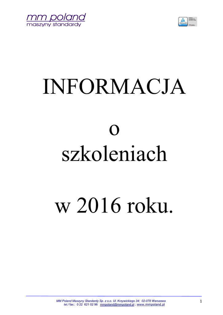 INFORMACJA o szkoleniach w 2016 roku. MM Poland Maszyny Standardy Sp. z o.o. Ul. Krzywickiego 34; 02-078 Warszawa tel./ fax.: 0 22 621 02 96 [email protected] ; www.mmpoland.pl 1 MM Poland Maszyny Standardy podobnie jak w latach ubiegłych przez kolejny rok pragnie wspierać Państwa w codziennej pracy. Nasze propozycje szkoleniowe wiążą się z dążeniem do ciagłego wzmacniania wiedzy i umiejętności praktycznych pracowników działów aparatury medycznej i utrzymania ruchu w placówkach medycznych. Mając na uwadze propozycje przekazane nam po szkoleniach i prezentacjach, a także informacje zebrane w trakcie spotkań przygotowaliśmy różnorodne zajęcia szkoleniowe w formie warsztatów i seminariów. Zachęcamy do korzystania z proponowanych form doskonalenia swoich umiejętności. Niepodważalnym walorem naszych propozycji szkoleniowych są: doświadczenie – ponad 10 lat trwałej współpracy z placówkami medycznymi, ciągła obecność w szpitalach, aktualizowana na bieżąco wiedza, nowoczesna forma przekazu oraz pełna otwartość na potrzeby uczestników. W 2016 roku tematyka zajęć szkoleniowych proponowanych przez Dział Szkoleń MM Poland Maszyny Standardy składa się z następujących bloków : M1 – M3 – zajęcia dla pracowników działów aparatury oraz serwisów, obejmujące zagadnienia techniczne V4 – V8 – szkolenia podnoszące umiejętności praktyczne oraz poszerzające wiedzę ogólną związaną z zarządzaniem. S1 – S3 – bezpłatne szkolenia stałe przeprowadzane w siedzibie MM Poland Maszy Standardy, dla wszystkich zainteresowanych po wcześniejszym zgłoszeniu. Z1 – Z4 – szkolenia przeprowadzane na zamówienie, przygotowane z uwzględnieniem preferencji i oczekiwań uczestników; przeprowadzane w ustalonym terminie i miejscu, dodatkowo jako kontynuacja szkolenia proponowane są usługi doradcze i konsultacje. Zapraszamy do udziału w warsztatach, seminariach oraz prezentacjach. MM Poland Maszyny Standardy Sp. z o.o. Ul. Krzywickiego 34; 02-078 Warszawa tel./ fax.: 0 22 621 02 96 [email protected] ; www.mmpoland.pl 2 Zajecia szkoleniowe Kod Tytuł Opis Typ Testy bezpieczeństwa elektrycznego sprzętu medycznego wg normy PN- EN 62353:2015 Testy bezpieczeństwa elektrycznego sprzętu medycznego wg normy PNEN 62353:2015 M2 Kontrola temperatury w sprzęcie chłodniczym i grzewczym. Zasady i metody badania temperatury. Praktyczne pomiary z zastosowaniem nowoczesnego oprzyrządowania. Warsztaty M3 Testery i symulatory w praktyce pracy serwisów medycznych Stosowanie sprzętu kontrolno pomiarowego przez serwisy medyczne. Zagadnienia praktyczne. Warsztaty V4 Praktyczne aspekty odpowiedzialności cywilnej inżynierów serwisu aparatury medycznej. Przedstawienie podstawowych zagadnień związanych z pracą działów serwisu i aparatury medycznej z punktu widzenia obowiązującego prawa. Szkolenie V5 Aspekty prawne, techniczne oraz organizacyjne użytkowania aparatury medycznej. Prezentacja zagadnień związanych z użytkowaniem przez placówki medyczne sprzętu wykorzystywanego w procesie leczenia i diagnozowania pacjentów. Szkolenie V6 Opracowanie procedur w działach aparatury medycznej i / lub serwisie. Omawianie i proponowanie rozwiązań w zakresie opracowania procedur w działach aparatury medycznej oraz serwisie Warsztaty V7 Dokumentacja medyczna. Jak się chronić przed roszczeniami pacjentów? Praktyczne wskazówki doświadczonego prawnika na temat prowadzenia dokumentacji medycznej. Szkolenie M1 Grupa docelowa Warsztaty MM Poland Maszyny Standardy Sp. z o.o. Ul. Krzywickiego 34; 02-078 Warszawa tel./ fax.: 0 22 621 02 96 [email protected] ; www.mmpoland.pl Inżynierowie i technicy, pracownicy działów aparatury oraz serwisów. Kadra zarządzająca oraz pracownicy działów aparatury i serwisów 3 Szkolenia stałe przeprowadzane w siedzibie MM Poland Kod Tytuł Miejsce Dzień S1 System Informatyczny MM Ewidencja - w nadzorowaniu aparatury medycznej i infrastruktury technicznej Warszawa każdy piątek Warszawa do uzgodnienia Warszawa każdy piątek S2 S3 MM Inwentaryzacja - Przeprowadzanie znakowania kodami kreskowymi i inwentaryzacja środków trwałych Wykorzystanie symulatorów i testerów w kontroli aparatury medycznej Szkolenia przeprowadzane na zamówienie. Kod Tytuł Z1 Codzienne, wykonywane przez użytkowników przeglądy aparatury medycznej Z2 Testery bezpieczeństwa i symulatory urządzeń medycznych Z3 Budowa systemu nadzorowania aparatury medycznej w moim szpitalu Z4 Znakowanie kodami kreskowymi składników majątku / inwentaryzacja Miejsce Data Warszawa / lub do uzgodnienia do uzgodnienia Warszawa / lub do uzgodnienia do uzgodnienia Warszawa / lub do uzgodnienia do uzgodnienia Warszawa / lub do uzgodnienia do uzgodnienia MM Poland Maszyny Standardy Sp. z o.o. Ul. Krzywickiego 34; 02-078 Warszawa tel./ fax.: 0 22 621 02 96 [email protected] ; www.mmpoland.pl 4 Ceny szkoleń Publikowane są na bieżąco na stronie internetowej - ww.mmpoland.pl/szkolenia Jednak od podanych kwot przysługują uczestnikom upusty wg podanych niżej zasad: Pierwsza zgłoszona osoba Druga i kolejna osoba 5% 20% Wdrożone oprogramowanie MM Ewidencja 10% 25% Wdrożone oprogramowanie MM Inwentaryzacja + MM Ewidencja 15% 40% Asystę techniczną do programu MM Inwentaryzacja + MM Ewidencja 20% 45% Asystę techniczną do programu MM Inwentaryzacja 10% 15% Asystę techniczną do programu MM Ewidencja 20% 30% 5% 10% Dla placówek medycznych i serwisów posiadających: Wdrożone oprogramowanie MM Inwentaryzacja Kupujących akcesoria w MM Poland Podawane ceny szkoleń zawierają: 1. 2. 3. 4. 5. Materiały dydaktyczne, Materiały piśmiennicze [notatnik, długopis], Dyplom potwierdzający ukończenie szkolenia, Konsultacje poszkoleniowe, Serwisy kawowe i obiadowe Korzyści: 1. Gwarantowana, najwyższa jakość zajęć; 2. Doświadczenie, praktyka i wiedza - zajęcia prowadzone przez doświadczonych trenerów - praktyków; 3. Rozwój placówki medycznej – dzi