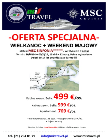 -OFERTA SPECJALNAWIELKANOC + WEEKEND MAJOWY Statek: MSC SINFONIA*****, Wypłynięcie z Genui Termin: 20/04/14 – 02/05/14, 13 dni – 12 nocy, Pełne wyżywienie Dzieci do 17 lat podróżują za darmo !!! Kabina wewn. Bella: 499 €/os. 599 €/os. Apartament : 769 €/os. Kabina zewn. Bella: + opłaty portowe: 135 €/os. + ubezpieczenie: 15 €/os. + dojazd własny Dopłaty do kabin typu Fantastica: 80 €/os. - kabiny wewn. i zewn. ------------------------------------------------------------------ tel. (71) 794 81 79 [email protected] www.mistravel.pl Program rejsu: Dzień Data Program rejsu Wpłynięcie Wypłynięcie 1 Nd. 20.04. GENOA, ITALY --- 17:00 2 Pon. 21.04. DZIEŃ NA MORZU ... ... 3 4 Wt. 22.04. Śr. 23.04. MALAGA, SPAIN DZIEŃ NA MORZU 14:00 ... 20:00 ... 5 Czw. 24.04. FUNCHAL, PORTUGAL 9:00 17:00 6 Pt. 25.04. SANTA CRUZ DE TENERIFE, SPAIN 10:00 18:00 7 8 Sob. 26.04. ARRECIFE DE LANZAROTE, SPAIN Nd. 27.04. AGADIR, MOROCCO 10:00 10:00 18:00 17:00 9 Pon. 28.04. DZIEŃ NA MORZU ... ... 10 Wt. 29.04. CADIZ, SPAIN 9:00 17:00 11 Śr. 30.04. DZIEŃ NA MORZU ... ... 12 13 Czw. 01.05. Pt. 02.05. BARCELONA, SPAIN GENOA, ITALY 7:00 10:00 13:00 Kraje, które odwiedzisz: WŁOCHY – HISZPANIA – PORTUGALIA – MAROKO Cruising to nowy sposób zwiedzania świata, niezapomniane wakacje, wspaniała przygoda i mnóstwo atrakcji. Takiej rozrywki nie dostarczy żadna wycieczka czy typowe wczasy. Będąc na statku oglądamy świat z innej perspektywy, odkrywamy wiele ciekawych miejsc, do których nie dotarlibyśmy wykupując tradycyjny pobyt w hotelu. Podczas snu w swoim wygodnym apartamencie, statek przeniesie Cię w nowe miejsce, które zobaczysz i poznasz już o poranku. Wszystko to w standardzie luksusowego 5-gwiazdkowego hotelu, który zadowoli gusta nawet najbardziej wymagającego Klienta. Na pokładzie znajdziesz baseny, kasyna, teatry, kina 4D, galerie handlowe, pola minigolfa oraz wiele innych niezwykłych atrakcji… Cena obejmuje: 13-dniowy rejs statkiem MSC Sinfonia – zakwaterowanie w kabinie wybranej kategorii (12 noclegów); serwis bagażowy i kabinowy; wyżywienie – 3 główne posiłki, podwieczorek, bufet i przekąski o północy; korzystanie z basenu i innych urządzeń sportoworekreacyjnych; udział we wszystkich imprezach organizowanych na statku. Cena nie obejmuje: wycieczek fakultatywnych w trakcie rejsu; korzystania z punktów usługowych na statku (fotograf, pralnia, SPA, Internet); napojów gazowanych i alkoholowych zamawianych w barach i do posiłków; obowiązkowych napiwków dla obsługi statku (6 €/dobę/os. dorosłą; dzieci od 14 r.ż. – 3 €/dobę). Istnieje możliwość wykupienia pakietu ALL INCLUSIVE: 23 €/dzień/os. dorosłą, dzieci od 3 r.ż. – 12 €/dzień. ------------------------------------------------------------------ tel. (71) 794 81 79 [email protected] www.mistravel.pl