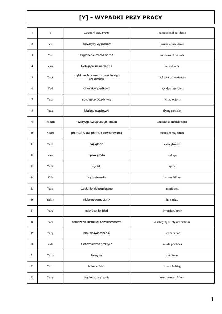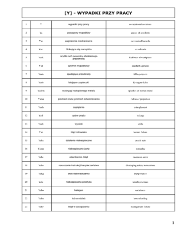 [Y] - WYPADKI PRZY PRACY 1 Y wypadki przy pracy occupational accidents 2 Ya przyczyny wypadków causes of accidents 3 Yac zagrożenia mechaniczne mechanical hazards 4 Yaci blokujące się narzędzia seized tools 5 Yack szybki ruch powrotny obrabianego przedmiotu kickback of workpiece 6 Yad czynnik wypadkowy accident agencies 7 Yada spadające przedmioty falling objects 8 Yade latające cząsteczki flying particles 9 Yadem rozbryzgi roztopionego metalu splashes of molten metal 10 Yader promień rzutu; promień odwzorowania radius of projection 11 Yadh zaplątanie entanglement 12 Yadi upływ prądu leakage 13 Yadk wycieki spills 14 Yah błąd człowieka human failure 15 Yaha działanie niebezpieczne unsafe acts 16 Yahap niebezpieczne żarty horseplay 17 Yahc odwrócenie, błąd inversion, error 18 Yahe naruszanie instrukcji bezpieczeństwa disobeying safety instructions 19 Yahg brak doświadczenia inexperience 20 Yahi niebezpieczna praktyka unsafe practices 21 Yaho bałagan untidiness 22 Yahu luźna odzież loose clothing 23 Yahy błąd w zarządzaniu management failure 1 24 Yahym modyfikacje urządzeń i procesów plant and process modifications 25 Yam błąd konstrukcyjny faulty construction 26 Yama wada materiału material failure 27 Yamab zmęczenie metalu metal fatigue 28 Yamad zużycie wear 29 Yamag starzenie się materiału ageing 30 Yame zwarcie doziemne earth faults 31 Yamei uszkodzenie izolacji faulty insulation 32 Yan szkodliwe warunki pracy faulty working conditions 33 Yas zły nadzór faulty supervision 34 Yat złe szkolenie faulty training 35 Yau czynnik psychiczny stress factors 36 Yaum napięcie psychiczne mental stress 37 Yaun stres neuropsychic stress 38 Yauno przepracowanie overstrain 39 Yaunr brak czujności relaxed vigilance 40 Yaunu naprężenie jednostronne unilateral stress 41 Yc zagrożenia chemiczne chemical hazards 42 Yd czas wypadku time of accident 43 Ye ekspozycja exposure 44 Yea ekspozycja chwilowa short-term exposure 45 Yeb ekspozycja długotrwała long-term exposure 46 Yec warunki ekspozycji conditions of exposure 47 Yece narażenie pozazawodowe paraoccupational exposure 48 Yecp narażenie w okresie ciąży parental exposure 2 49 Yed czas ekspozycji length of exposure 50 Yef narażenie podprogowe subthreshold exposure 51 Yek zależność dawka-reakcja dose-response relationship 52 Yel zależność zajęcie-ekspozycja job-exposure relation 53 Yen efekt biologiczny biological effects 54 Yena efekt cytologiczny cytological effects 55 Yenb efekt histologiczny histological effects 56 Yenc działanie rakotwórcze carcinogenic effects 57 Yenco działanie kokarcynogenne cocarcinogenic effects 58 Yend działanie na skórę dermatological effects 59 Yene działanie biochemiczne biochemical effects 60 Yenep działanie fotochemiczne photochemical effects 61 Yenf skutki w zakresie tworzenia włókien (fibrogeneza) fibrogenic effects 62 Yeng działanie genetyczne genetic effects 63 Yenga działanie powodujące bezpłodność antifertility effects 64 Yenge oddziaływanie na zarodek embryotropic effects 65 Yengg działanie gonadotropowe gonadotropic effects 66 Yengm działanie mutagenne mutagenic effects 67 Yengo zaburzenia chromosomowe chromosome changes 68 Yengt oddziaływanie na płód teratogenic effects 69 Yenh działanie na krew haematological effects 70 Yenha aktywność hemolityczna haemolytic activity 71 Yeni oddziaływanie na układ sercowy cardiological effects 72 Yenk działanie powodujące zaćmę cataractogenic effects 73 Yenl działanie powodujące białaczkę leukaemogenic effects 3 74 Yenn oddziaływanie na układ nerwowy neurological effects 75 Yenna działanie narkotyczne narcotic effects 76 Yenne działanie neuroendokrynoligiczne neuro-endocrine effects 77 Yenno skutki neuropsychiczne neuropsychic effects 78 Yenp oddziaływanie na psychikę psychological effects 79 Yens zniszczenie powiązań molekularnych molecular bond disruption 80 Yent efekt termiczny thermal effects 81 Yenu działanie toksyczne toxic effects 82 Yenua toksyczność ostra acute toxicity 83 Yenub toksyczność chroniczna chronic toxicity 84 Yenuc działanie komórkobójcze cytotoxic effects 85 Yenuca działanie toksyczne na szpik myelotoxic effects 86 Yenud toksyczność skórna dermal toxicity 87 Yenue wpływ toksyczny na zarodek embryotoxic effects 88 Yenug wpływ toksyczny na krew haematotoxic effects 89 Yenugc działanie cjankotwórcze cyanogenic effects 90 Yenuh działanie toksyczne na wątrobę hepatotoxic effects 91 Yenui działanie toksyczne (wziewanie) inhalation toxicity 92 Yenuj działanie toksyczne (ssanie) aspiration toxicity 93 Yenuk działanie kardiotoksyczne cardiotoxic effects 94 Yenum działanie nefrotoksyczne nephrotoxic effects 95 Yenun działanie neurotoksyczne neurotoxic effects 96 Yenune działanie toksyczne na narząd wzroku ophthalmotoxic effects 97 Yenuno działanie ototoksyczne ototoxic effects 98 Yenup działanie toksyczne na płuca pneumotoxic effects 4 99 Yenur działanie na hormony endocrine effects 100 Yenus działanie toksyczne na śledzionę splenotoxic effects 101 Yenuu skutki immunotoksyczne immunotoxic effects 102 Yenuz cecha skumulowana cumulative properties 103 Yenw działanie antagonistyczne antagonistic effects 104 Yenx działanie hamujące inhibitory effects 105 Yeny działanie opóźnione delayed effects 106 Yenz współdziałanie synergism 107 Yenzt synergia temperatura-toksyczność temperature-toxicity synergism 108 Yep obciążenie polutantami pollutant burden 109 Yex dodatkowe efekty słuchowe extra-auditory effects 110 Yh zagrożenia zdrowia health hazards 111 Yhb zagrożenia biologiczne biological hazards 112 Yhe ekologia kliniczna clinical ecology 113 Yhp szkodliwe czynniki fizyczne harmful physical agents 114 Yhr czynniki ryzyka risk factors 115 Yi klasyfikacja wypadków types of accident 116 Yib drobne wypadki; niegroźne wypadki minor accidents 117 Yid zdarzenie niebezpieczne dangerous occurrences 118 Yif wypadek śmiertelny fatali