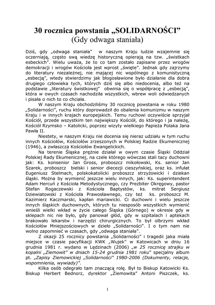 30 rocznica powstania „SOLIDARNOŚCI” (Gdy odwaga staniała) Dziś, gdy „odwaga staniała” w naszym Kraju ludzie wzajemnie się oczerniają, często swą wiedzę historyczną opierają na tzw. „świstkach esbeckich”. Wielu uważa, że to co tam zostało zapisane przez wrogów demokracji i wrogów Kościoła jest wprost „święte”. Jednak gdy zajrzymy do literatury niezależnej, nie mającej nic wspólnego z komunistyczną „esbecją”, wtedy stwierdzimy jak błogosławione było działanie dla dobra drugiego człowieka tych, których dziś się albo niedocenia, albo też na podstawie „literatury świstkowej” obwinia się o współpracę z „esbecją”, która w owych czasach nachodziła wszystkich, wbrew woli odwiedzanych i pisała o nich to co chciała. W naszym Kraju obchodziliśmy 30 rocznicę powstania w roku 1980 „Solidarności”, ruchu który doprowadził do obalenia komunizmu w naszym Kraju i w innych krajach europejskich. Temu ruchowi oczywiście sprzyjał Kościół, przede wszystkim ten największy Kościół, do którego i ja należę, Kościół Rzymsko – Katolicki, poprzez wizyty wielkiego Papieża Polaka Jana Pawła II. Niestety, w naszym Kraju nie docenia się nieraz udziału w tym ruchu innych Kościołów, Kościołów zrzeszonych w Polskiej Radzie Ekumenicznej (1946), a zwłaszcza Kościołów Ewangelickich. Na terenie Śląska prężnie działał w owym czasie Śląski Oddział Polskiej Rady Ekumenicznej, na czele którego wówczas stali tacy duchowni jak: Ks. konsenior Jan Gross, proboszcz mikołowski, Ks. senior Jan Szarek, proboszcz bielski i senior diecezji cieszyńskiej, oraz ks. infułat Eugeniusz Stelmach, polskokatolicki proboszcz strzyżowicki i dziekan śląski. Można by wymienić jeszcze wielu innych, jak: Ks. superintendent Adam Hercuń z Kościoła Metodystycznego, czy Prezbiter Okręgowy, pastor Stefan Rogaczewski z Kościoła Baptystów, ks. mitrat Sergiusz Dziewiatowski z Kościoła Prawosławnego, czy też ks. proboszcz M. Kazimierz Kaczmarski, kapłan mariawicki. Ci duchowni i wielu jeszcze innych śląskich duchownych, których tu niesposób wszystkich wymienić wnieśli wielki wkład w życie całego Śląska (Górnego) w okresie gdy w sklepach nic nie było, gdy panował głód, gdy w szpitalach i aptekach brakowało lekarstw i narzędzi chirurgicznych. To był olbrzymi wkład Kościołów Mniejszościowych w dzieło „Solidarności”. I o tym nam nie wolno zapomnieć w czasach, gdy „odwaga staniała”. Z okazji 25 rocznicy powstania „Solidarności” i tragedii jaka miała miejsce w czasie pacyfikacji KWK „Wujek” w Katowicach w dniu 16 grudnia 1981 r. wydano w Lędzinach (2006) „w 25 rocznicę strajku w kopalni „Ziemowit” w dniach 15-24 grudnia 1981 roku” specjalny album pt. „Zapisy Ziemowickiej „Solidarności” 1980-2006 (Dokumenty, relacje, wspomnienia, wywiady)”. Kilka osób odegrało tam znaczącą rolę. Był to Biskup Katowicki Ks. Biskup Herbert Bednorz, dyrektor „Ziemowita” Antoni Piszczek, ks. 1 proboszcz Józef Przybyła, Komisarz Wojskowy pułkownik Jerzy Szewełło, Zygfryd Ścierski i wielu, wielu innych, także ewangelików (Ernst – Paweł Centner, Józef Centner). Ale wśród zasłużonych było także dwóch księży ewangelickich: miejscowy ks. proboszcz Karol Bauman i mikołowski proboszcz ks. Jan Gross. To wtedy, gdy brakowało środków spożywczych, chemicznych, lekarstw i odzieży, gdy wielu zostało internowanych, wielu prześladowanych bez środków do życia, ci dwaj ewangeliccy księża wraz z księżmi katolickimi nie lękali się przyjść potrzebującym z pomocą chociaż przyłapani na tym, że pomagają internowanym i ich rodzinom mogli za to słono zapłacić, nawet pozbawieniem wolności. Żona ks. Karola Baumana - Wanda przepłaciła to życiem. Ale najlepiej będzie jeżeli o tym opowiedzą autorzy wspomnianej księgi pamiątkowej. Jeden z współautorów na stronie 161 tak pisze: „Stan przygnębienia panował na całym Górnym Śląsku po tragicznych wydarzeniach na „Wujku”, „Manifeście”, „Piaście”, „Ziemowicie” i innych miejscach w całym kraju. Ci, którzy byli jeszcze na wolności, działacze „Solidarności” oraz ludzie wielkich serc i nieustraszeni, zaczęli organizować pomoc dla rodzin więzionych, internowanych. Na „Ziemowicie” zabrakło wspaniałych i nieustraszonych o dobrych sercach, ci nieustraszeni zaczynają organizować pomoc dla tych rodzin oraz samych więźniów i internowanych, ludzie spontanicznie z dobroci swych serc, choć im samym brakowało, przyłączyli się do pomocy. Okoliczne parafie, tak katolickie, jak i ewangelickie, spieszyły z pomocą. Była to zasługa wspaniałych księży, pracujących w tych parafiach.” (Ks. Stanisław Szarlej, ks. Józef Przybyła, ks. Karol Bauman, ks. Jan Gross). O grudniu 1981 r. i o późniejszym okresie tak pisze wspomniany Ernst – Paweł Centner na stronie 228: „Dobiła nas informacja z kopalni Wujek. Władza i Zomowcy zastrzelili górników. A wśród zabitych jest nasz krewny – Joachim Gnida.” Był on także krewnym żony księdza ewangelickiego z Mikołowa ks. Jana Grossa. Rodzice zabitego górnika pochodzili z Orzesza, skąd też pochodziła teściowa ks. Jana Grossa. Zamieszkali w Tychach. Zastrzelony młody górnik był jednym z czworga rodzeństwa (ur. 1952), ożenił się w Halembie w rodzinie ewangelickiej, był członkiem Rady Parafialnej w Wirku, służył wielu ludziom swoim samochodem, był uczciwym, pracowitym, religijnym ewangelikiem, ojcem dwuletniej córeczki. W dniu pacyfikacji kopalni został trafiony kulą w głowę. Leżał w Klinice w Ochojcu nieprzytomny. Parafia w Wirku (ks. Tadeusz Szurman) i parafia mikołowska modliły się za niego, był operowany, ale w dniu 2 stycznia 1982 r. zakończył swoje młode życie jak 8 jego kolegów (a nie 25 stycznia jak podają niektóre strony internetowe!) w wieku 28 lat. Pan Centner tak opis