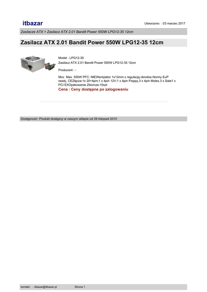 itbazar Utworzono : 03 marzec 2017 Zasilacze ATX > Zasilacz ATX 2.01 Bandit Power 550W LPG12-35 12cm Zasilacz ATX 2.01 Bandit Power 550W LPG12-35 12cm Model : LPG12-35 Zasilacz ATX 2.01 Bandit Power 550W LPG12-35 12cm Producent : Moc Max. 550W PFC: NIEWentylator 1x12mm z regulacją obrotów.Normy EuP ready, CEZłącza:1x 20+4pin;1 x 4pin 12V;1 x 4pin Floppy,3 x 4pin Molex,3 x Sata1 x PCI EXOpakowanie Zbiorcze:10szt Cena : Ceny dostępne po zalogowaniu Dostępność: Produkt dostępny w naszym sklepie od 26 listopad 2010 kontakt : - [email protected] Strona 1
