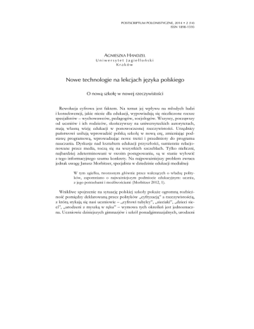 POSTSCRIPTUM POLONISTYCZNE, 2014 • 2 (14) ISSN 1898-1593 AGNIESZKA HANDZEL Uniwersytet Jagielloński Kraków Nowe technologie na lekcjach języka polskiego O nową szkołę w nowej rzeczywistości Rewolucja cyfrowa jest faktem. Na temat jej wpływu na młodych ludzi i konsekwencji, jakie niesie dla edukacji, wypowiadają się niezliczone rzesze specjalistów – wychowawców, pedagogów, socjologów. Wszyscy, począwszy od uczniów i ich rodziców, skończywszy na uniwersyteckich autorytetach, mają własną wizję edukacji w ponowoczesnej rzeczywistości. Urzędnicy państwowi usiłują wprowadzić polską szkołę w nową erę, zmieniając podstawę programową, wprowadzając nowe treści i przedmioty do programu nauczania. Dyskusje nad kształtem edukacji przyszłości, sumiennie relacjonowane przez media, toczą się na wszystkich szczeblach. Tylko nieliczni, najbardziej zdeterminowani w swoim postępowaniu, są w stanie wyłowić z tego informacyjnego szumu konkrety. Na najpoważniejszy problem zwraca jednak uwagę Janusz Morbitzer, specjalista w dziedzinie edukacji medialnej: W tym zgiełku, tworzonym głównie przez walczących o władzę polityków, zapomniano o najważniejszym podmiocie edukacyjnym: uczniu, z jego potrzebami i możliwościami (Morbitzer 2012, 1). Wnikliwe spojrzenie na sytuację polskiej szkoły pokaże ogromną rozbieżność pomiędzy deklarowaną przez polityków „cyfryzacją” a rzeczywistością, z którą stykają się nasi uczniowie – „cyfrowi tubylcy”, „sieciaki”, „dzieci sieci”, „urodzeni z myszką w ręku” – wymowa tych określeń jest jednoznaczna. Uczniowie dzisiejszych gimnazjów i szkół ponadgimnazjalnych, urodzeni 206 POSTSCRIPTUM POLONISTYCZNE, 2014 • 2 (14) po 1990 roku, to tzw. pokolenie „C” – computerized, connected, always clicking – skomputeryzowani, podłączeni, zawsze klikający. Internet stanowi dla nich naturalne środowisko, w którym funkcjonują – poszukują informacji, kupują, zawierają i utrzymują przyjaźnie (Morbitzer 2012, 2). Jak sami piszą w – stanowiącym deklarację ich tożsamości – Manifeście Dzieci Sieci: Sieć nie jest dla nas czymś zewnętrznym wobec rzeczywistości, ale jej elementem. My nie korzystamy z sieci, my w niej i z nią żyjemy (Manifest Dzieci Sieci, 2012). Tymczasem szkoła wydaje się nie dostrzegać istotnych przemian społeczno-kulturowych, które wynikają z tak głębokiej zmiany w postrzeganiu rzeczywistości. Mimo usilnych prób reformy, wprowadzania kolejnych zmian w podstawie programowej, współczesna szkoła nadal ma niewielki kontakt z rzeczywistością. Przyczyną takiego stanu rzeczy może być fakt, że największy wpływ na kształt przyszłej szkoły ciągle mają przedstawiciele pokolenia „cyfrowych imigrantów”, dla których rzeczywistość „dzieci sieci” jest niezrozumiała. Dlatego, jak pisze Bogusław Śliwerski: Polska szkoła jest offline, a uczniowie są online. Ten paradoks polega na tym, że szkoła utrwala dziś już przestarzały model klasowo-lekcyjny. (…) szkodliwy i dla ucznia, i nauczyciela, ponieważ wpycha ich w sztuczny – nieprzystający do przyspieszonego rozwoju młodych ludzi – schemat. (…) Szkoła powinna być nie tylko środowiskiem edukacyjnym, ale także siecią komunikacji i miejscem treningu kulturowego dla ucznia i jego rodziców (Śliwerski 2012, 24). W obliczu nieskuteczności rozwiązań systemowych inicjatywa przemiany oblicza edukacji powinna zatem pochodzić od najbardziej zainteresowanych – uczniów, ich rodziców oraz (a raczej przede wszystkim) nauczycieli. Pierwszy krok na drodze do „nowej szkoły”, która wyposaży uczniów w umiejętności przydatne w otaczającej ich rzeczywistości, musi stanowić uświadomienie sobie zmian, które zaszły w ciągu ostatnich kilku lat w sposobie zdobywania i przechowywania wiedzy. Postępujący rozwój internetu sprawił, że w dzisiejszych czasach informacja stanowi najważniejsze bogactwo, a ułatwiony dostęp do jej nieskończonych zasobów sprawia, że to zdolności sprawnego wyszukiwania, weryfikacji i krytycznego odbioru stanowią dziś umiejętności kluczowe. Zmienił się również przebieg procesu uczenia się. Dziś trwa on przez całe życie – szybka dezaktualizacja posiada- AGNIESZKA HANDZEL: Nowe technologie na lekcjach języka polskiego 207 nej wiedzy oraz napływ nowych informacji sprawiają, że każdy człowiek musi umieć samodzielnie i aktywnie pracować nad doskonaleniem swoich talentów. W świecie zdominowanym przez nowe technologie dostęp do wiedzy jest dziecinnie prosty – przekonują o tym uczniowie w błyskawicznym tempie wyszukujący informacje w sieci za pomocą telefonów komórkowych, które zawsze mają przy sobie. Zapamiętywanie dat i wydarzeń okazuje się bezcelowym zajęciem w obliczu możliwości przechowywania terabajtów danych w urządzeniu o rozmiarach małego notesu. Uczniowie przychodzący do szkoły mają wobec nauczycieli zupełnie inne oczekiwania niż jeszcze kilka lat temu. Dostęp do informacji jest równie łatwy dla wszystkich – szkoła straciła monopol na przekazywanie wiedzy. Nauczyciele powinni zatem na nowo przemyśleć i zdefiniować swoją rolę w procesie nauczania. Jak przekonuje Morbitzer, w dzisiejszych czasach dobry nauczyciel to nie ten, kto dysponuje większym zasobem informacji, ale ten, który więcej z tych samych informacji rozumie, potrafi je lepiej zinterpretować, ma więcej wątpliwości i refleksyjności (Morbitzer 2012, 9). Warto dodać – dobry nauczyciel to ten, kto potrafi również w swoich uczniach obudzić wątpliwości, zasiać głód nowych informacji, wzbudzić entuzjazm do samodzielnego poszukiwania i uczenia się przez całe życie. Najważniejsza zmiana będzie zatem dotyczyć miejsca nauczyciela w procesie kształcenia. Nie może już rościć sobie praw do bycia autorytetem, ale powinien świadomie zająć miejsce obok ucznia, być jednym z element