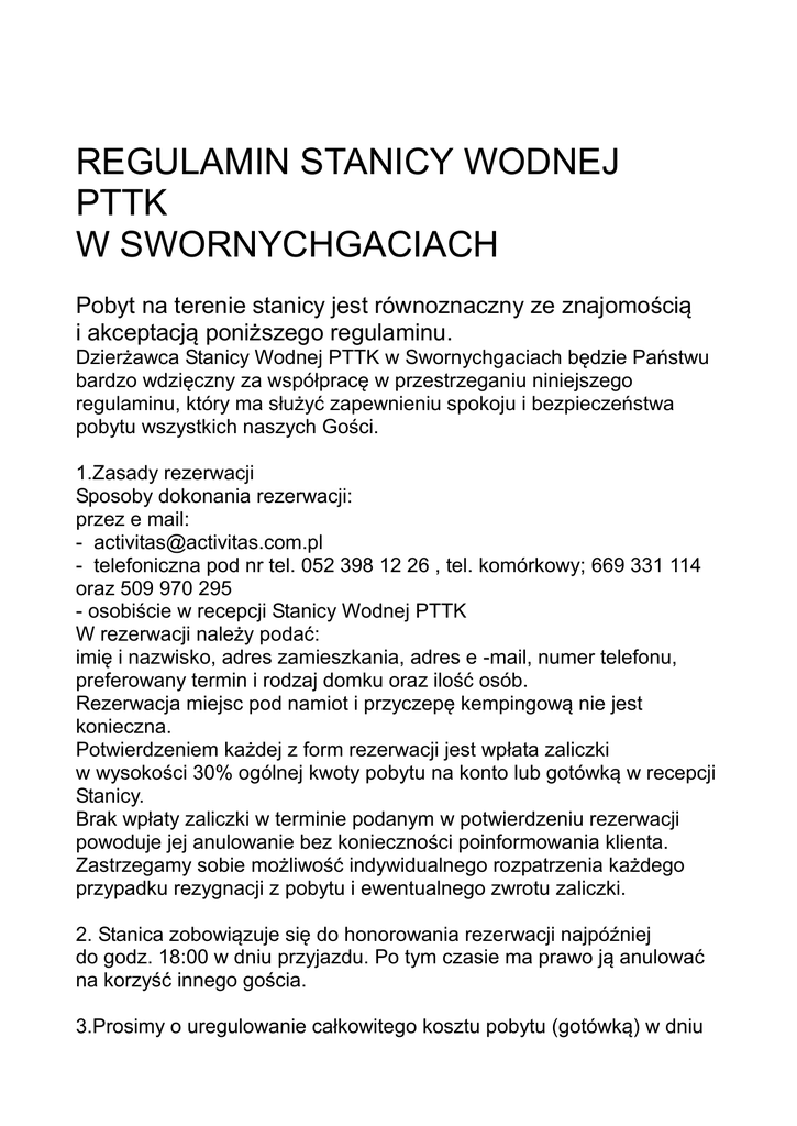REGULAMIN STANICY WODNEJ PTTK W SWORNYCHGACIACH Pobyt na terenie stanicy jest równoznaczny ze znajomością i akceptacją poniższego regulaminu. Dzierżawca Stanicy Wodnej PTTK w Swornychgaciach będzie Państwu bardzo wdzięczny za współpracę w przestrzeganiu niniejszego regulaminu, który ma służyć zapewnieniu spokoju i bezpieczeństwa pobytu wszystkich naszych Gości. 1.Zasady rezerwacji Sposoby dokonania rezerwacji: przez e mail: - [email protected] - telefoniczna pod nr tel. 052 398 12 26 , tel. komórkowy; 669 331 114 oraz 509 970 295 - osobiście w recepcji Stanicy Wodnej PTTK W rezerwacji należy podać: imię i nazwisko, adres zamieszkania, adres e -mail, numer telefonu, preferowany termin i rodzaj domku oraz ilość osób. Rezerwacja miejsc pod namiot i przyczepę kempingową nie jest konieczna. Potwierdzeniem każdej z form rezerwacji jest wpłata zaliczki w wysokości 30% ogólnej kwoty pobytu na konto lub gotówką w recepcji Stanicy. Brak wpłaty zaliczki w terminie podanym w potwierdzeniu rezerwacji powoduje jej anulowanie bez konieczności poinformowania klienta. Zastrzegamy sobie możliwość indywidualnego rozpatrzenia każdego przypadku rezygnacji z pobytu i ewentualnego zwrotu zaliczki. 2. Stanica zobowiązuje się do honorowania rezerwacji najpóźniej do godz. 18:00 w dniu przyjazdu. Po tym czasie ma prawo ją anulować na korzyść innego gościa. 3.Prosimy o uregulowanie całkowitego kosztu pobytu (gotówką) w dniu przyjazdu. Obowiązuje dokonanie formalności meldunkowych w recepcji po przedłożeniu dowodu osobistego lub paszportu niezwłocznie po przybyciu do Stanicy. Otrzymany paragon fiskalny lub faktura uprawnia do przebywania na terenie stanicy. W momencie wcześniejszego wyjazdu nie zwracamy niewykorzystanej części zapłaty. Dopuszczamy możliwość indywidualnego rozpatrzenia każdego przypadku i ewentualnego zwrotu należności. 4.Doba hotelowa rozpoczyna się od godz. 14:00 w dniu przyjazdu, a kończy się o godz. 11:00 w dniu wyjazdu. Gości kończących pobyt uprzejmie prosimy o wymeldowanie się do tej godziny. 5.Stanica uwzględnia życzenia przedłużenia pobytu w miarę posiadanych możliwości. 6.Stanica świadczy usługi zgodnie ze swoim standardem. W przypadku zastrzeżeń dotyczących jakości usług prosimy o jak najszybsze zgłoszenie ich do recepcji, co umożliwi nam niezwłoczną reakcję. 7.Pracownicy Stanicy mają obowiązek zapewnić: warunki pełnego i nieskrępowanego wypoczynku Gościa bezpieczeństwo pobytu, w tym zachowanie tajemnicy informacji o Gościu profesjonalną i uprzejmą obsługę wykonywanie niezbędnych napraw, zgłaszanych przez Gościa, tylko w jego obecności 8.Obsługa zastrzega sobie prawo do nie wpuszczania na teren Stanicy osób pod wpływem alkoholu, zachowujących się nieodpowiednio oraz prawo do usunięcia z campingu osób nie przestrzegających niniejszego regulaminu. Stanica może odmówić przyjęcia Gościa, który podczas poprzedniego pobytu rażąco naruszył regulamin Stanicy wyrządzając szkodę w mieniu Stanicy, Gości lub szkodę na osobie Gościa, pracownika Stanicy lub innych osób przebywających w Stanicy albo też w inny sposób zakłócił spokojny pobyt Gości lub funkcjonowania obiektu. 9.Gość Stanicy ponosi odpowiedzialność materialną za wszelkiego rodzaju uszkodzenia lub zniszczenia przedmiotów wyposażenia i urządzeń technicznych Stanicy powstałe z jego winy oraz winy odwiedzających go osób. 10.Samowolna zmiana domku, bez zgody pracownika Ośrodka jest niedozwolona. 11.Za klucz od domku odpowiada osoba wynajmująca domek. 12.Wynajmujący domek parkuje swój samochód przy wynajętym domku lub ogólnodostępnym parkingu. 13.Gość zobowiązany jest do utrzymania porządku w wynajmowanym domku i jego pobliżu. 14.W domkach kempingowych palenie tytoniu nie jest dozwolone. 15.Zabrania się korzystania z pościeli niezgodnie z jej przeznaczeniem, np. używanie koców do leżenia na trawie. 16.Ze względu na bezpieczeństwo przeciwpożarowe i osobiste gości przebywających w domkach zabrania się: rzucać niedopałków papierosów i zużytych zapałek do kosza na odpadki przechowywać w domku materiałów łatwopalnych, żrących lub wydzielających przykrą woń. 17.Przed wyjściem z domku lub ułożeniem się do snu należy pamiętać o:zakręceniu kranów, zamknięciu lub unieruchomieniu okien, zamknięciu drzwi, wygaszeniu świateł, wyłączeniu termy, kuchenki elektrycznej i innych urządzeń elektrycznych. 18.Stanica nie ponosi odpowiedzialności za rzeczy wartościowe pozostawione w przyczepach campingowych, caravaningowych, namiotach i domkach. 19.Stanica nie ponosi odpowiedzialności za uszkodzenie lub utratę samochodu lub innego pojazdu należącego do Gościa. 20.Gość Stanicy nie może przekazywać domku campingowego, namiotu, przyczep campingowych osobom trzecim, nawet jeśli nie upłynął okres, za który uiścił należną za pobyt opłatę. 21.Cisza nocna obowiązuje od godz. 22:00 do godz. 6:00 następnego dnia. Osoby nie zameldowane w Stanicy nie mogą przebywać na jego terenie po godz. 22:00. 22.Zezwalamy na pobyt na naszym campingu zwierząt domowych. Właściciele zobowiązani są do posiadania aktualnej książeczki szczepień swojego czworonoga, sprzątania nieczystości. 23.Zabrania się samowolnego wycinania gałęzi, kopania dołów, oznaczania miejsc itp. Zakazuje się rozwieszania sznurków na bieliznę między drzewami oraz wystawiania mebli i wyposażenia domku poza jego obręb lub obręb jego werandy. 24.Ze względu na zagrożenie pożarowe ognisko można rozpalać tylko w wyznaczonym miejscu. Zezwala się na używanie grillów turystycznych pod domkami lub na polu campingowym. Zużyty węgiel z grilla najlepiej opróżnić w miejscu na ognisko. 25.Zmotoryzowani Goście poruszający się po terenie campingu zobowiązani są zachować szczególną ostrożność. Na terenie Stanicy obowiązuje ograniczona możliwość poruszania się poj
